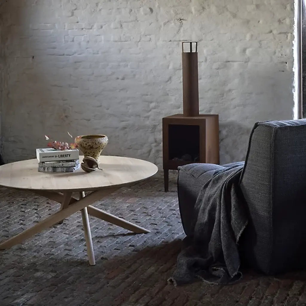 Add a clean and smooth surface to the décor of your modern home with the Oak Mikado Round Coffee Table from Ethnicraft. The construction stands out in the room made of solid and natural wood. The wide surface provides ample room for a variety of objects and space for meals and snacks with family and friends. The set of legs underneath are set at sharp angles, creating a unique look that stands out in the space.