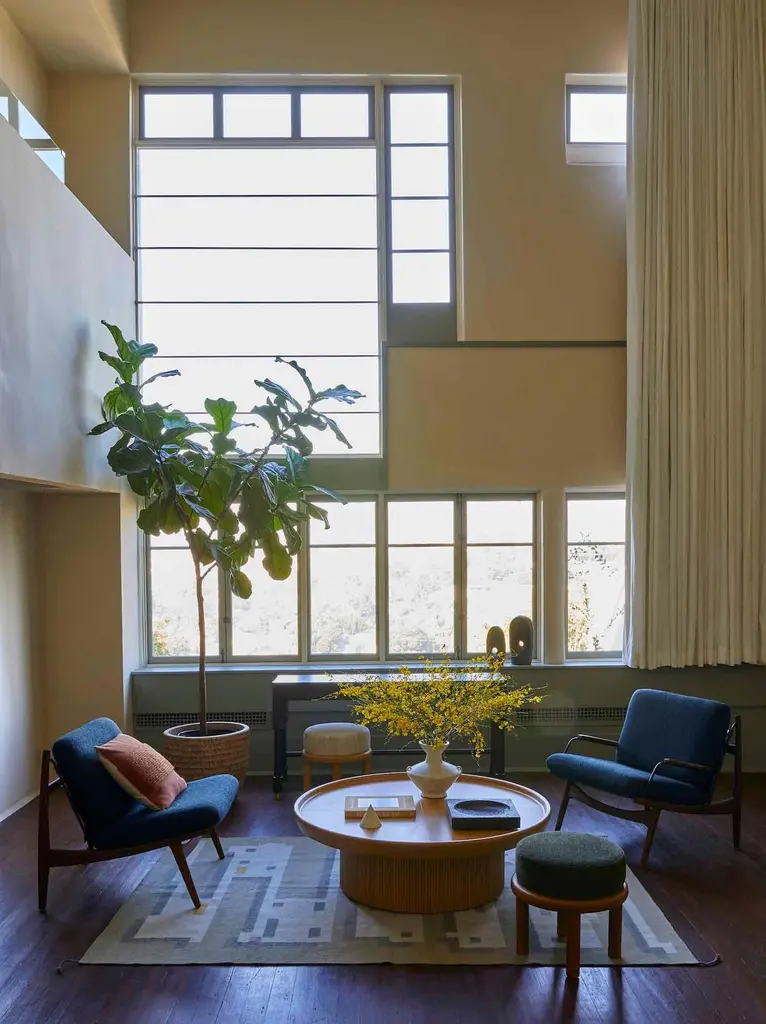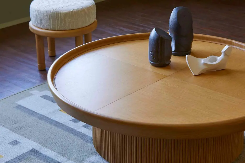 Oak Ojai Coffee Table by Lawson-Fenning. The Ojai coffee table features a round top with marquetry and a drum-shaped base with tambour details. Available in American walnut or white oak. The Lawson-Fenning Collection is designed and handmade in Los Angeles, California. Reach out to discover what options are currently in stock.