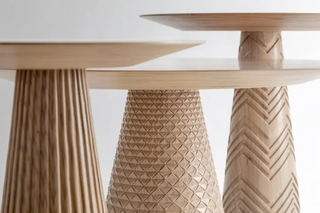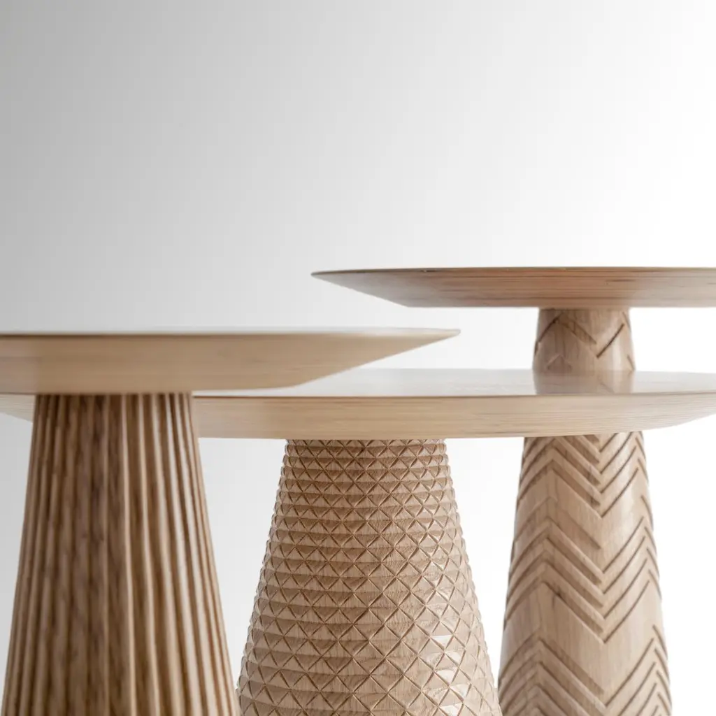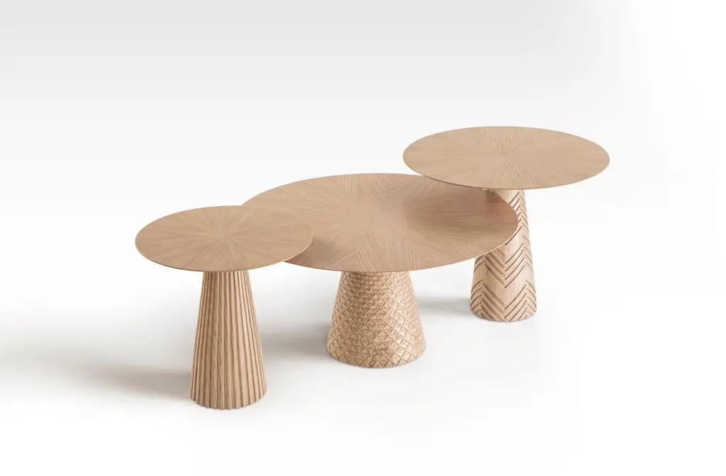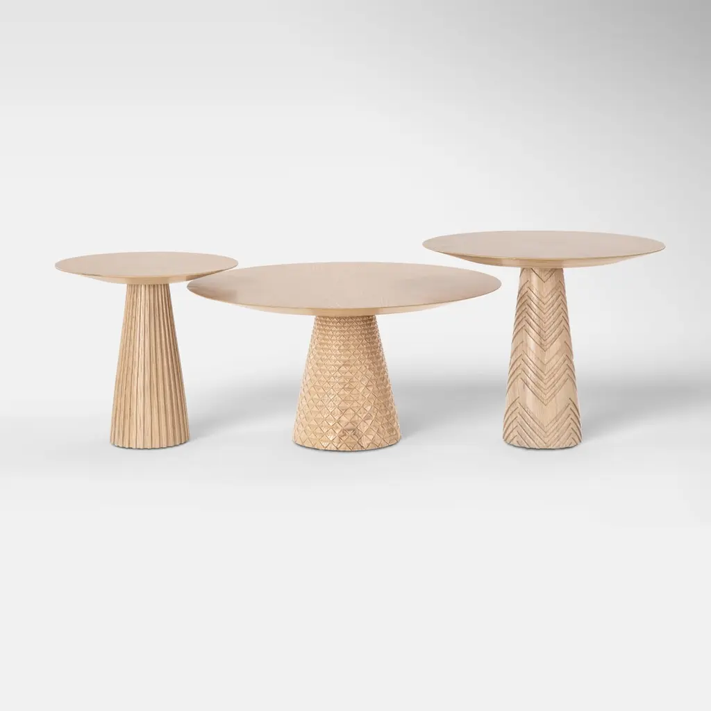Oak Wood Coffee Table Set Engraved with Patterns Inspired from Ancient Egypt. Inspired by Ancient Egypt motifs, our hand-carved Trinity coffee table is a beautiful representations of how nature harmoniously combines varying designs and fragrances. The radial placement of the veneer on the table tops are reminiscent of Lotus flowers opening up at sunrise while the engraved legs are inspired from the Nile, Papyrus and palm tree stems. Can be used together as a set or apart as side tables.