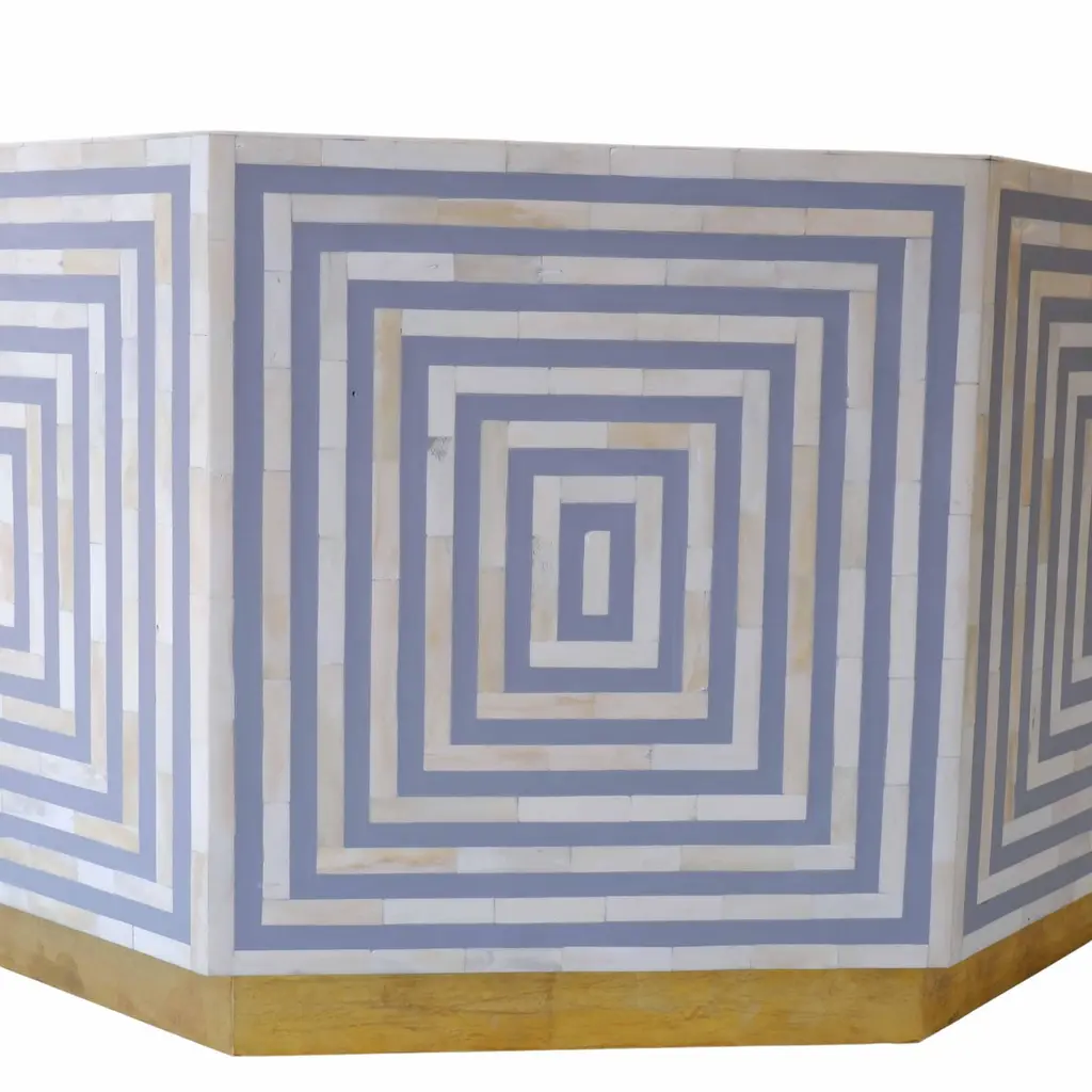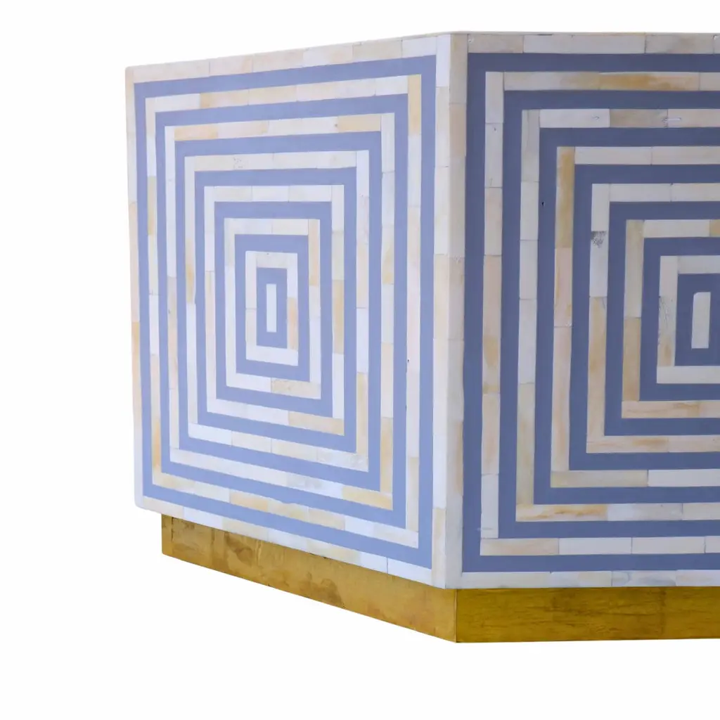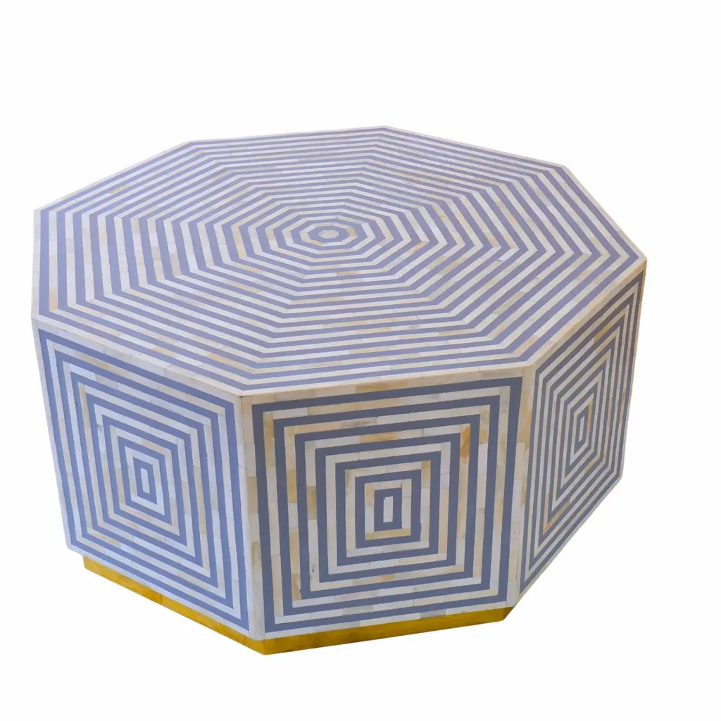 A grey octave coffee table with an eight-face bone inlay line design is a striking piece that seamlessly combines geometric elegance with intricate craftsmanship. The octagonal shape adds a unique twist to the traditional coffee table silhouette, creating visual interest from every angle.The bone inlay lines, arranged in an octagonal pattern on the tabletop, add a touch of geometric sophistication and texture to the piece. The subtle grey hue enhances the modern aesthetic while providing a neutral backdrop for the intricate design to shine.Complementing the tabletop is a base crafted from hammered brass sheet with an antique finish. This adds a warm, vintage-inspired touch to the table while also providing a sturdy and stylish foundation. The contrast between the aged brass and the sleek bone inlay creates a dynamic visual interplay, further elevating the table's overall appeal.This coffee table is not only a functional piece of furniture but also a stunning work of art that adds personality and character to any living space. Its unique design and exquisite craftsmanship make it a standout centerpiece that will be admired for years to come.Details: 1. Materials used: Wood, Hammered brass sheet and Bone.2. Wipe with a damp cloth. Avoid chemical-based cleaning solutions.3. Avoid exposure to direct sunlight.4. Made in India.5. As the piece is handmade please expect slight colour variations.6. The texture and finish of the furniture are natural.7. Manufacturing time: 2-3 weeks. Shipping time: 1-2 weeks.8. Ships from India.