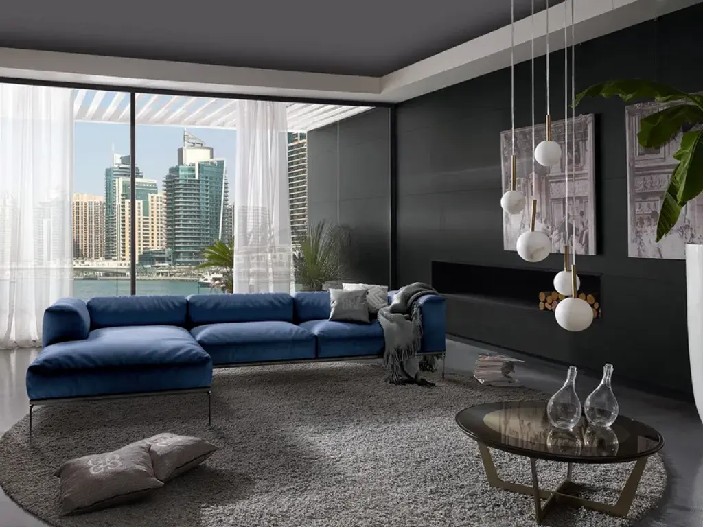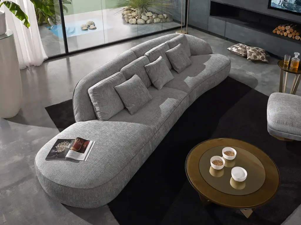 Round coffee table from the OCTOPUS collection with 03T matt champagne metal base, VT 01 laminated glass top.Bookcase with painted metal structure, glass shelves and drawers and containers made in solid wood from the OCTOPUS collection.