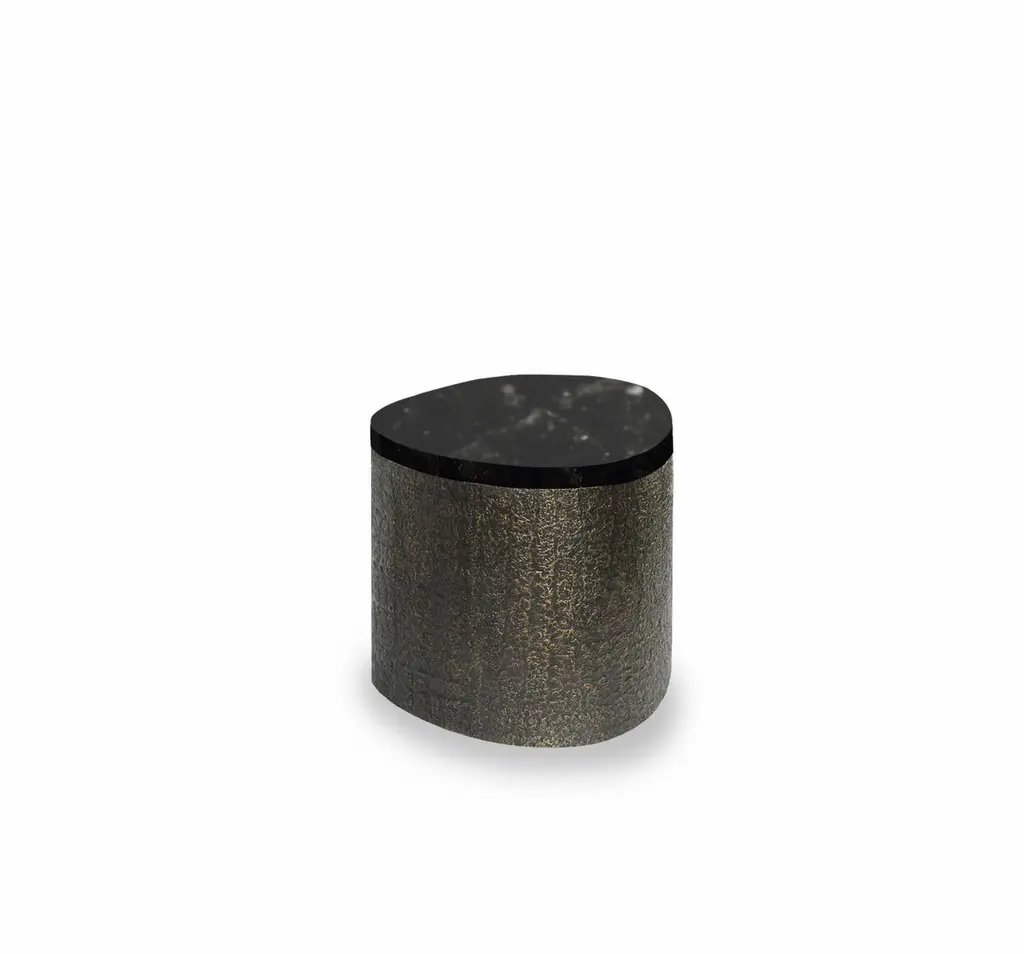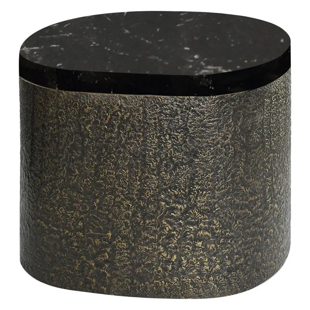 Organic form cocktail table with dark rock crystal top. Hammered antique brass base. Created by Phoenix Gallery, NYC.Custom size and metal finish upon request.