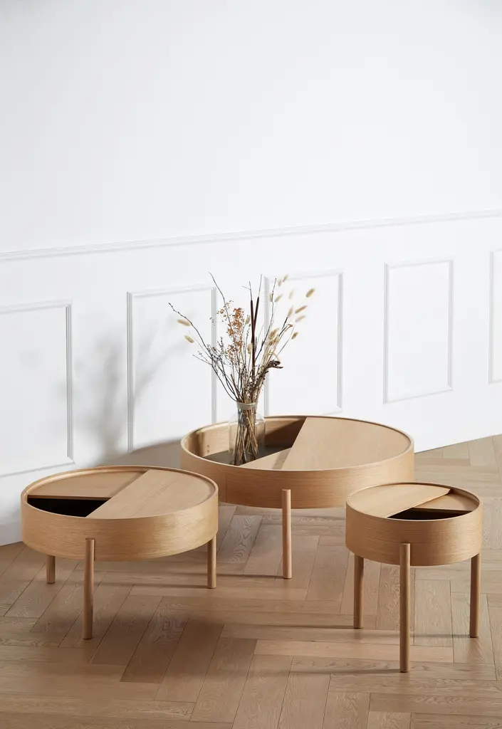 Oiled oak arc side table 66 by Ditte Vad and Julie BertrupMaterials: oak, nano laminateDimensions: D 66 x W 66 x H 38 cmAlso available in different sizes and materials: ash, oak, walnut, venner with solid ash/oak, walnut legs.The founders, Mia and Torben Koed, decided to put their 30 years of experience into a new project. It was time for a change and a new challenge. The challenge was to build an ambitious design brand from the ground up with high-quality materials and great attention to the little details. With a drive to create new originals, the WOUD collection is founded upon the idea to look ahead instead of looking back and share the love for honest design. Therefore, we are eager to discover and develop new ideas whether it being in form, function or choice of material. Julie Begtrup and Ditte Vad are two talented furniture and interior designers, both born in Denmark. The two designers started working together during their studies and found that they share the same aesthetic sense, view on materials and expressions in their designs. With a belief that designers have the opportunity and ability to improve and affect the surroundings, the duo aims to create honest, timeless and functional designs that allow a dynamic interaction between the design and its user. Their work is characterised by clean lines and graphical compositions inspired by the Nordic design philosophy. Exploring new materials, techniques and forms.The two friends worked on the Arc series during a period of time when they lived together. It started with sketches on paper and ended with a prototype made by hand. The Arc table invites its user to make use of the simple functionalities. The designers wanted to create a beautiful table series with space to hide your mess. the three- legged construction adds a playful and light touch to the geometric shaped design.