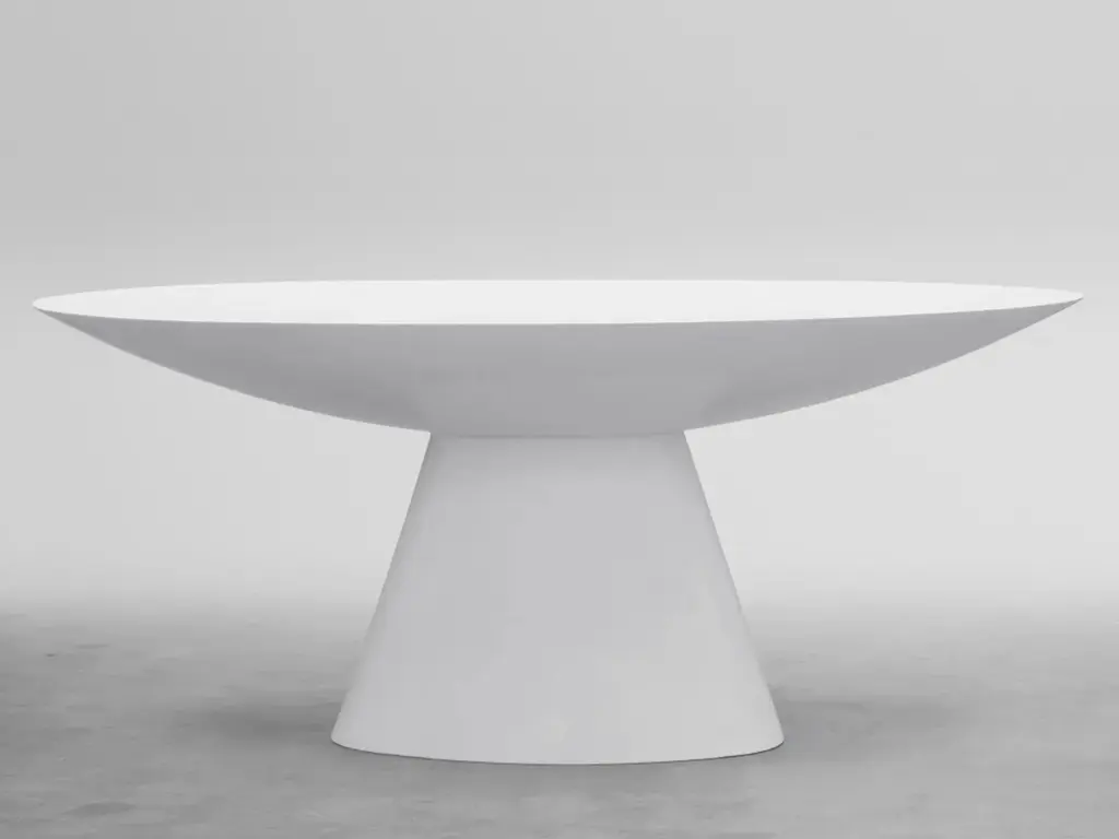 Slab coffee table by Imperfettolab 2020 Dimensions: 179 x 99 x H 74 Materials: Fibreglass Available in black and white. Pure geometry for this table that reveals an oval-shaped top. A spacious ellipse raised from a central base, for a creation that allows comfortable and welcoming seating around its perimeter. Perfect for the harmonious arrangement of convivial or business meetings. Imperfetto Lab Who we are ? We are a family. Verter Turroni, Emanuela Ravelli and our children Elia, Margherita and Eusebio. All together, we are separate parts and their expansion. The laboratory is in the care of Verter. from the sketch on paper he mixes materials, shapes and colours to the definition of the object. His intuitive and visionary research is performed with the complicity, recognition and practical support of his brother Erich. Emanuela is the voice of a vivid and silent work. She connects Imperfettolab with the other and with the rest of the world, respecting its nature and identity. She watches over its wholeness and authenticity. The playful spirit is entrusted to our children. They are the ones who test our works, certify their durability, functionality and enjoyment. We believe it is their expression, after all, that validates and makes our work universal. Since 1992, our thoughts and actions have moved, grown and taken shape in the land of Romagna. Between hills of cherry and olive trees, cultivated plains and piles of recyclable steel and iron. In between, the ancient Roman road via Emilia. A contrasting and mutating landscape that reflects in our furnishing sculptures. Ours is an open space, the times of art and life seamlessly merge.
