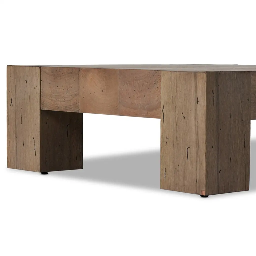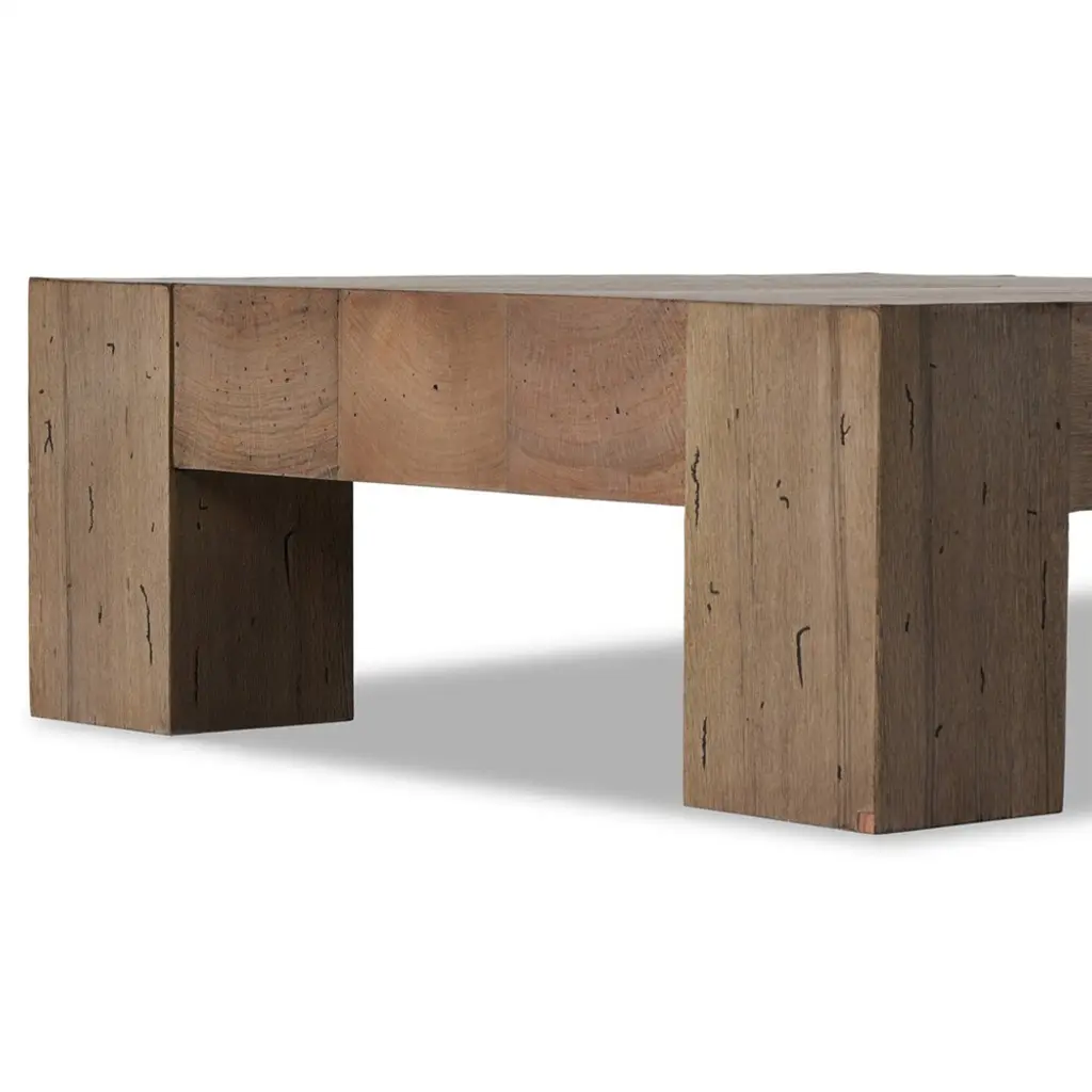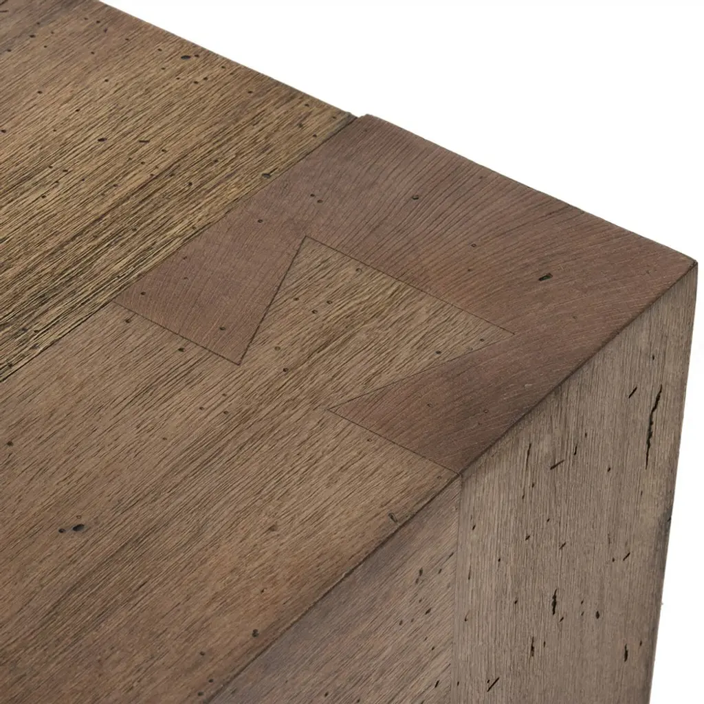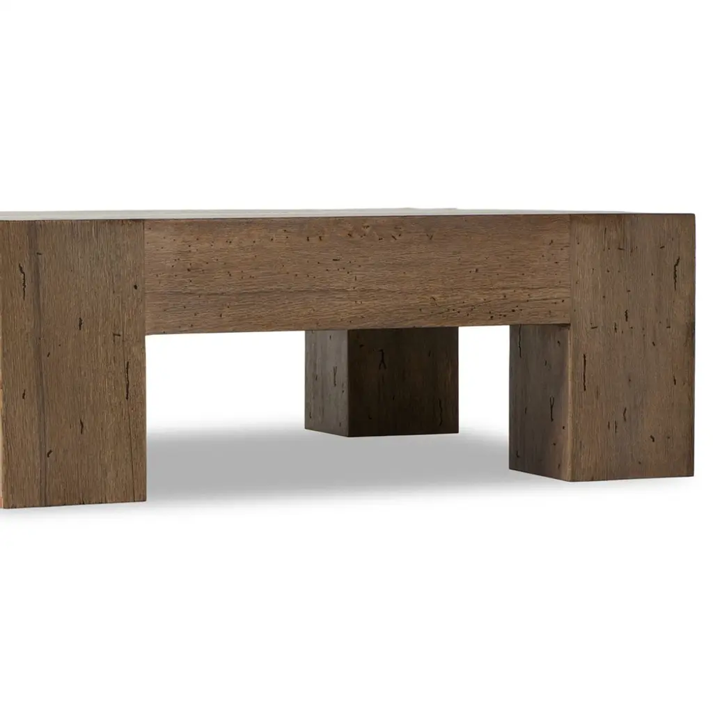 Crafted from thick-cut oak veneer and engineered hardwood, the Oliver coffee table features a brown faux rustic finish, bringing a charming touch to your living space. With a low profile, dramatic scale, and dovetail joinery detailing, this striking piece elevates the ordinary.