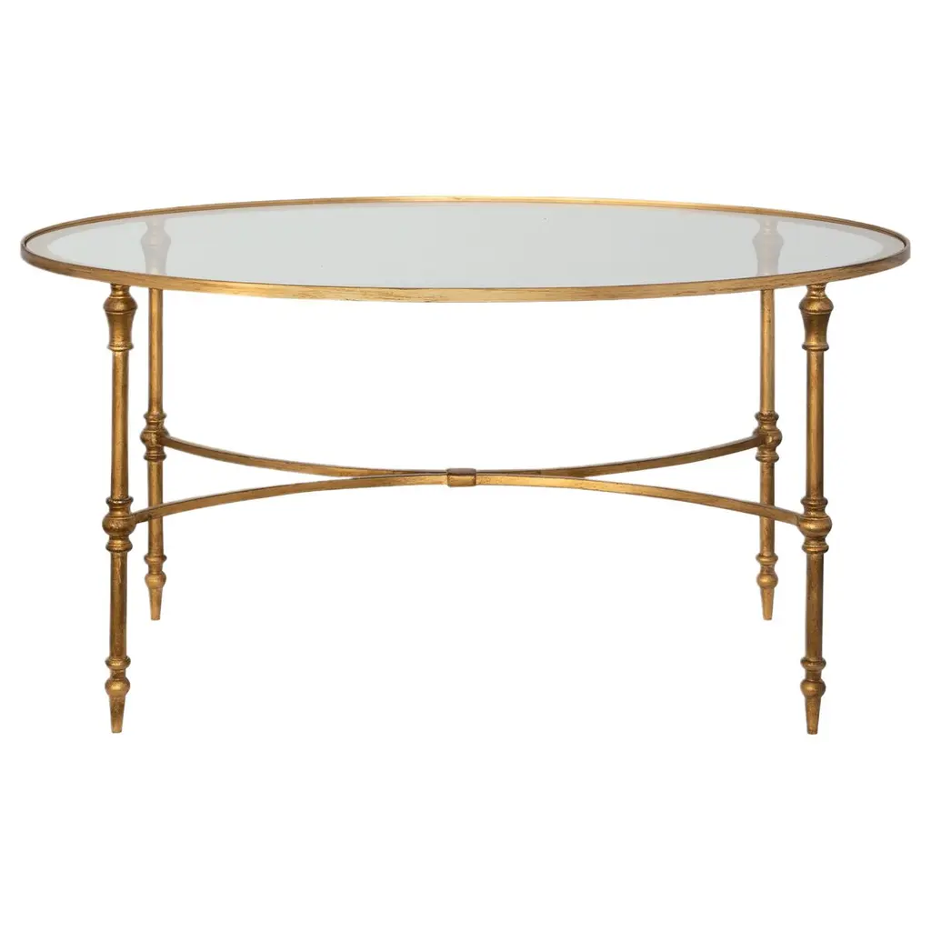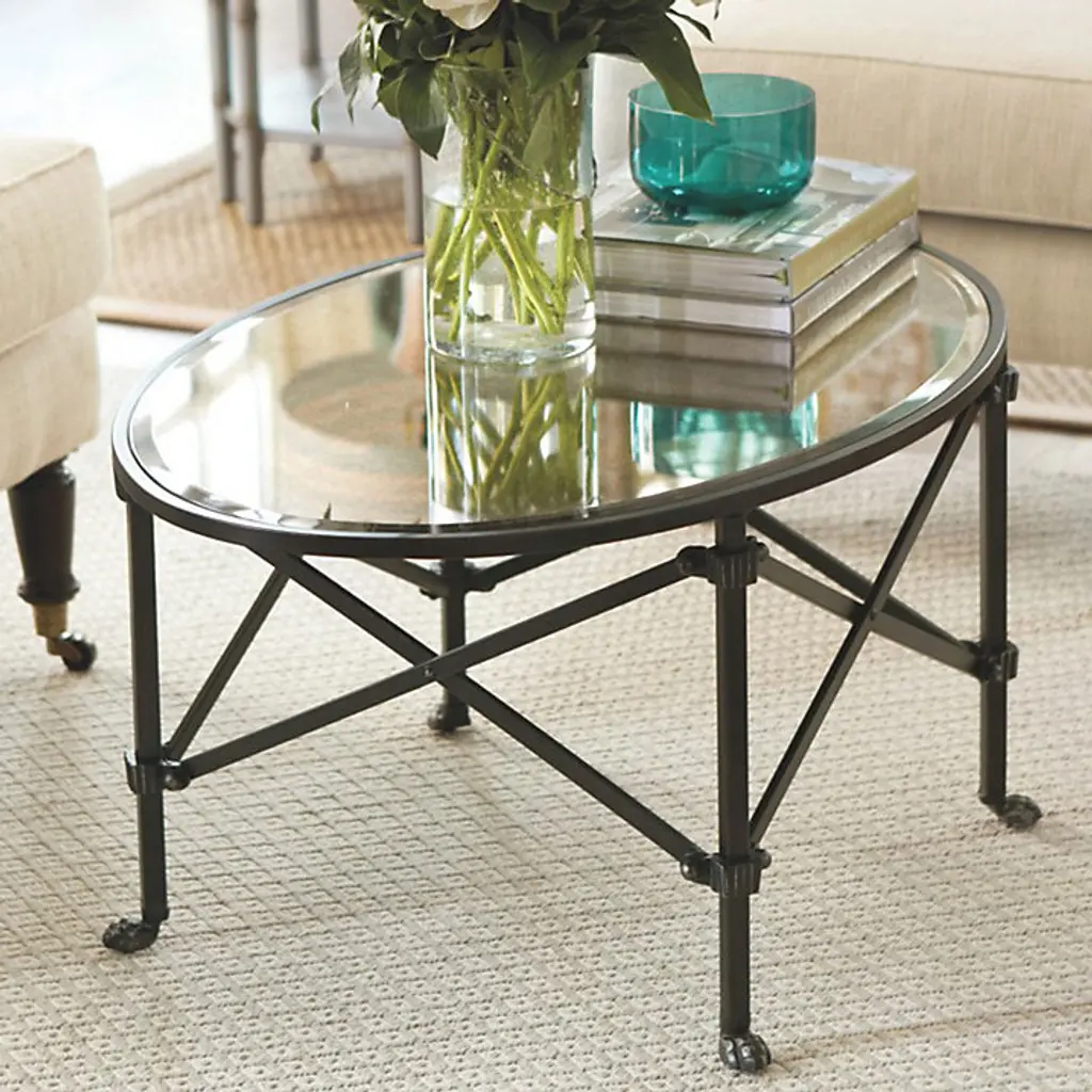 A stylish update on the classic French gueridon, this oval coffee table is crafted of metal with classic claw-footed legs, "X" stretchers and beveled mirror top. Olivia Coffee Table features: