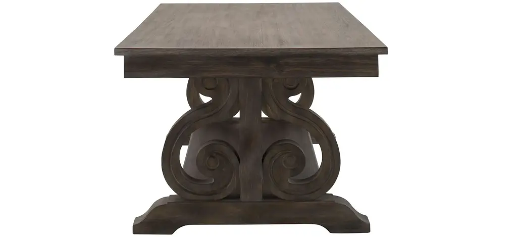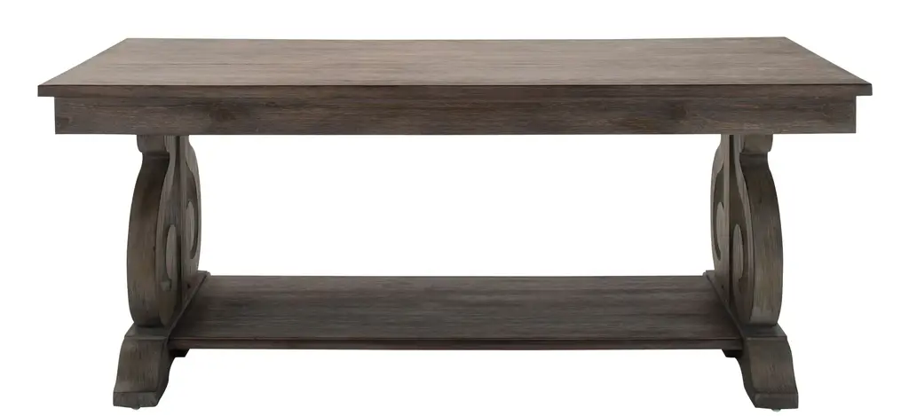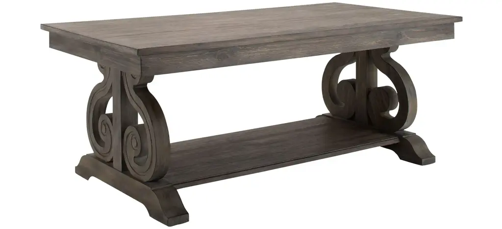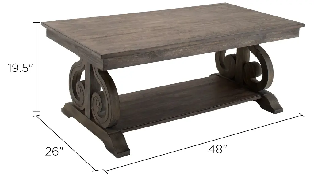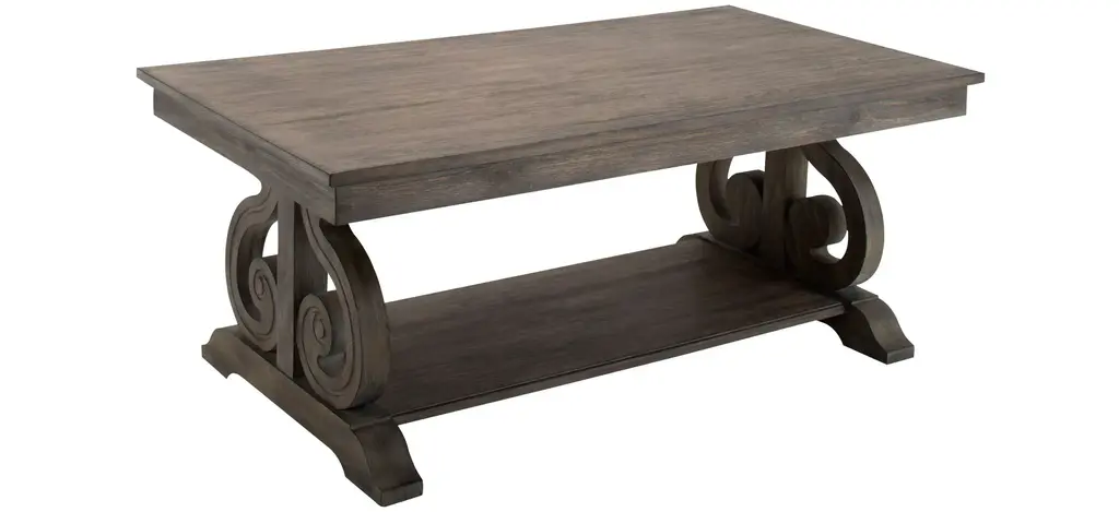 With its distressed finish and eye-catching scroll design, the Olivia cocktail table makes a stylishly casual and stunning addition to any room decor.