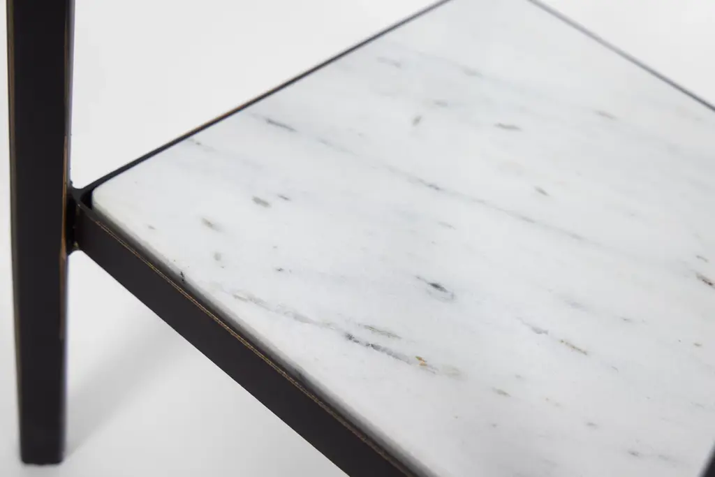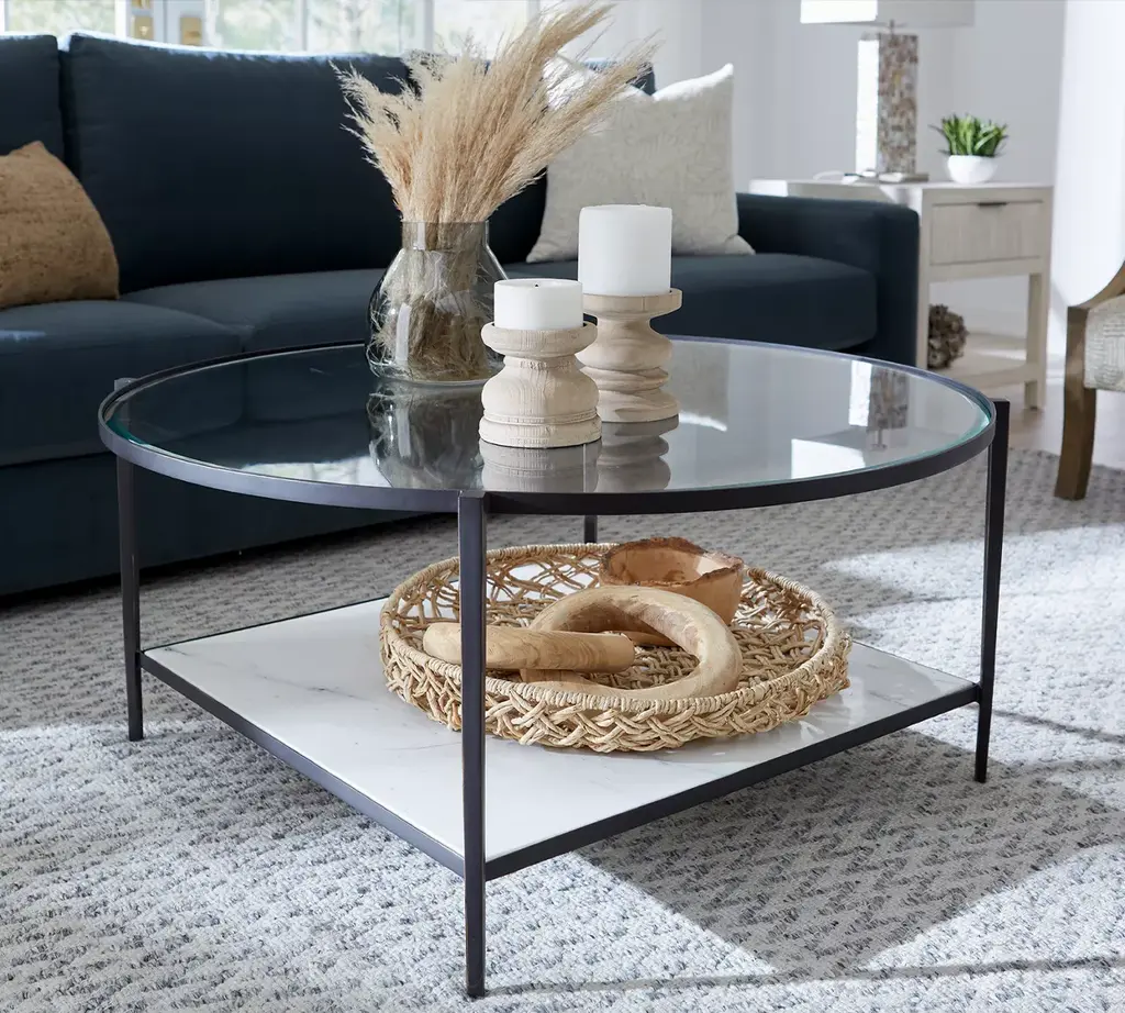 Elevate your living room with the modern, sleek design of our Olivia round coffee table. This round coffee table features an iron frame in a bronze finish with gold rub-through, as well as a glass top and white marble shelf.