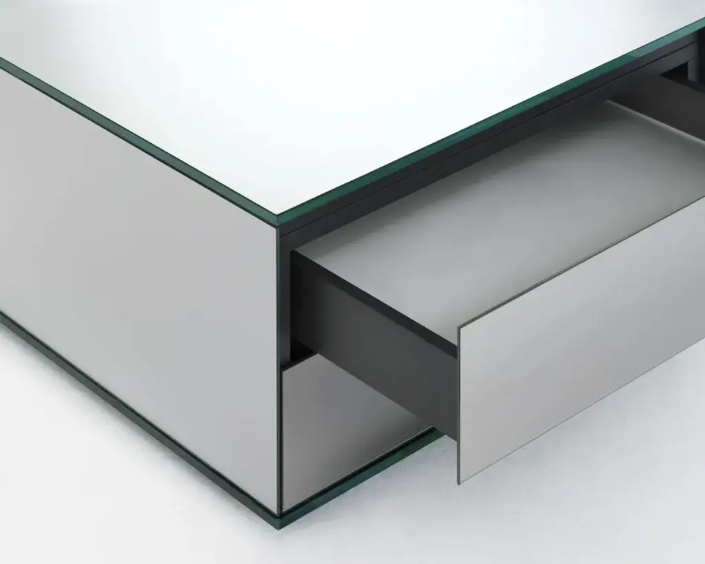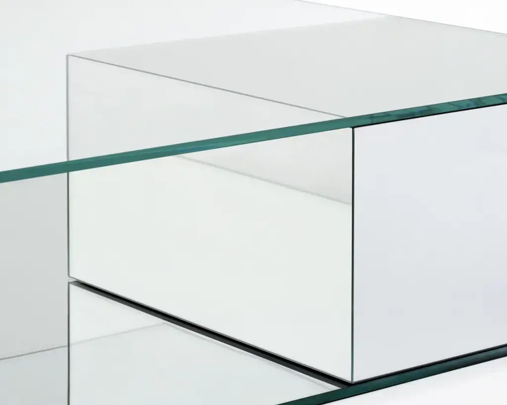OLLIE is a low coffee table with a 12 mm thick extra-clear tempered glass top and base.The top is cantilevered and supported by a chest of drawers with push-pull Blumotion drawers, covered in mirror panels joined at 45°.The base is fully mirror-silvered, while the top is silvered only where it meets the chest of drawers, remaining transparent at the overhanging part.A solid fastening system ensures stability and allows for the disassembly of the various components.
