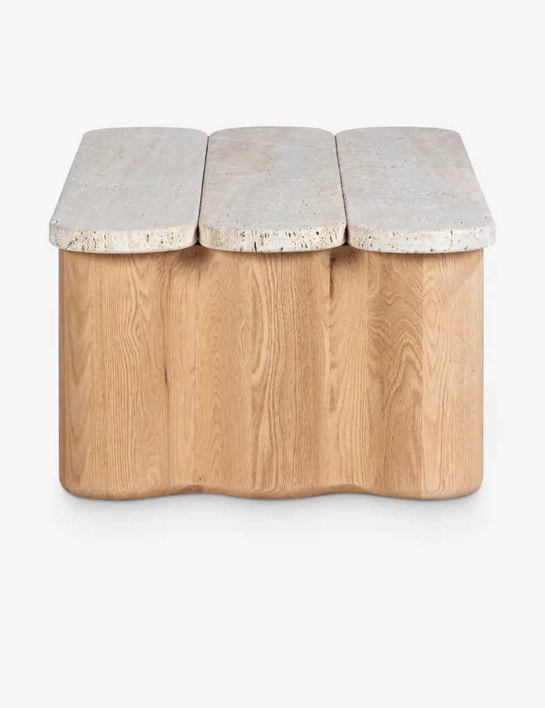 Make a sculptural statement in the middle of the room. The Ombeline coffee table pairs rounded travertine slabs with sturdy oak legs carved to echo the scalloped shape on top. We love the grounding impact this modern coffee table creates with its mix of natural grain warmth and stone.