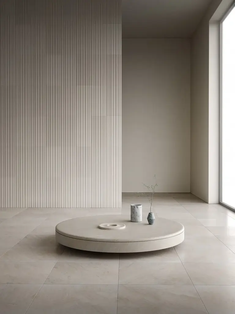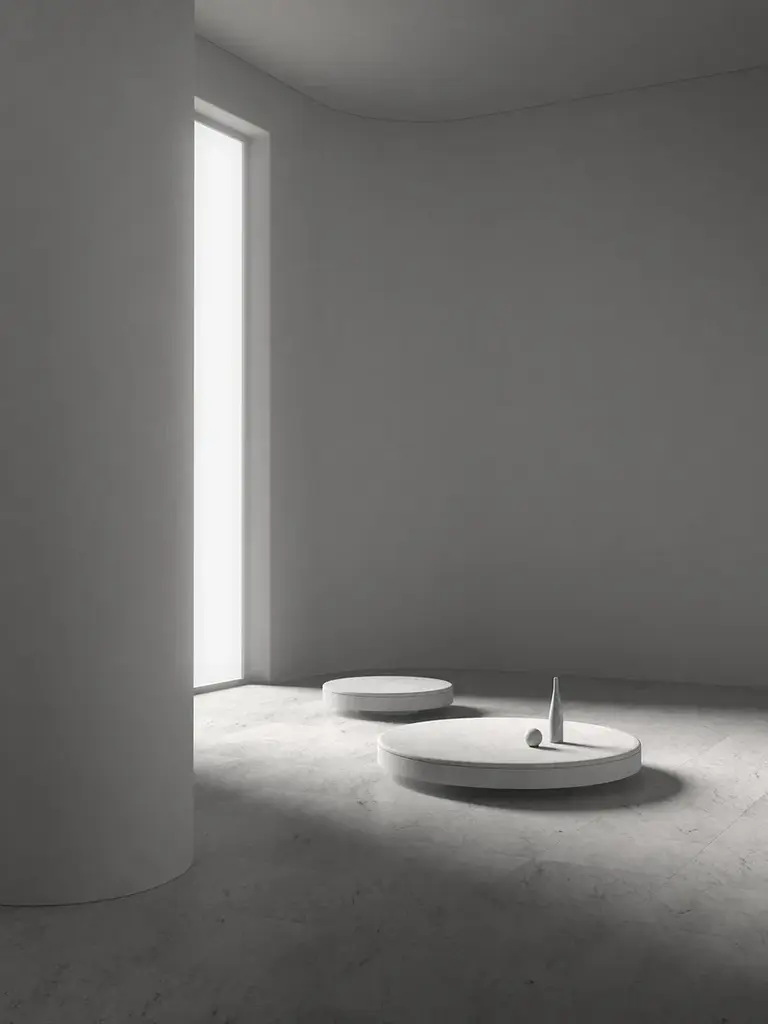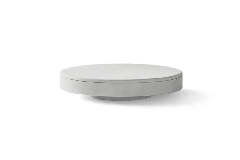 The generous dimensions and unexpected design of John Pawson’s Omphalos coffee table make an instant impact.What immediately draws the eye to Omphalos are its surprising dimensions, whether in the one-metre or one-and-a-half-metre version. Unusually low, it seems to hover just above the ground, an effect created by its extraordinary design which conceals the base and lends sense of extreme lightness to a monumental piece.No matter where it is placed, Omphalos becomes the focus of the space, demanding your attention, yet it also emanates a sensation tranquillity and order, due in part to the choice of two pale, soothing colours in the form of Bianco Carrara marble and Crema d’Orcia limestone.Available in a choice of circular or square form, Omphalos most certainly lives up to its name, which comes from the ancient Greek word for “navel”, and refers to the focus of activity or attention.