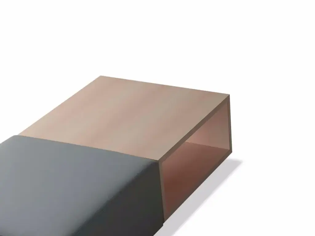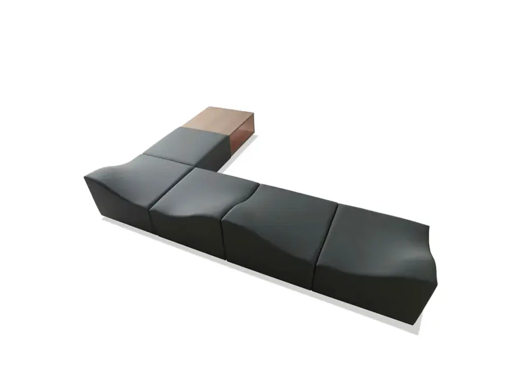 Harmony of fluid and sinuous curves. ONDA is a collection of three different padded, modular seats which can be grouped together in various ways. It imprints its environment with a touch of vivacity and freshness with a strong visual impact. To complement and make the collection more expressive and functional, there is a series of coffee tables in wood and metal.Pouf with frame made of wood particle board. Unpholstery with nondeformable polyurethane foam with different densities. Covering with fabric, eco-leather or c.o.m. Feet in polypropylene. The tables/containers are made of mulptply veneered beechwood natural or stained according to sample book. The service table are made of folded sheet polished in white or black colors. The elements can be combined together with a hidden joint.