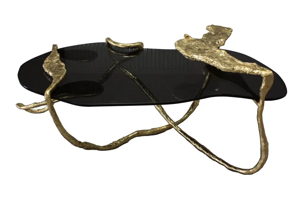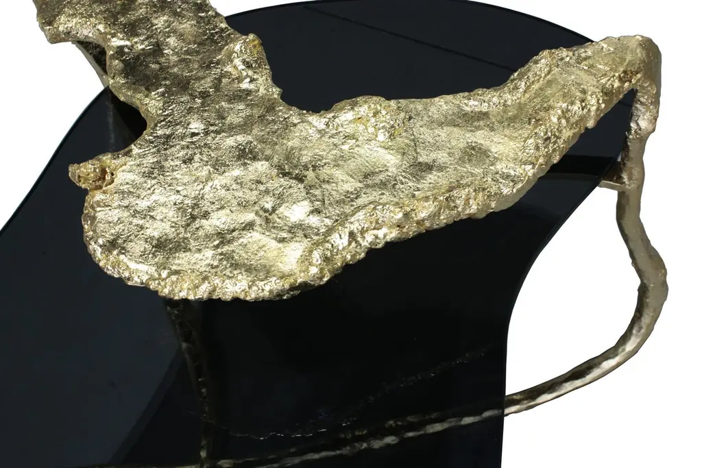 Hand wrought and sculpted iron tableGold leaf finishSmoke grey glass.