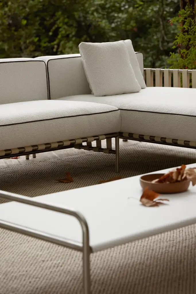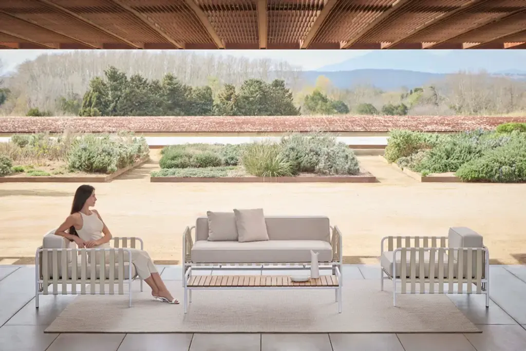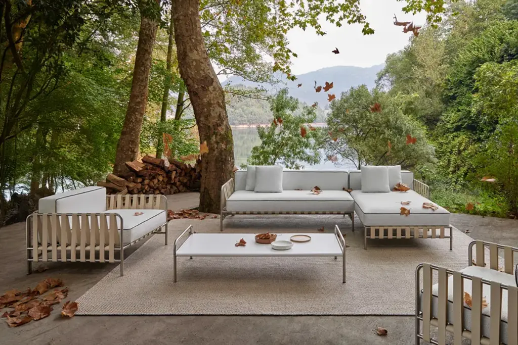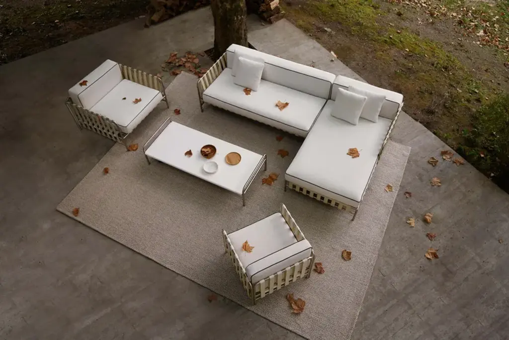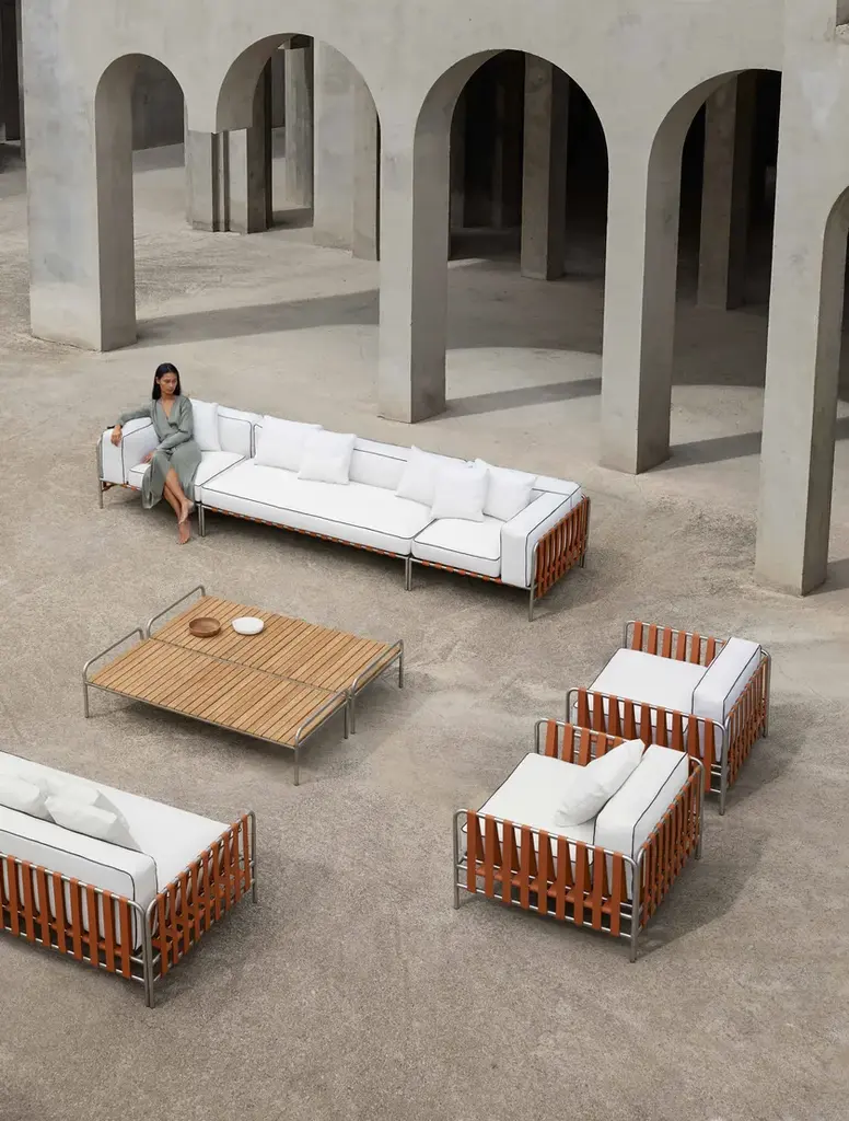 Francesco Meda and David Quincoces are teaming up with GANDIABLASCO to design a collection destined to become an icon of timeless design. Young talent, innovation and the brand’s extensive background bring us a classic from the future.ONSEN is a collection of outdoor furniture of peaceful beauty where the most linear and essential is charged with uniqueness in every gesture. A collection composed of dining club armchair, sofa, lounge chair, modular sofas and different low tables that masterfully combine such different materials as stainless steel, elastic straps, aluminium sheet and teak, to integrate them in perfect harmony.“I like to emphasize the particularities of the materials I use to put them at the service of both functionality and relaxed aesthetics. The key is always to make sure that the details are not just details”, argues Meda.With geometric, generous and simple lines that are devoid of all pretense, the pieces by ONSEN exude freshness and sophistication and stand out for their versatility, allowing the space to be modulated in combinations that sometimes give rise to splendid retreats for relaxation and on other occasions can become a little more formal and compact.One of the distinctive aspects of the collection is that the seats and backrests rest and are raised on a succession of leather straps interlaced and fixed to a stainless steel tubular structure. The graphic and aesthetic component finds here the same weight as the technical solution. “The idea was to generate a contrast between the fabric and the metal structure together with the geometry and transparency provided by the strips”, details Meda.This play between the lightness and warmth provided by the aluminium and the leather respectively becomes the identity of ONSEN conceived by the Milanese designer.