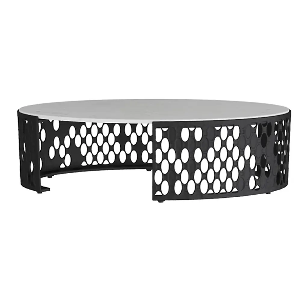The Onze Coffee Table from Arteriors is a dazzling addition to your décor. It features a banswara marble composition that makes it both refined and durable. It is defined by its open framework that presents a collection of cascading circular silhouettes that give this piece its expressiveness. An open framework creates an inviting appearance while adding a touch of stylistic flair. Onze’s ovular tabletop lets you easily place your mugs and trays.