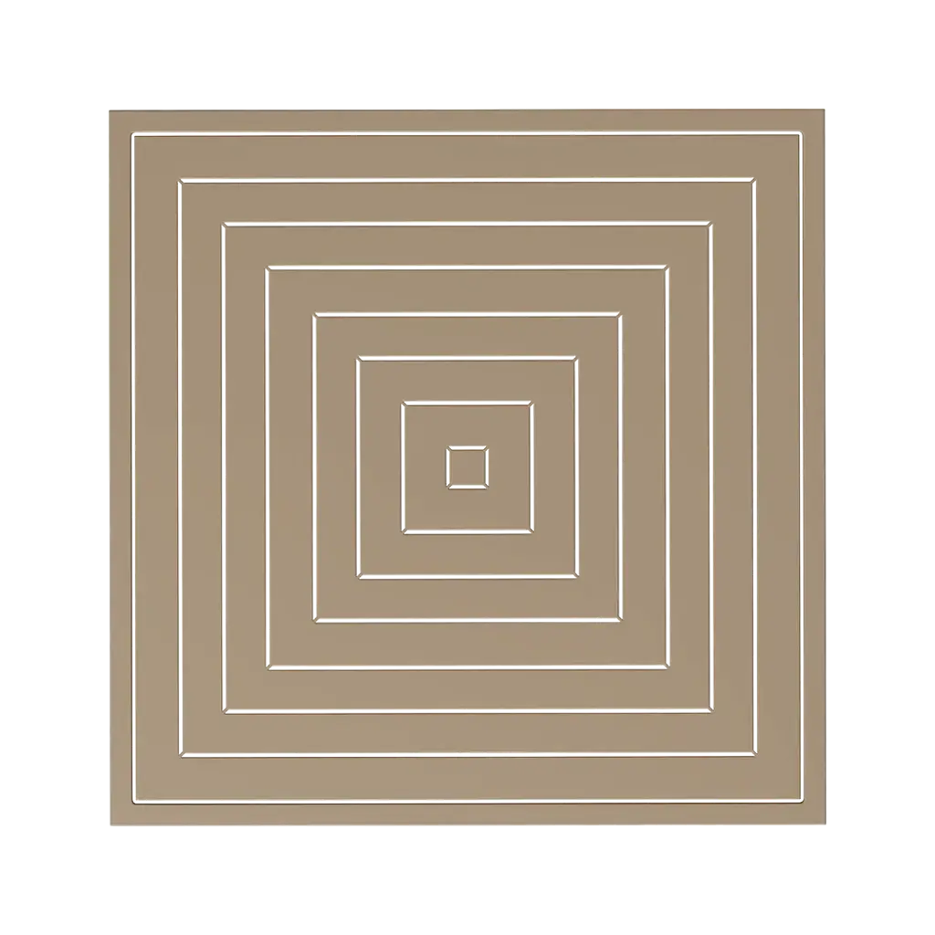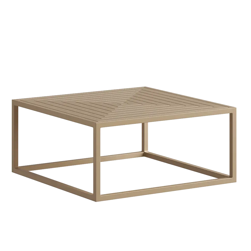 Dimensions: 42W x 42D X 19H A versatile new outdoor collection that features everything you need to create an outdoor oasis! The work horse of your outdoor living space. Anchor your seating area with this perfect table. This table is a no-brainer; a great size, a great design, and a timeless look. Frame: Weather-resistant, premium powder coated aluminum Features: Fully-welded and assembled. 360 degree welds for maximum strength and longevity. Solid billet aluminum tops milled in modern, geometric patterns Made in America