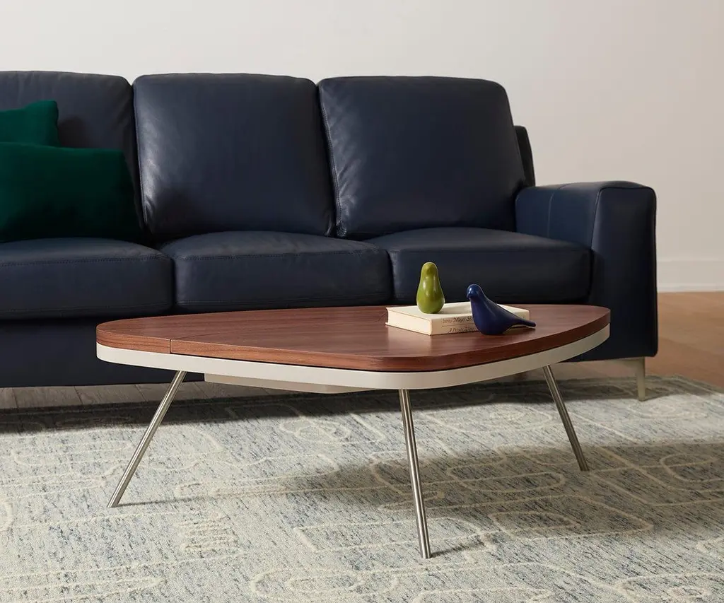 You're on your way to curating impeccable style with the Oppna Coffee Table. Sleek, slim angled brushed steel legs support a double layered tabletop. The two wood panels of the surface slide open to reveal a secret cubby space, perfect for storing remotes or coasters. With a unique shape and two-tone color palette, this piece makes an attractive accent to your living space.