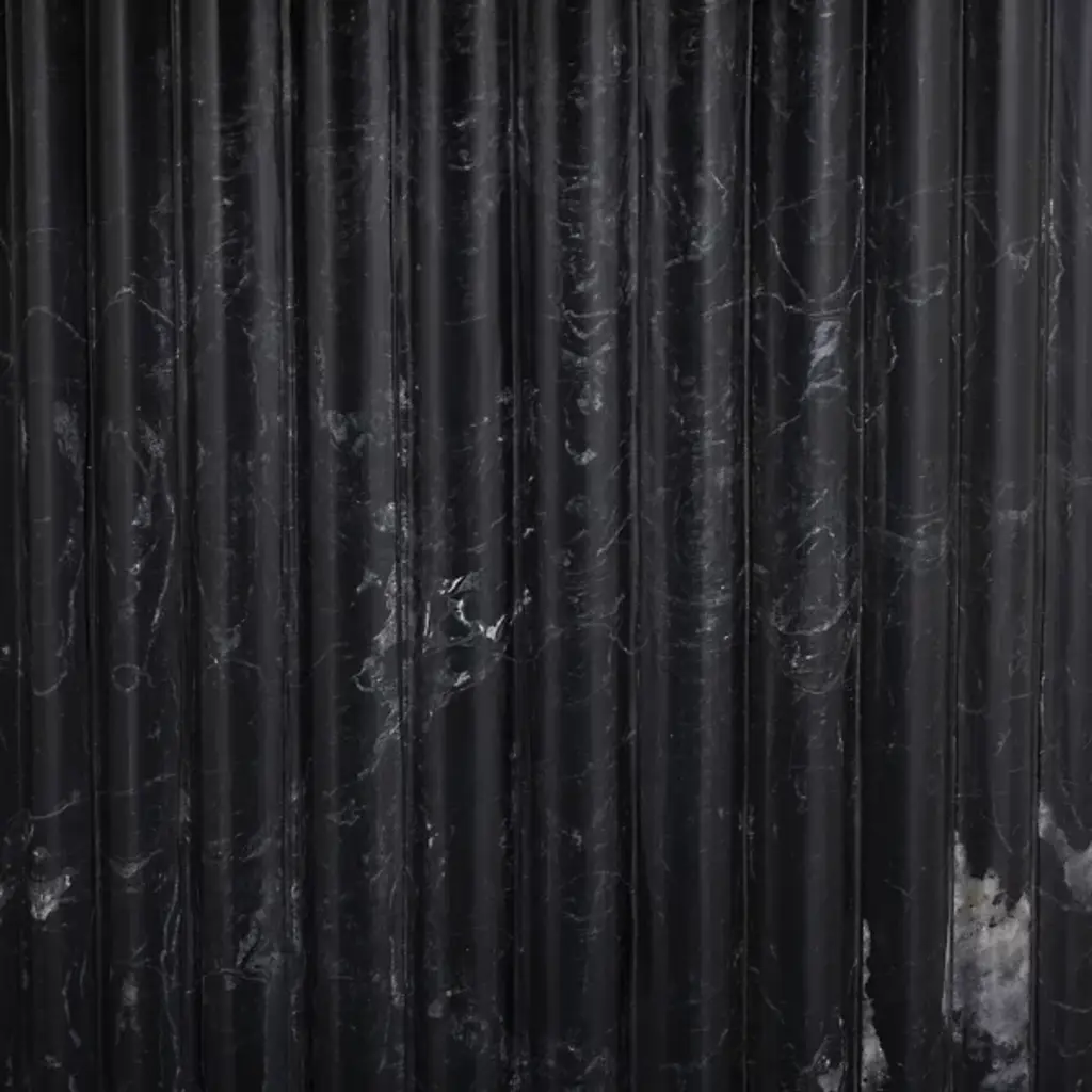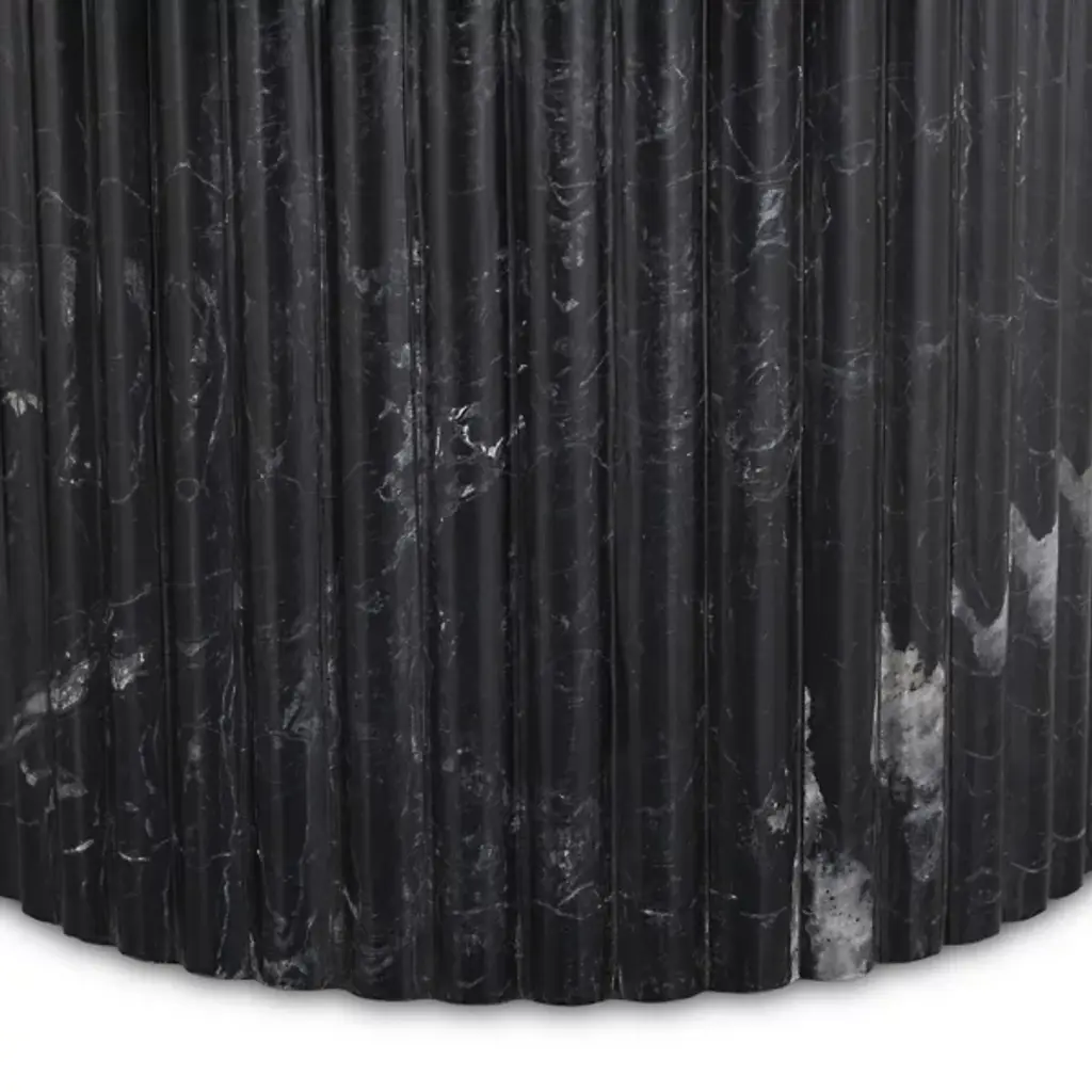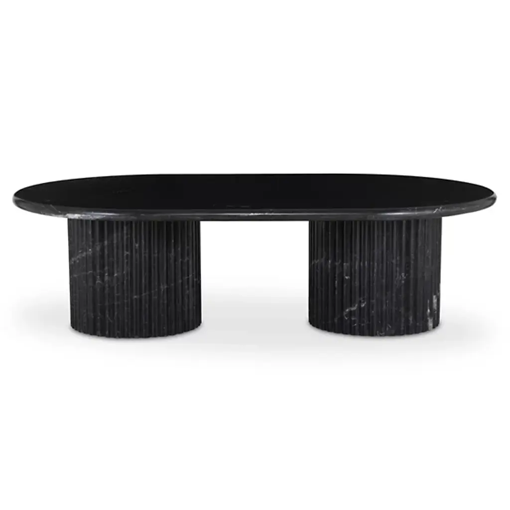 The Oranda Coffee Table from Four Hands draws inspiration from Italian design. Its base features a scalloped pattern with a linear appearance and substantial texture. This unique foundation supports an oval tabletop, both crafted from solid marble. The table's carefully considered proportions and material choice result in a piece that's both visually arresting and functionally sound. The coffee table's blend of classic material and modern form serves as a central element in living spaces.