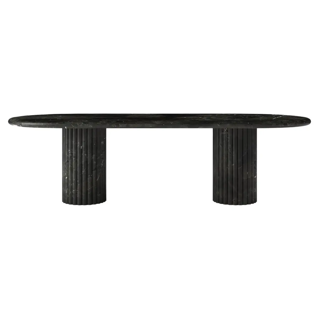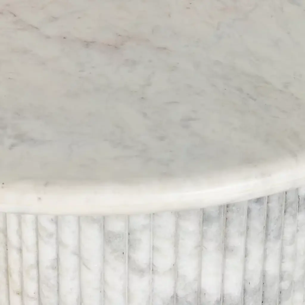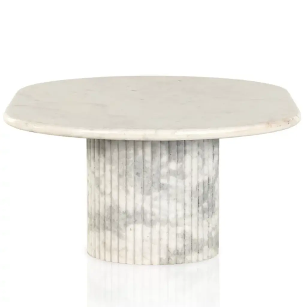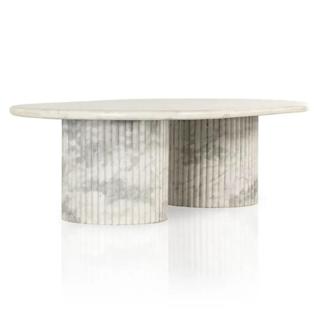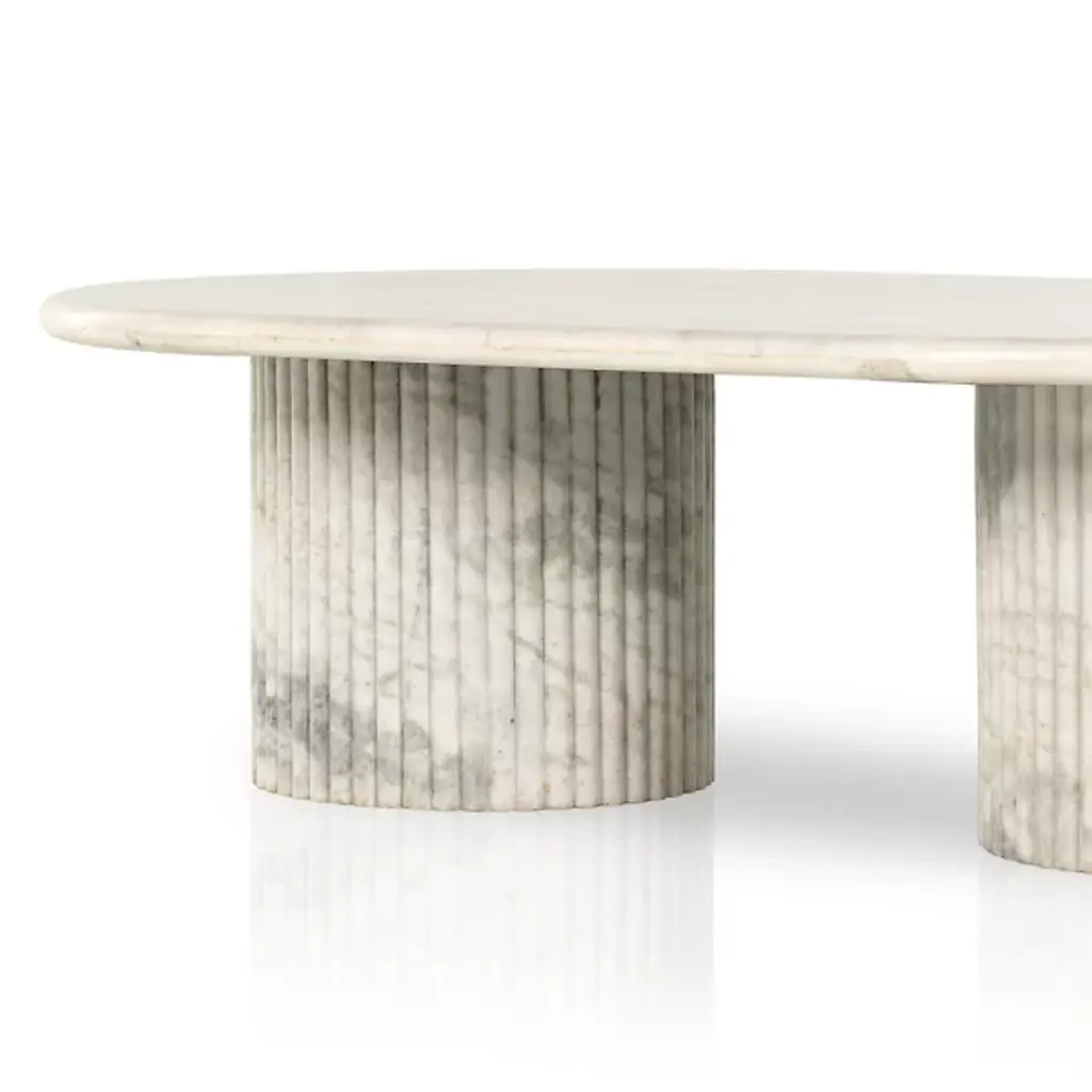The Oranda Coffee Table from Four Hands draws inspiration from Italian design. Its base features a scalloped pattern with a linear appearance and substantial texture. This unique foundation supports an oval tabletop, both crafted from solid marble. The table's carefully considered proportions and material choice result in a piece that's both visually arresting and functionally sound. The coffee table's blend of classic material and modern form serves as a central element in living spaces.