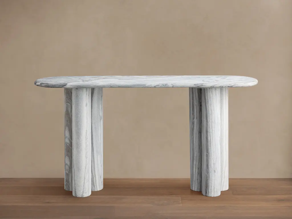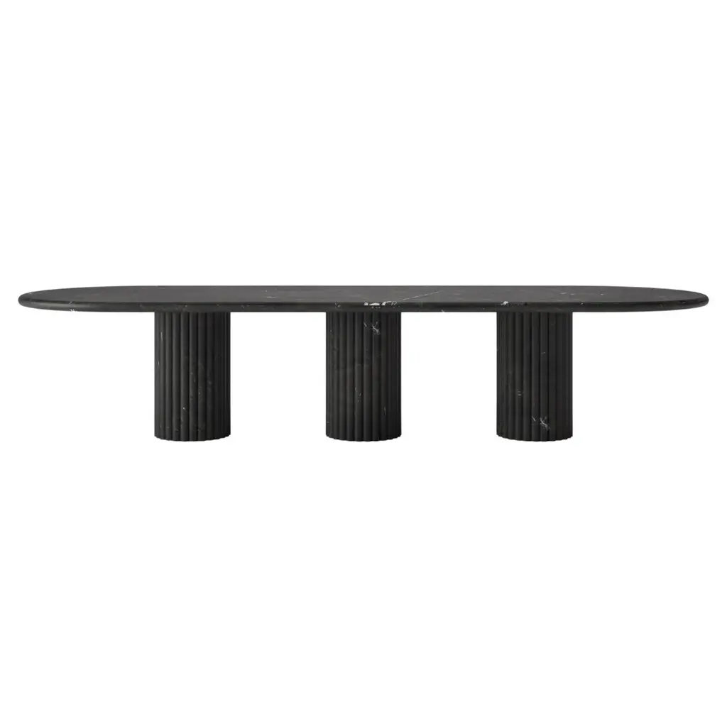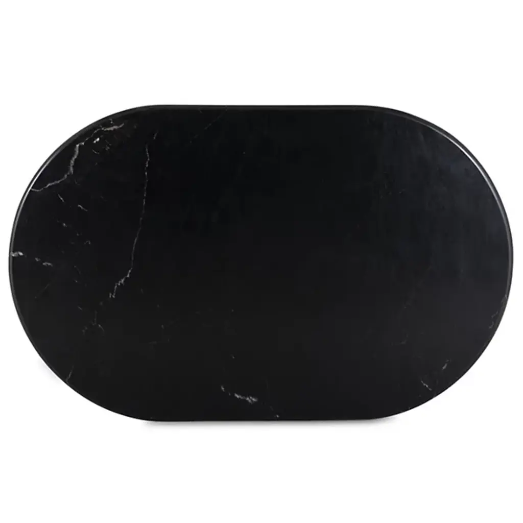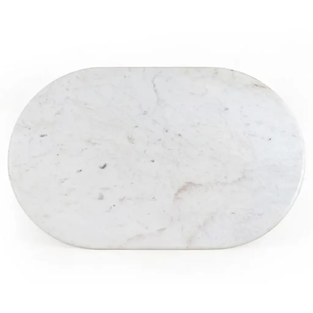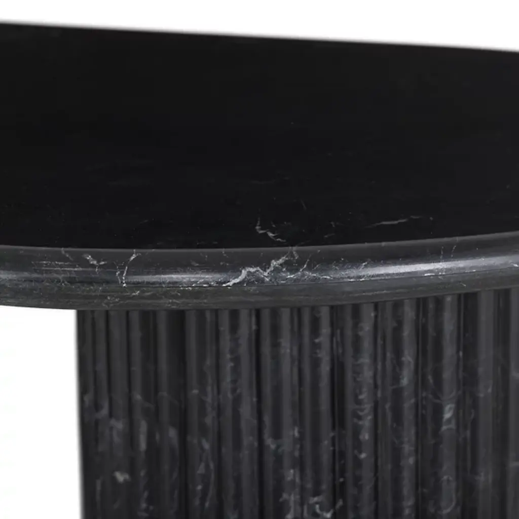 The Oranda Coffee Table from Four Hands draws inspiration from Italian design. Its base features a scalloped pattern with a linear appearance and substantial texture. This unique foundation supports an oval tabletop, both crafted from solid marble. The table's carefully considered proportions and material choice result in a piece that's both visually arresting and functionally sound. The coffee table's blend of classic material and modern form serves as a central element in living spaces.