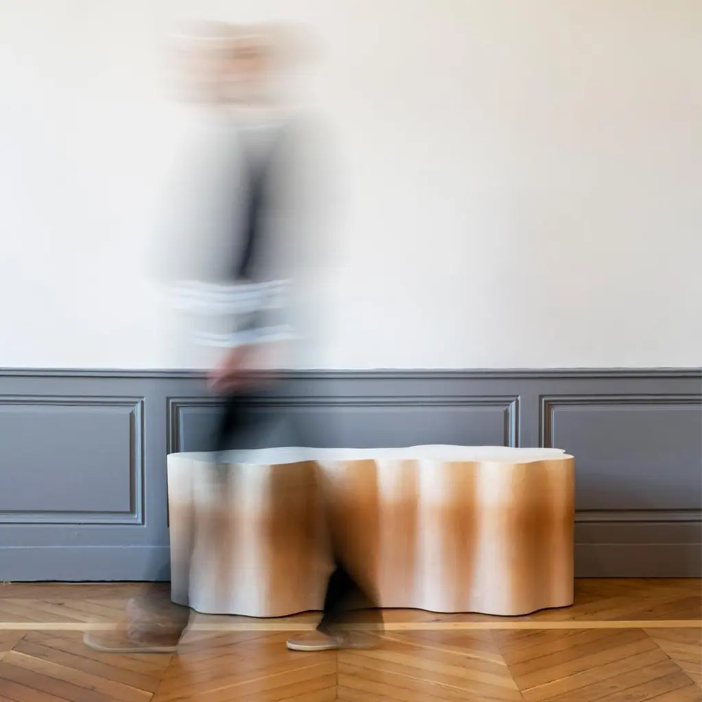 Banc Lithos One of a Kind by MANUFACTURE XXIDimensions: W 130 x D 49 x H 47 cm.Materials: Mortar-coated cardboard tube structure.Weight: 66.5 kg. LITHOS explores a versatile manufacturing technique based on a mortar- coated cardboard tube structure. Each piece reveals a gradation which, progressively applied in the varnish, enhances the curvature of the structure. A sinuous, colourful piece available in multiple formats, it can be used as an island to display or set items, as a coffee table or sideboard, or as a free shape that lives by its very presence.At MANUFACTURE XXI, they design products that reflect the utmost respect for both the planet and people. To achieve this, they are committed to production methods that consume as little energy as possible. They prioritize cold manufacturing processes, which are gentle and low in energy consumption. Instead of using time-saving methods that harm the environment, they prefer techniques that are environmentally neutral — such as moulding, hand-coating, and air-drying. Their approach involves experimentation with simple, low-tech methods. Their products are made from natural, recycled, and recyclable composite materials, using production techniques that minimize waste. They are inspired by traditional materials and craftsmanship, often revisiting techniques that have been forgotten over time. At the same time, they are committed to innovation, exploring new materials like geopolymers, which help preserve rare and valuable natural resources while also reducing energy use in production. Ultimately, they advocate for a forward-looking form of craftsmanship rooted in natural resources.