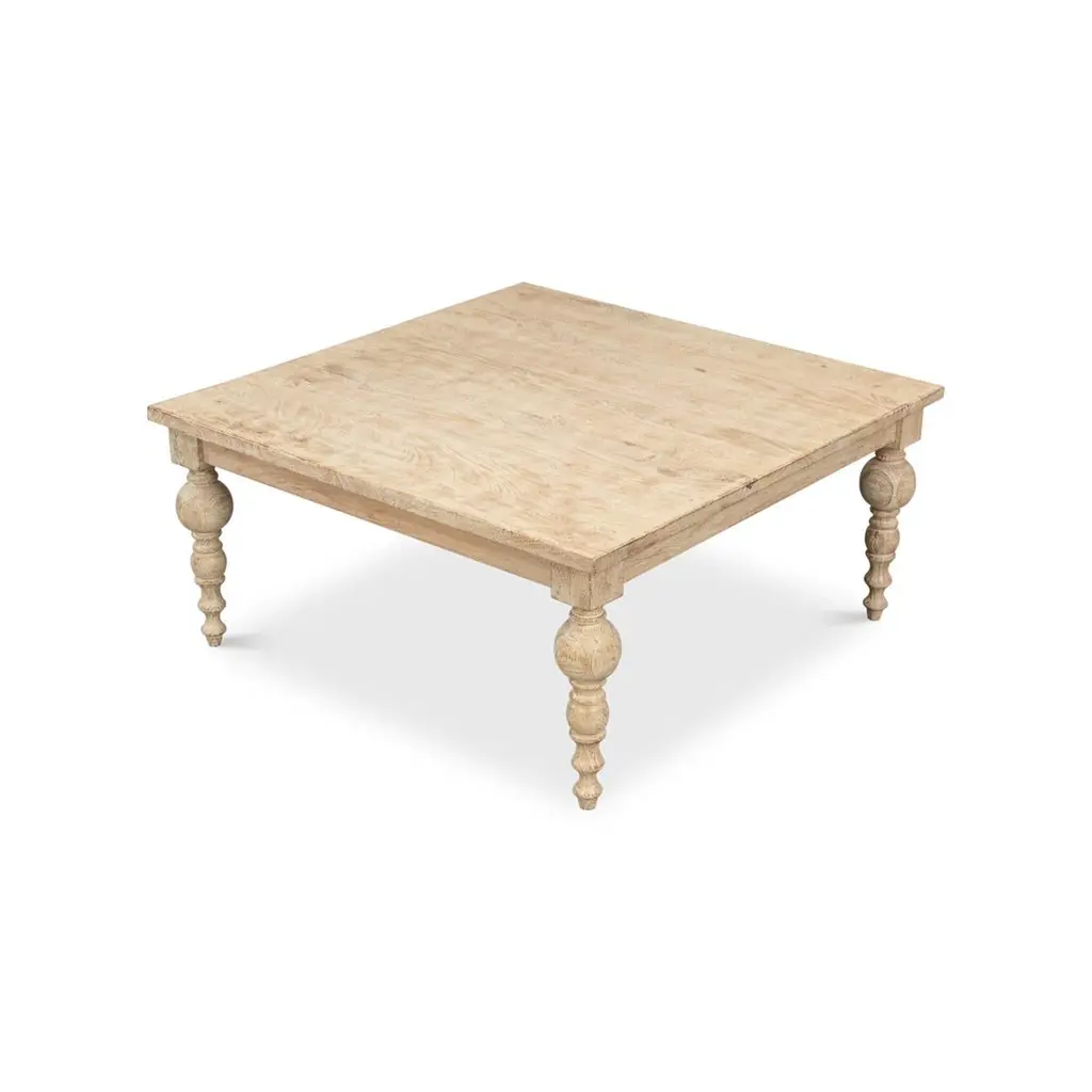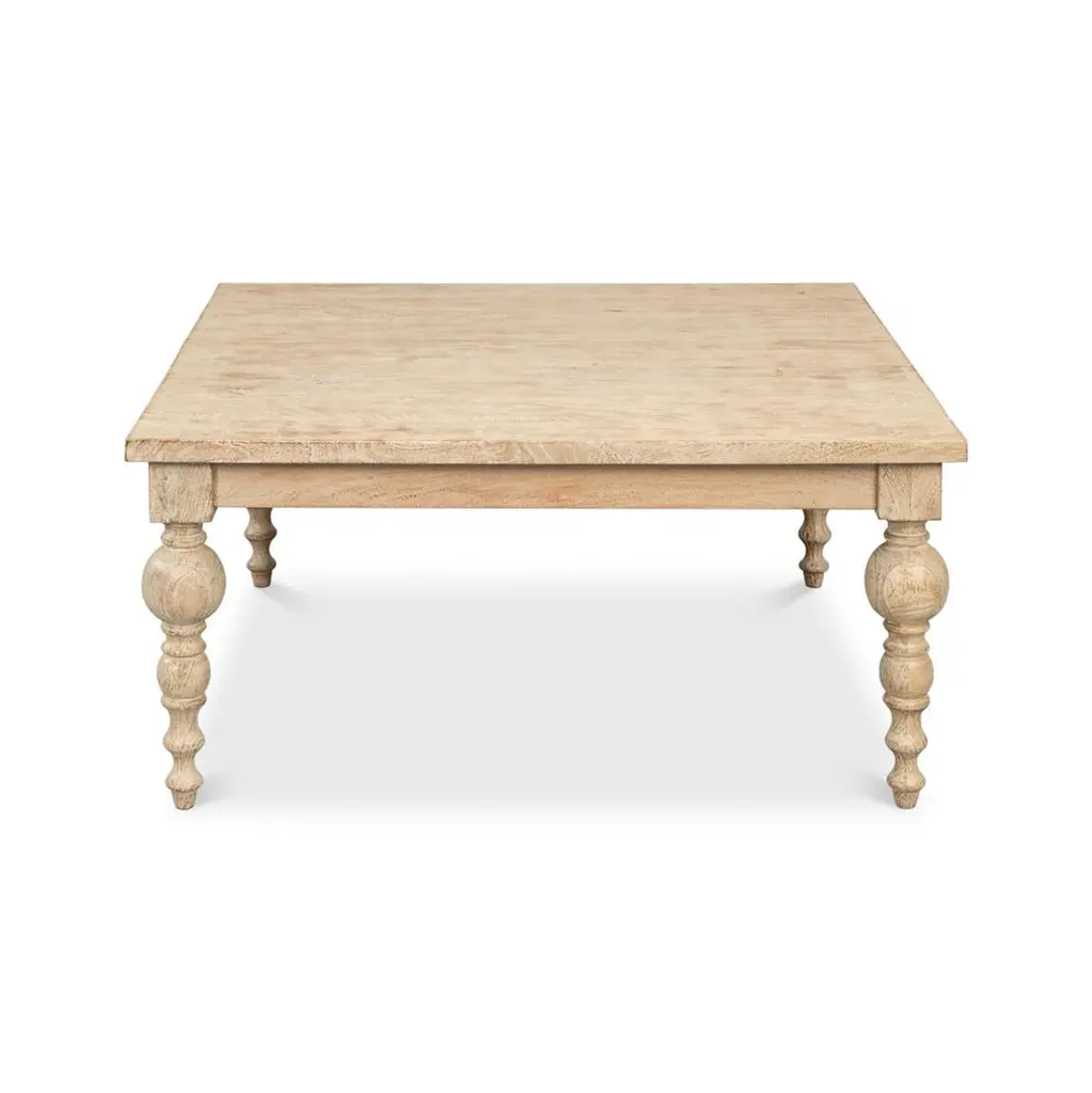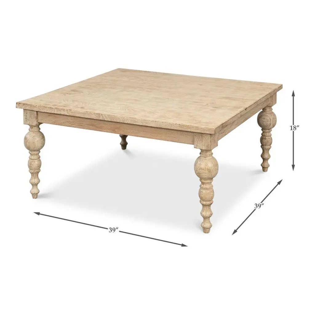 Organic natural coffee table with mango wood in our sienna finish, with bold, turned and tapered legs.Dimensions: 39" W x 39" D x 18" H.