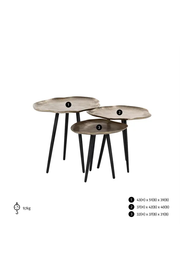 Comes in a set of three in varying heights and sizes, Volenta by OROA is organic-shaped coffee tables designed to fit any interior style. The aluminum tabletops look like giant lily pads in antique gold finish resting atop three black metal legs. Use them together or separately as a centerpiece in your home.