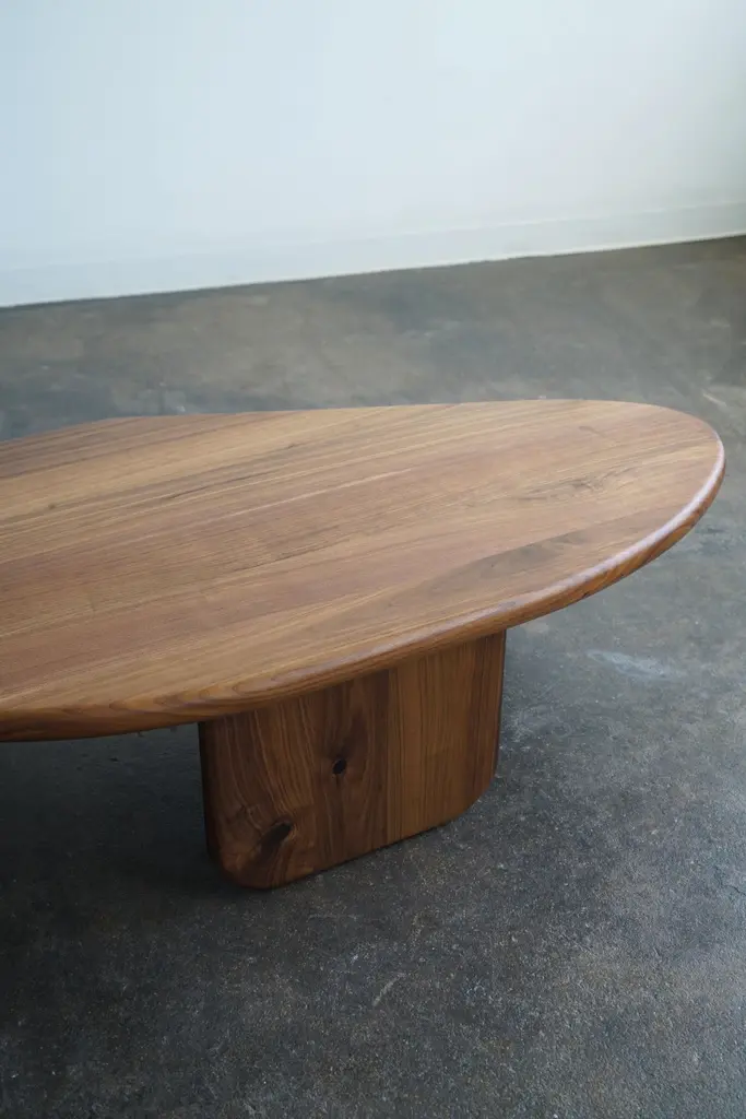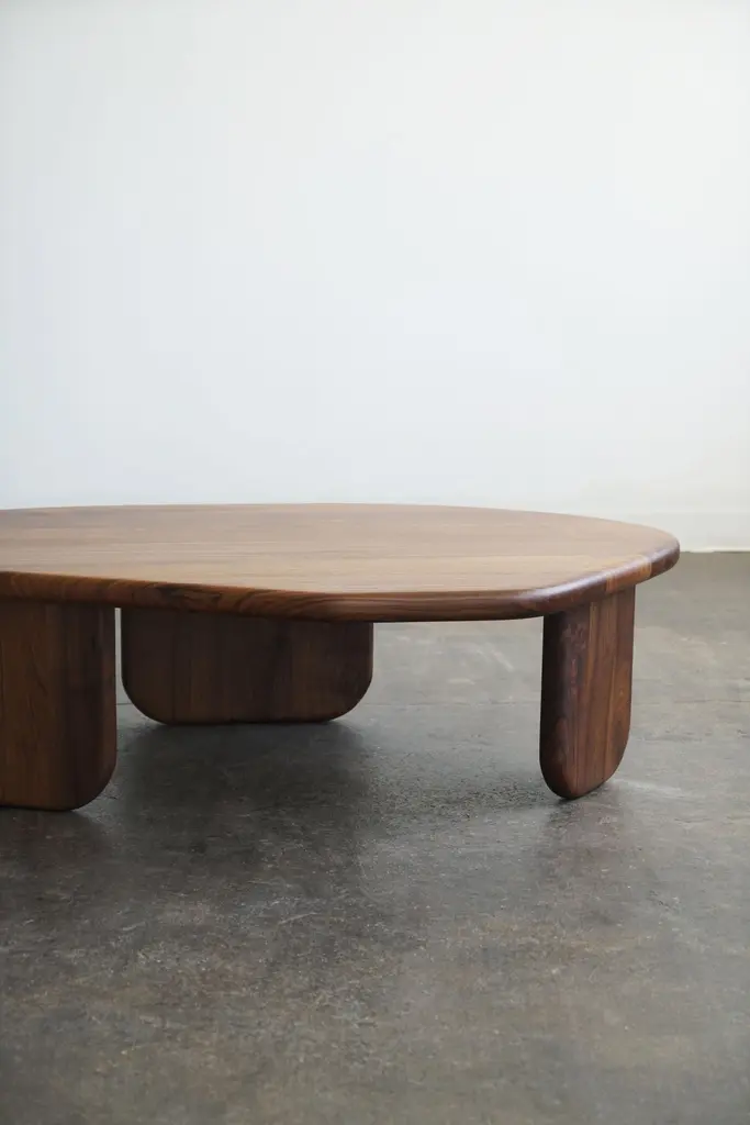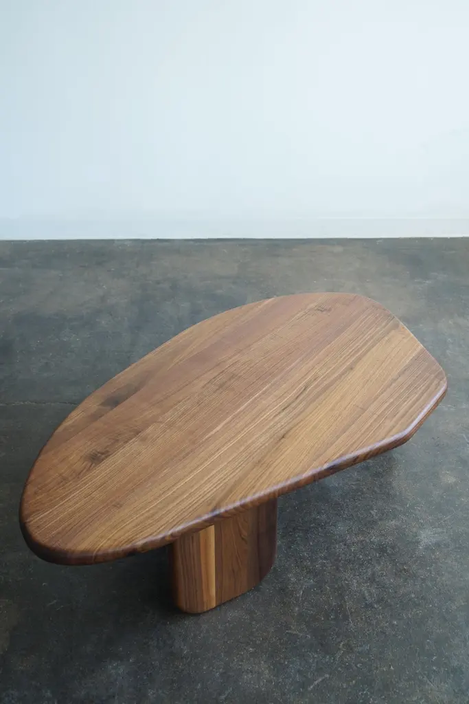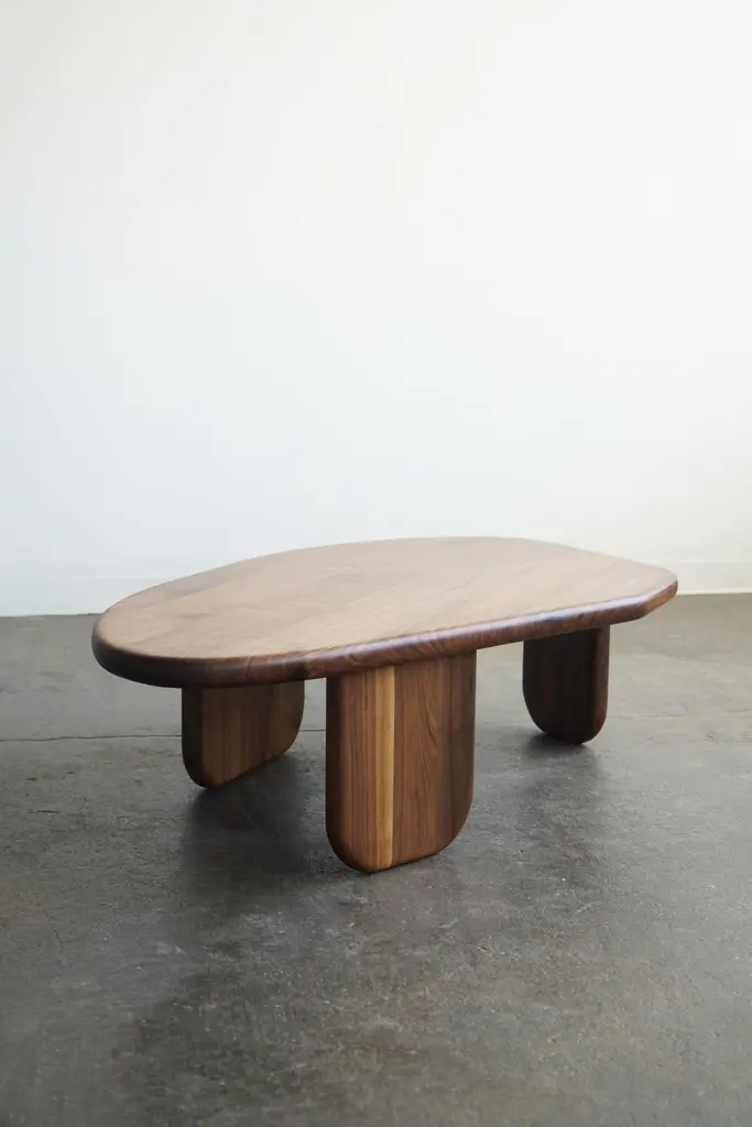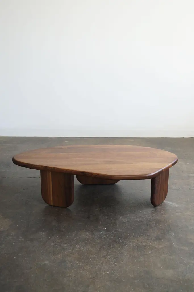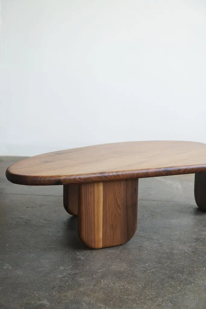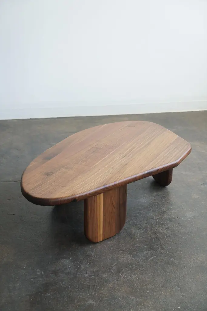Organic shaped coffee table by Last Workshop, 2023Solid walnut wood finish.IN STOCK: 1If not in stock, current production: 6-7 weeks58"L x 32" x 15"HWalnut finish.Customers can choose from:Wood species, finishes, and overall dimensions.The table has three different sized legs that are attached to the table top via hidden joinery.Dimensions shown: 58”L x 32”W x 15”H