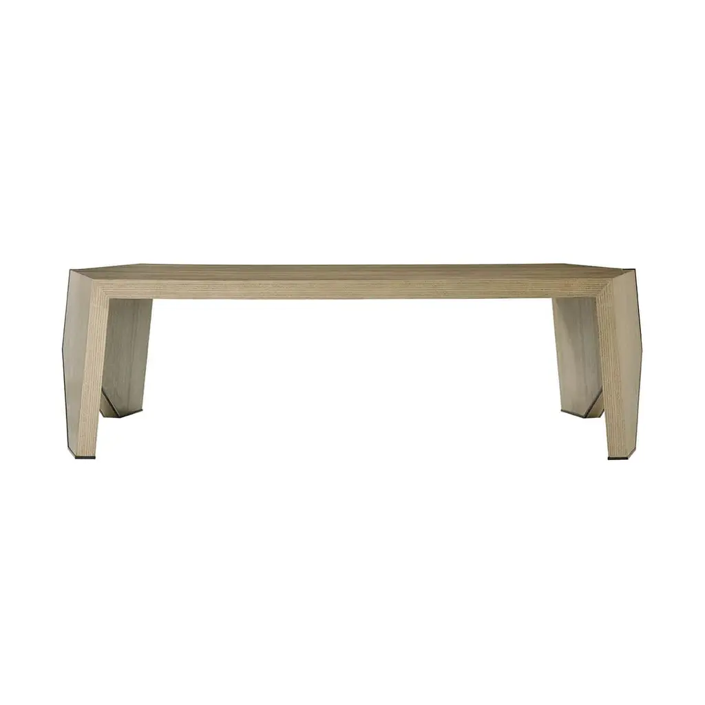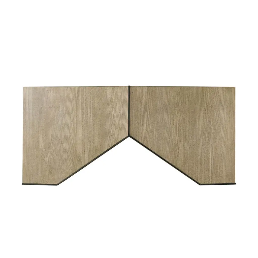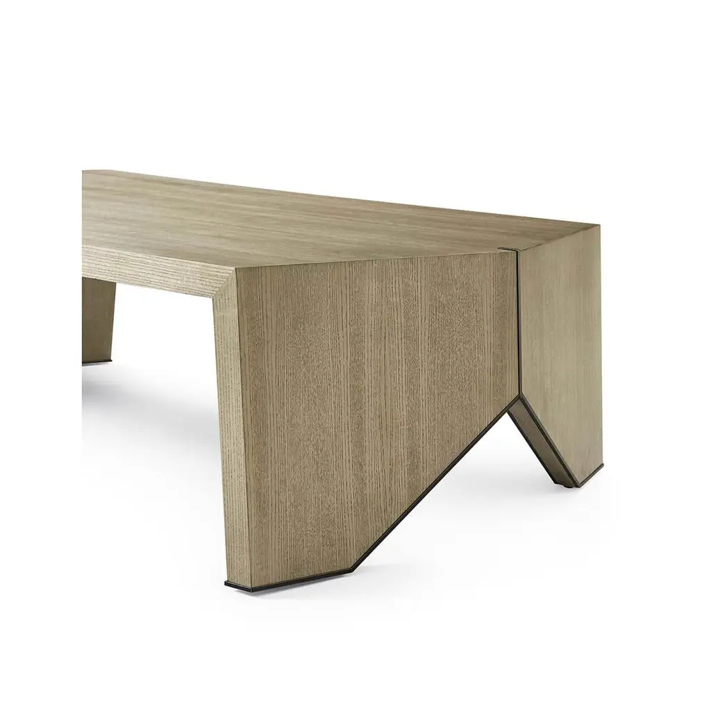 features a contemporary design with faceted planes reminiscent of the simple complexity of origami art. Veneered in Ash, featured in our natural Dune finish, outlined with brass detailing.Dimensions: 58.5" W x 36" D x 16.5" H