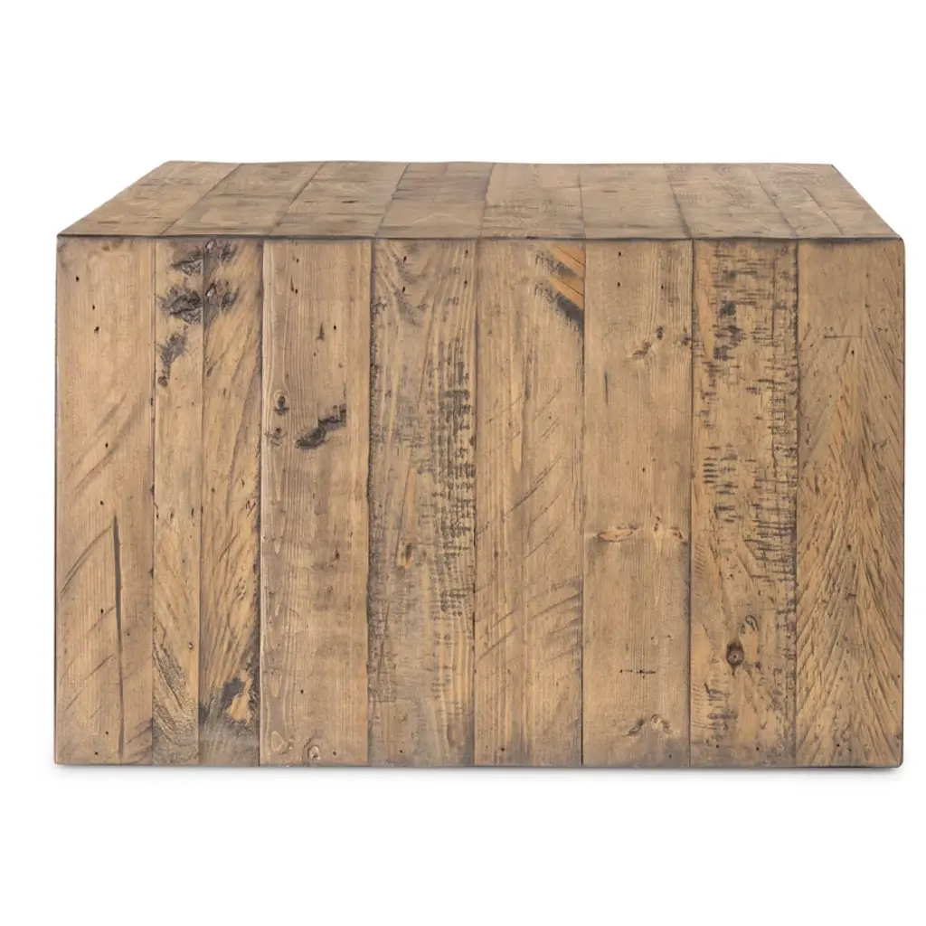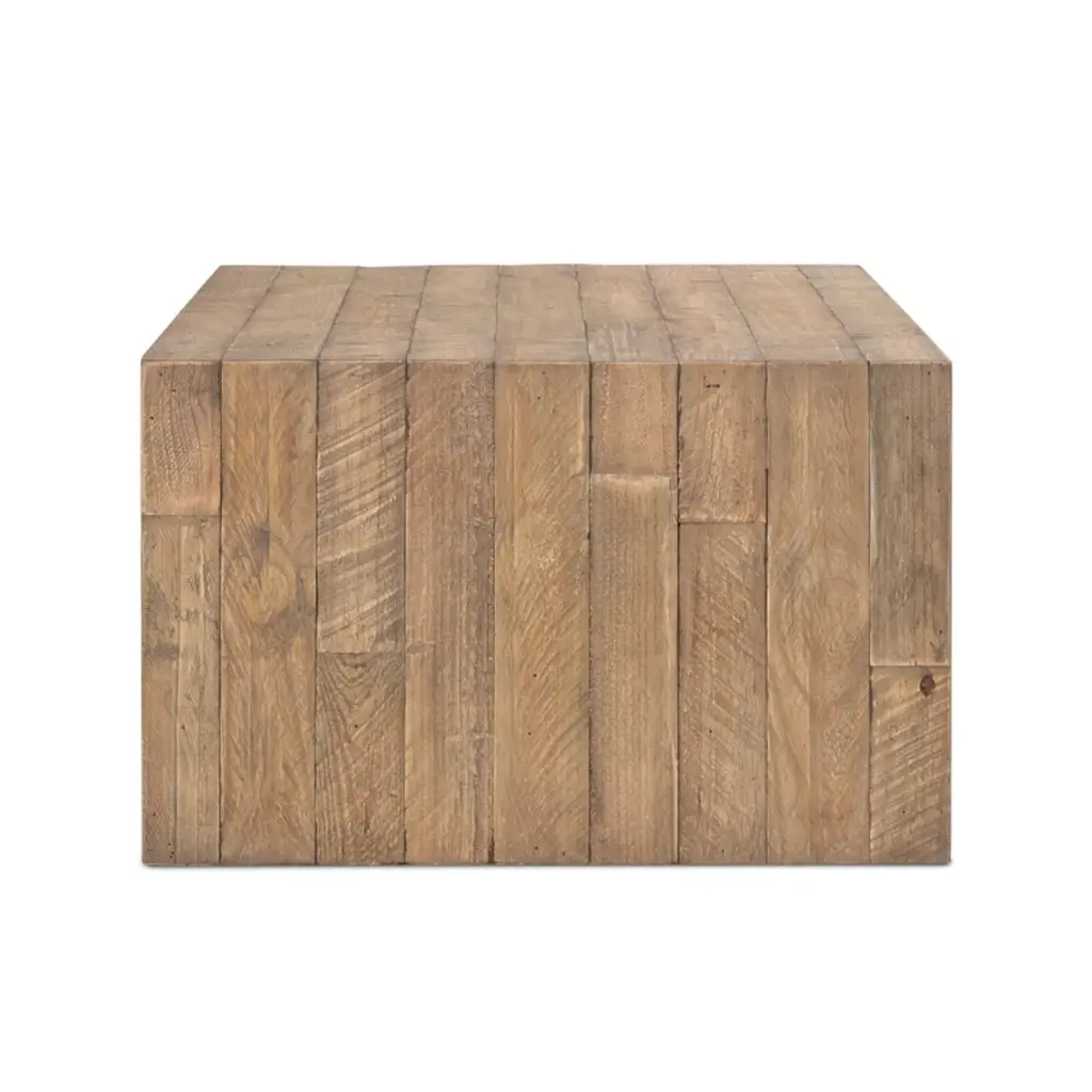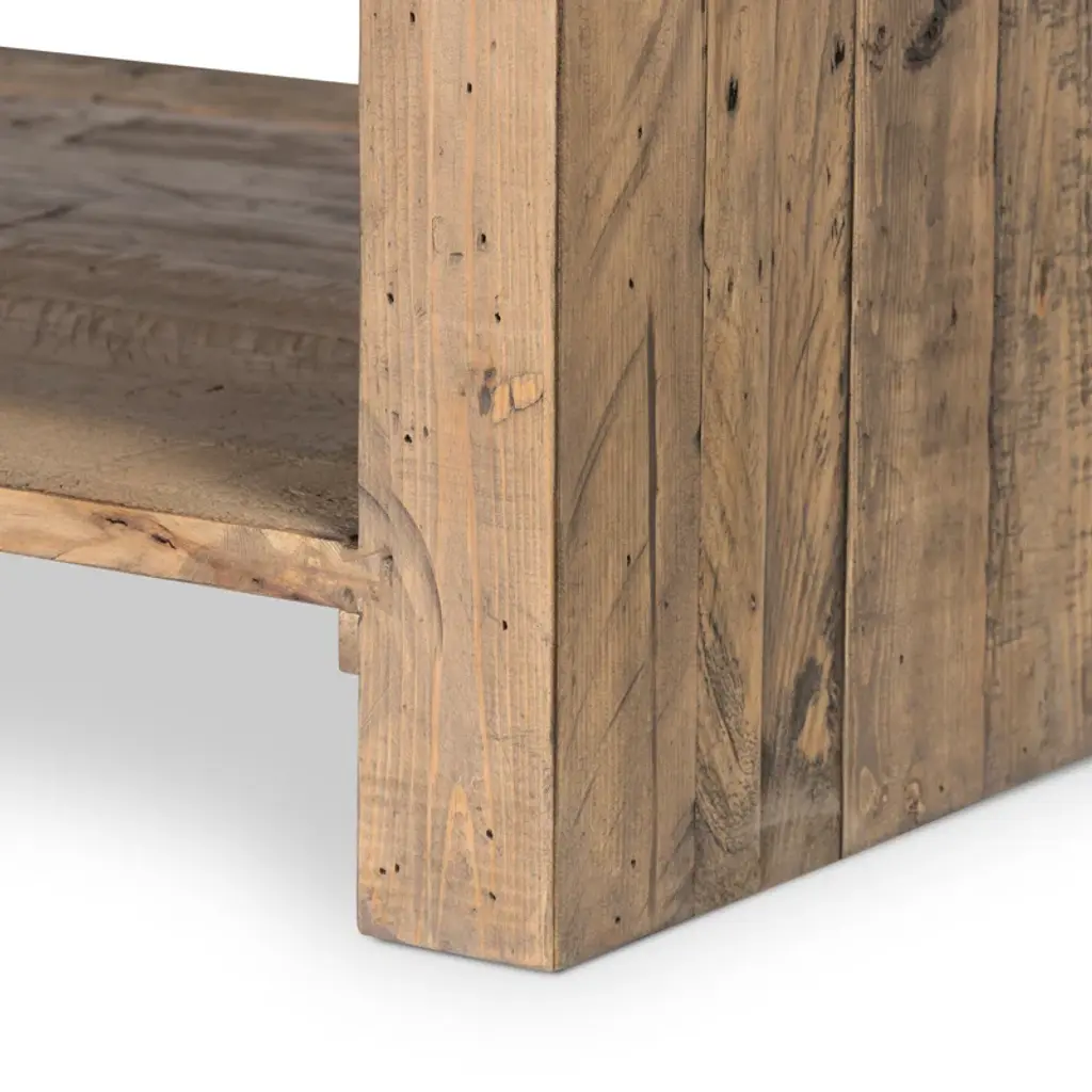 Reclaimed character woods are fashioned into the quintessential rustic coffee table. Lower shelving ups storage space, while materials' natural graining stays intact for authenticity.