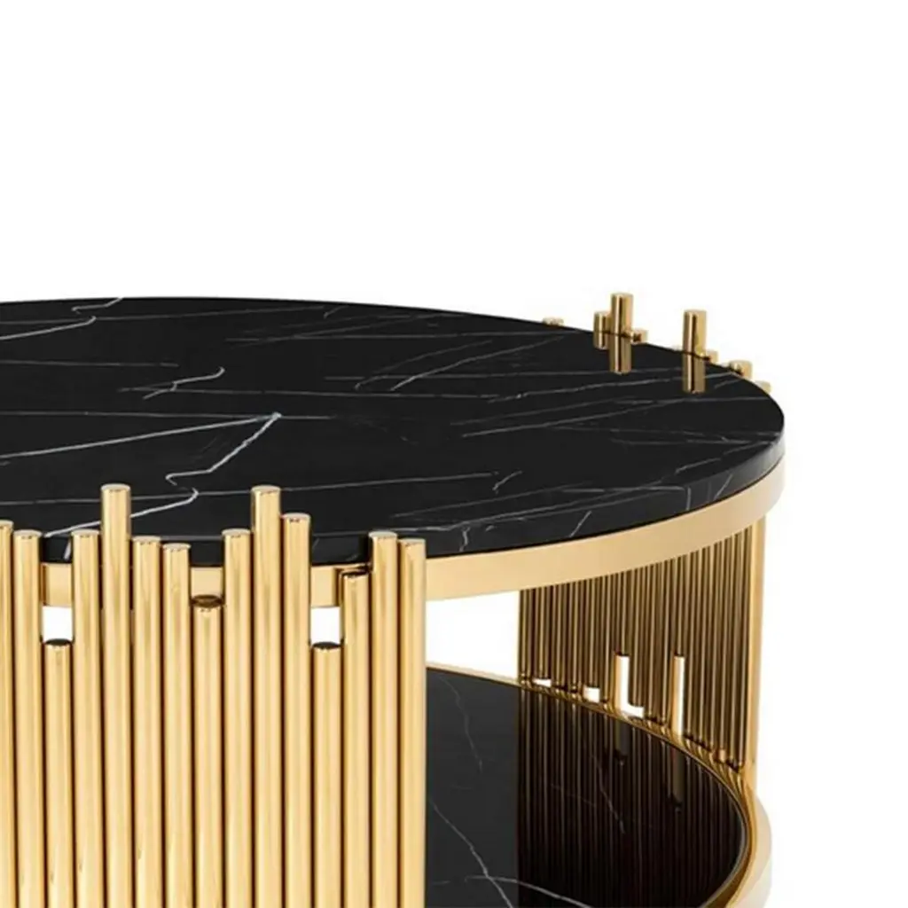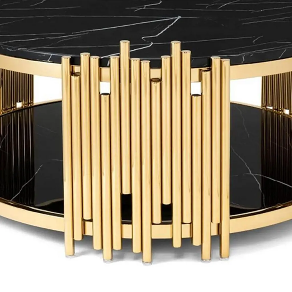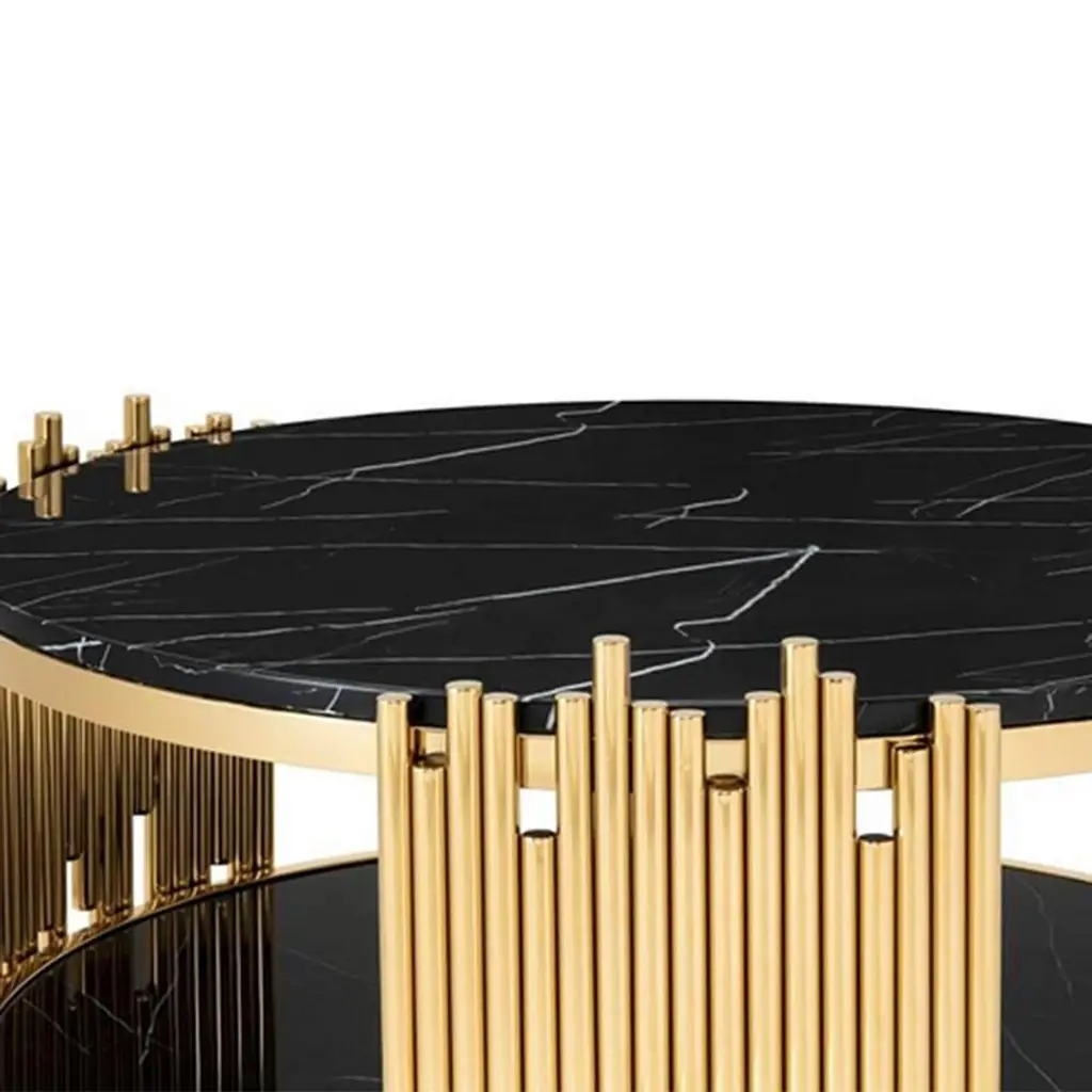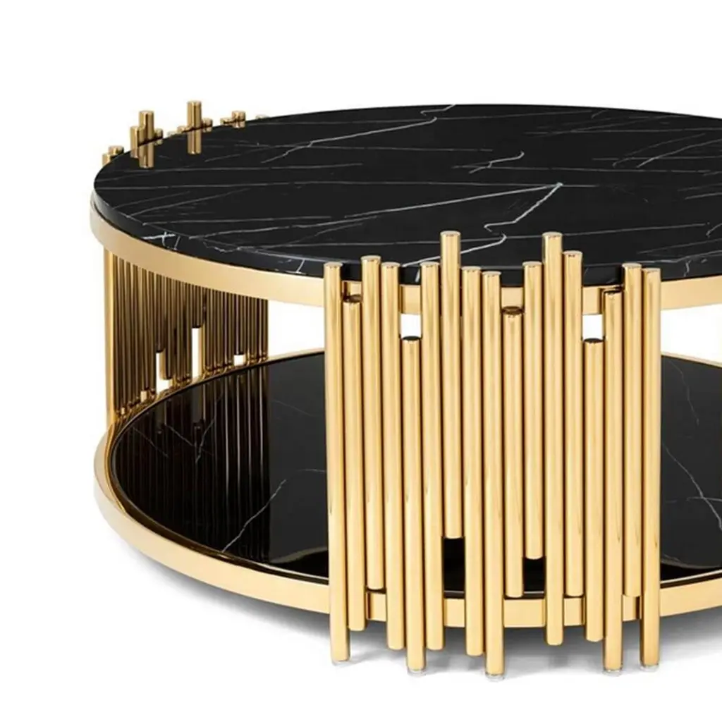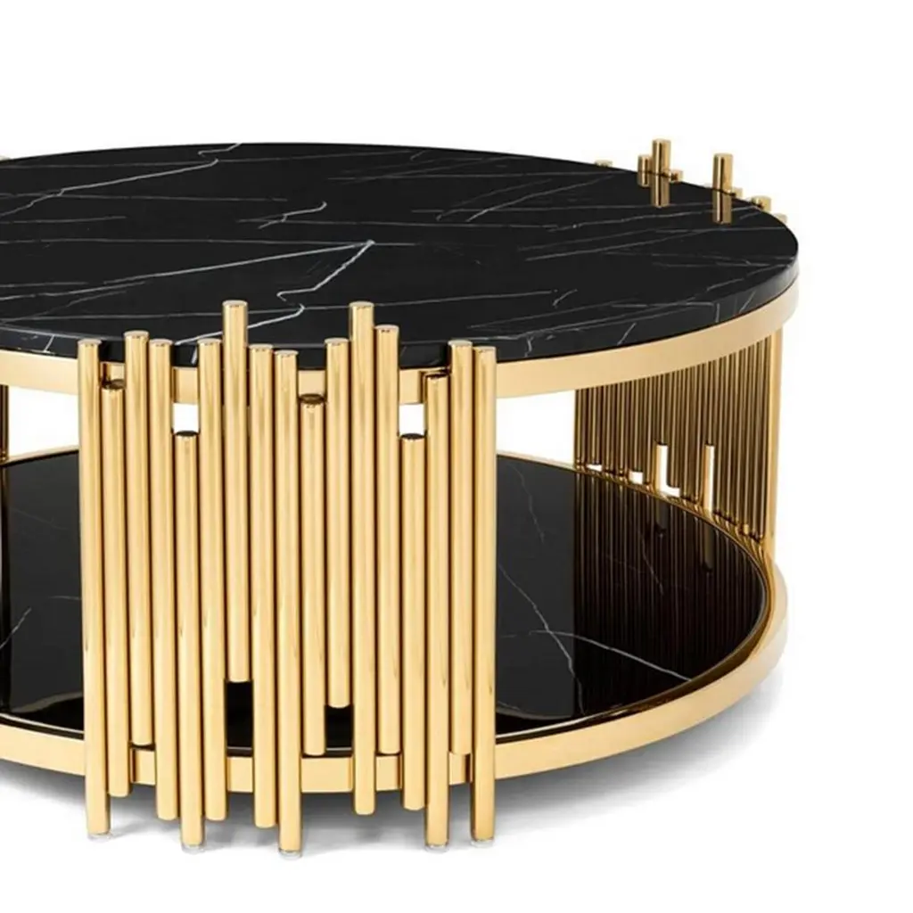 Coffee table ororods round with steel structure in gold finish and with black resin marble up and down tops.