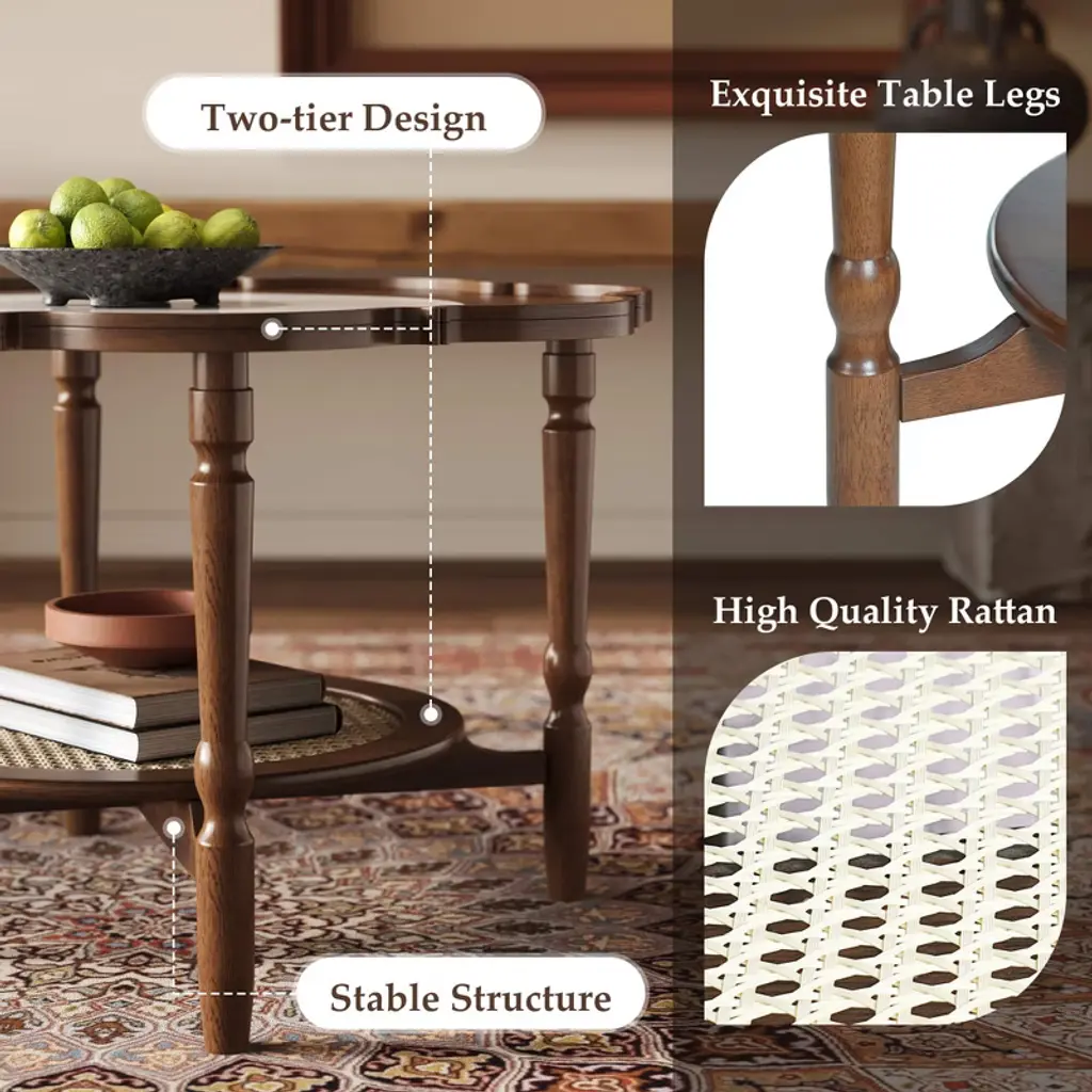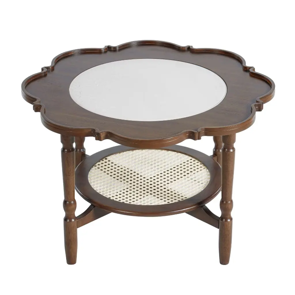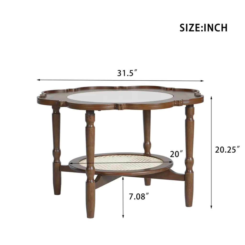 Embrace timeless elegance with this 31.5" mid-century style coffee table, a striking piece that marries retro charm with modern flair. Its unique petal shape adds a soft, organic touch to your living space, while the white crackle pattern glass top infuses subtle texture and visual interest. Crafted with a 2-tiered design, it offers ample surface area for drinks, books, or decor—plus a lower shelf wrapped in natural rattan for extra storage or display space. The rich walnut finish of the frame complements the glass and rattan beautifully, enhancing the mid-century aesthetic that’s both warm and sophisticated. Whether anchoring a cozy living room or elevating a minimalist lounge area, this coffee table effortlessly blends style and functionality, making it a standout addition to any home.