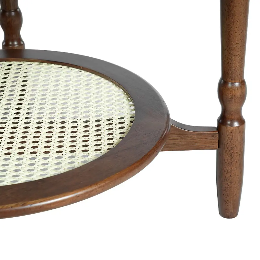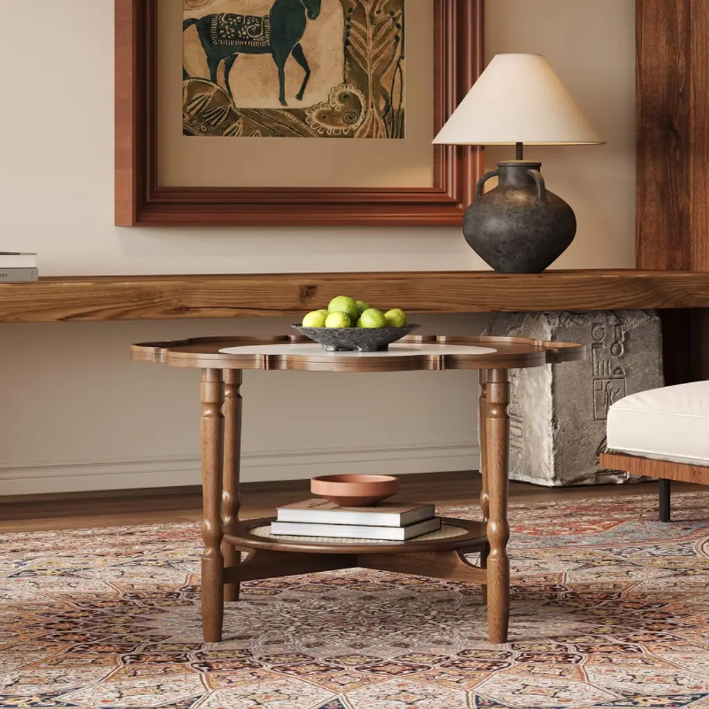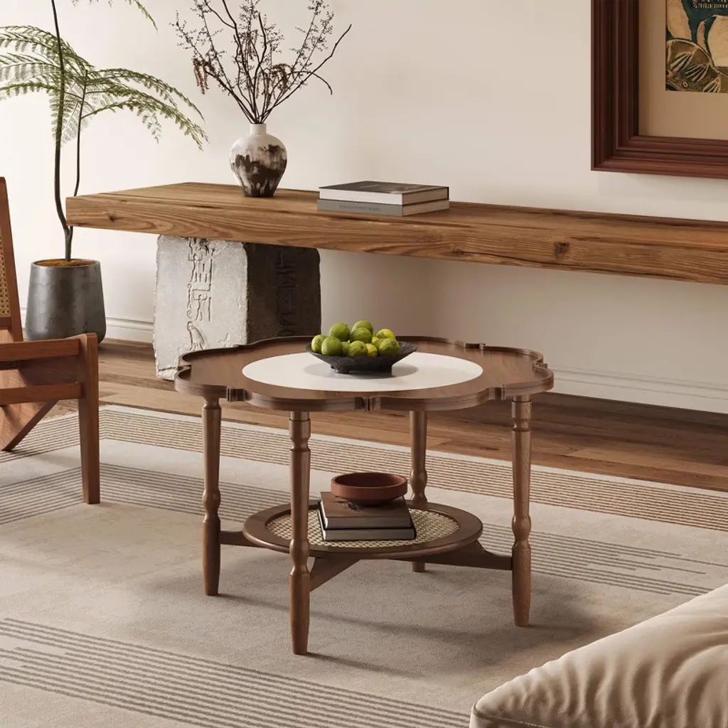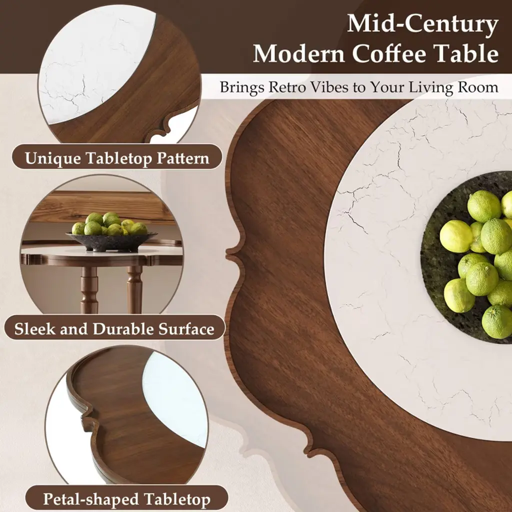 Embrace timeless elegance with this 31.5" mid-century style coffee table, a striking piece that marries retro charm with modern flair. Its unique petal shape adds a soft, organic touch to your living space, while the white crackle pattern glass top infuses subtle texture and visual interest. Crafted with a 2-tiered design, it offers ample surface area for drinks, books, or decor—plus a lower shelf wrapped in natural rattan for extra storage or display space. The rich walnut finish of the frame complements the glass and rattan beautifully, enhancing the mid-century aesthetic that’s both warm and sophisticated. Whether anchoring a cozy living room or elevating a minimalist lounge area, this coffee table effortlessly blends style and functionality, making it a standout addition to any home.