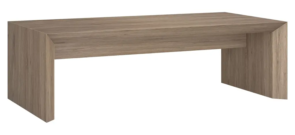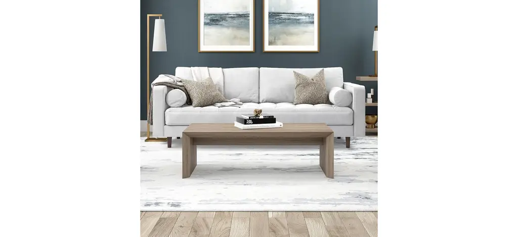 Striking in its simplicity, this modern Oswin Coffee Table emphasizes clean lines and straightforward design. The table's seamless design is given extra dimension with the beveled banding around the edges. The natural wood-look finish adds texture and tonal variation to your space, while the open sled base allow for plenty of storage options. With an assembly time under 20 minutes, this is the perfect piece to effortlessly update your living room, family room, or office.