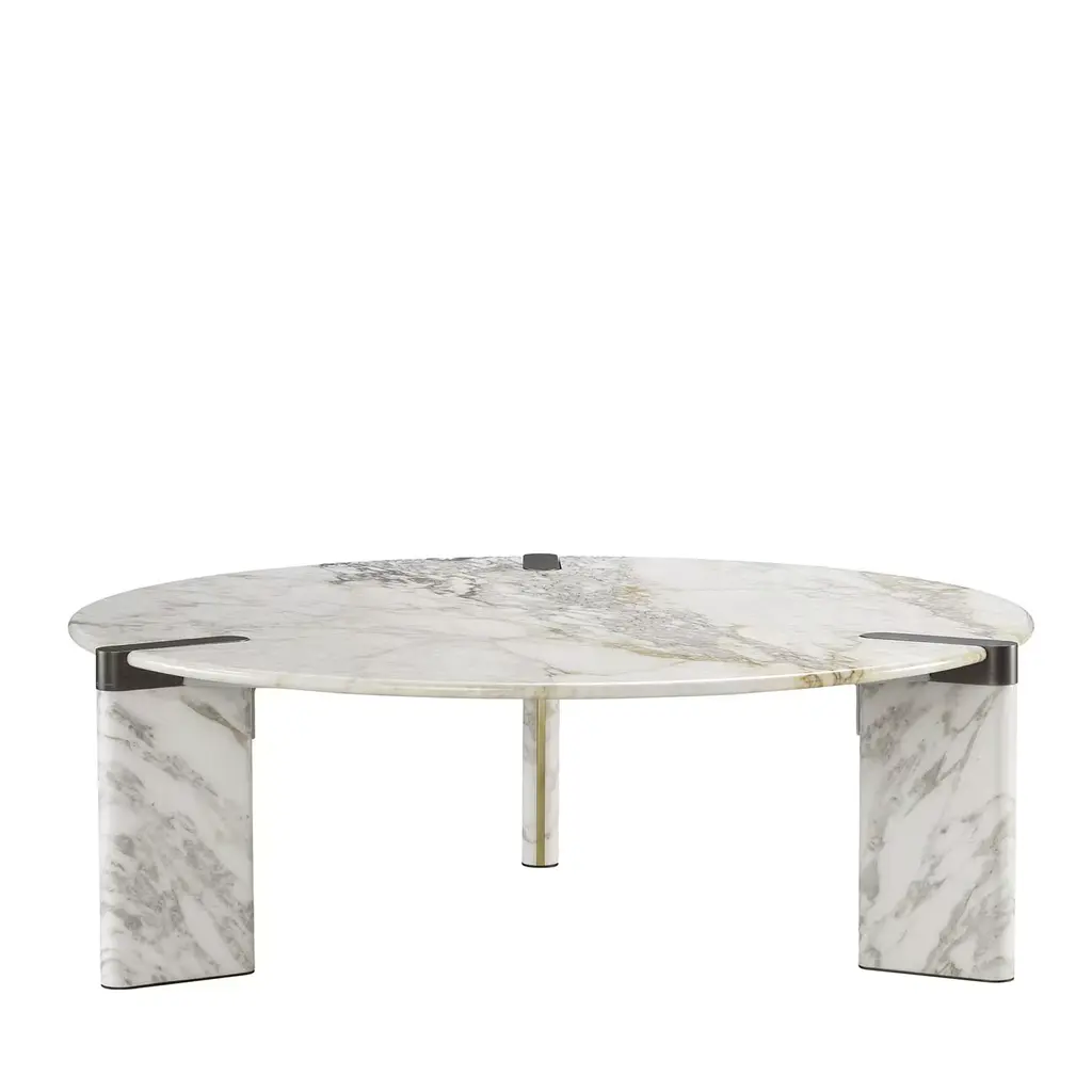 A refined and polished design by Lorenza Bozzoli, this coffee table belongs to the Ottanta series, paying tribute to the 1980s. Handmade of white marble enriched with metal details, it is also available in a metal and aluminum fusion version. Please consult the Artemest catalog for further information.