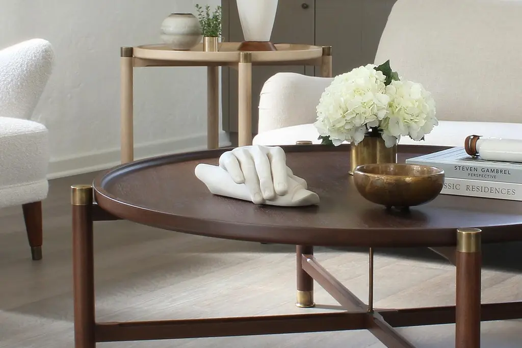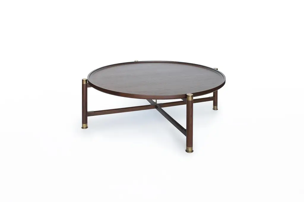Otto Round Coffee Table In Medium Walnut With Antique Brass Fittings