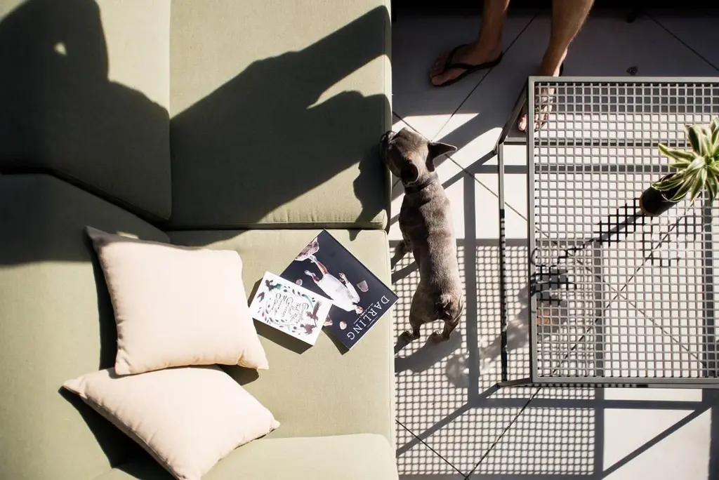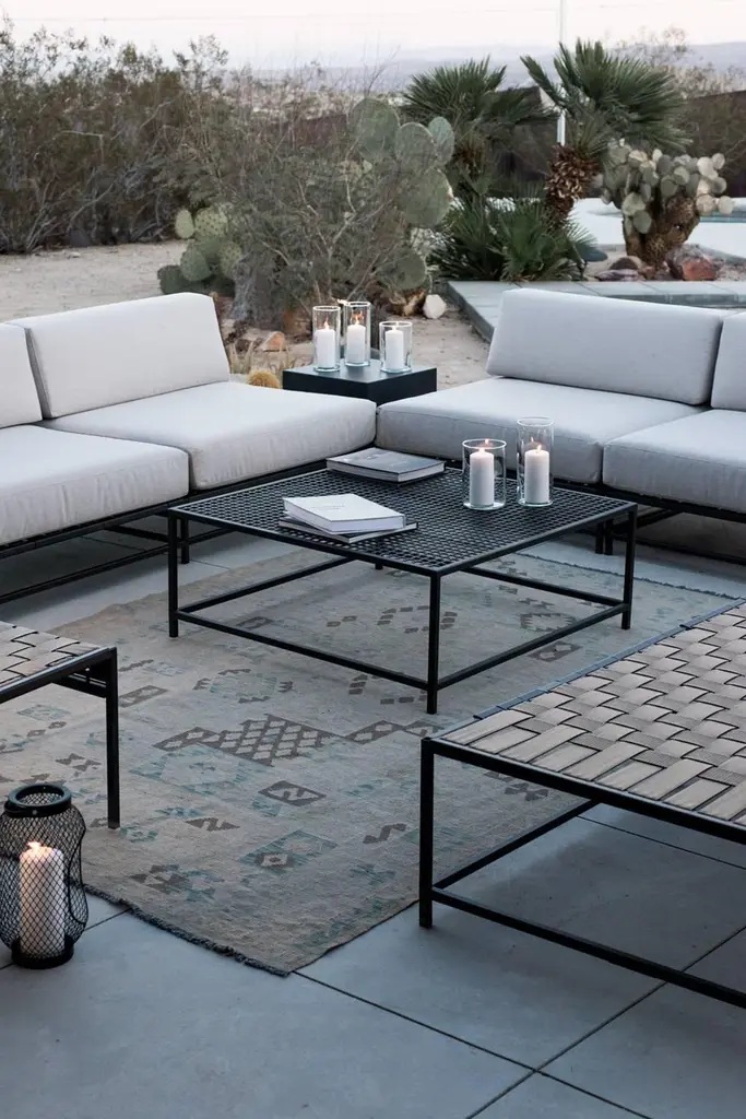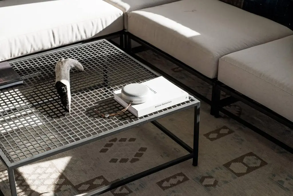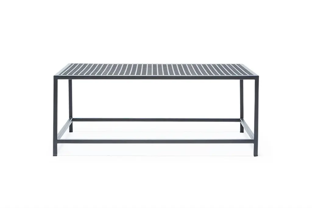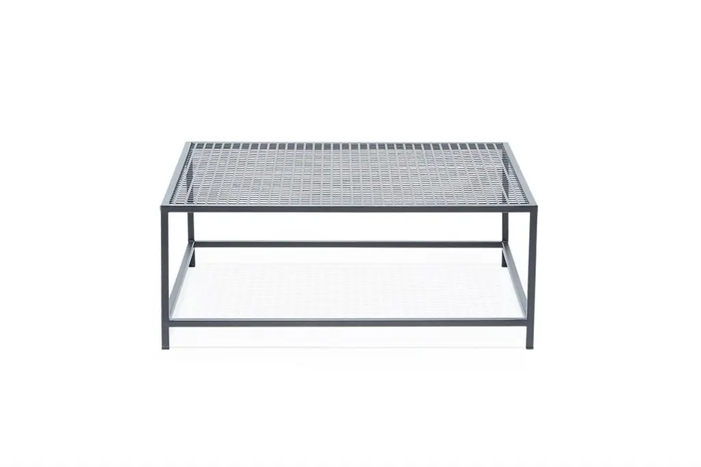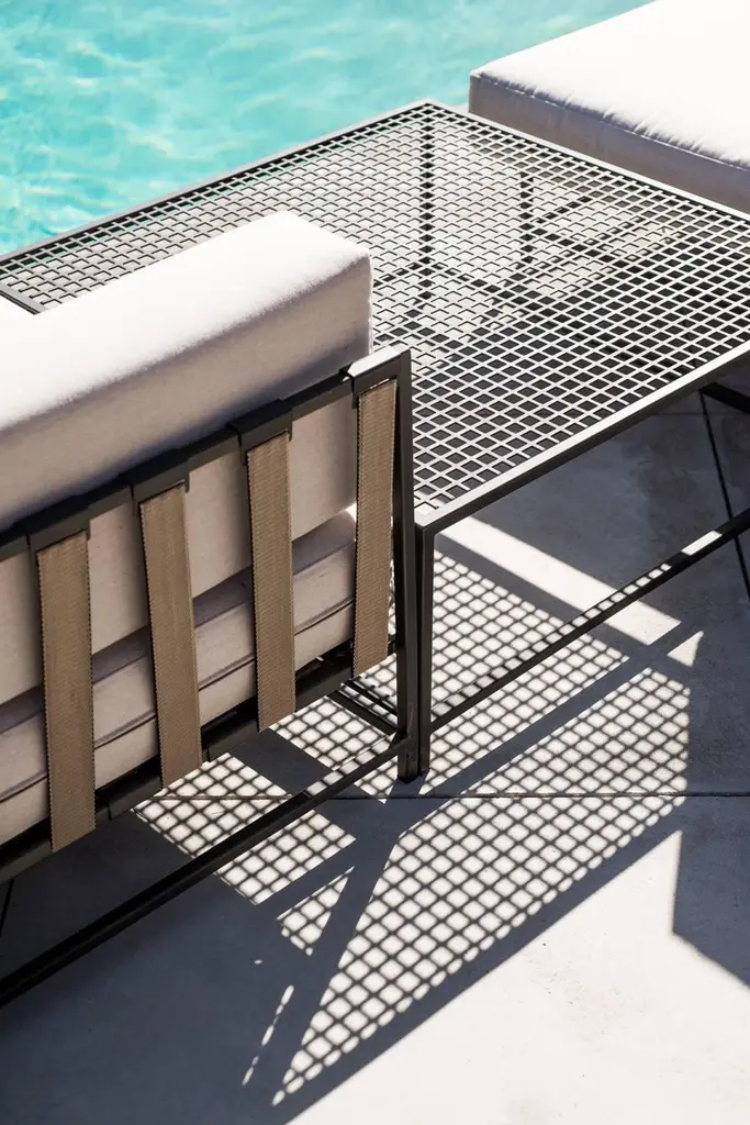 Inspired by weekend visits to the stark desert landscapes found a few hours east of Los Angeles, the Stephen Kenn Outdoor Collection is composed of steel frames that have been zinc primed and powder coated for rust resistance, interwoven stretch webbing for a soft and springy seating experience, and UV and weather resistant Sunbrella Heritage fabric. Custom dimensions, materials, and finishes are available. The perforated steel-topped coffee table can be used on its own or as part of our Modular Sectional.This item is made to order in Los Angeles.