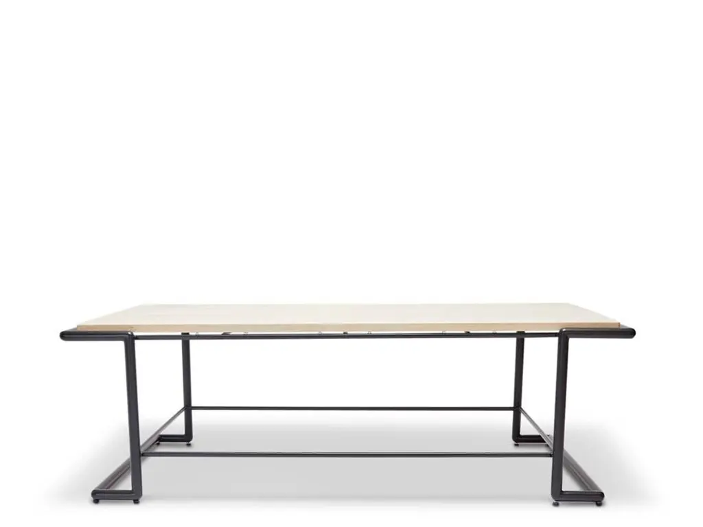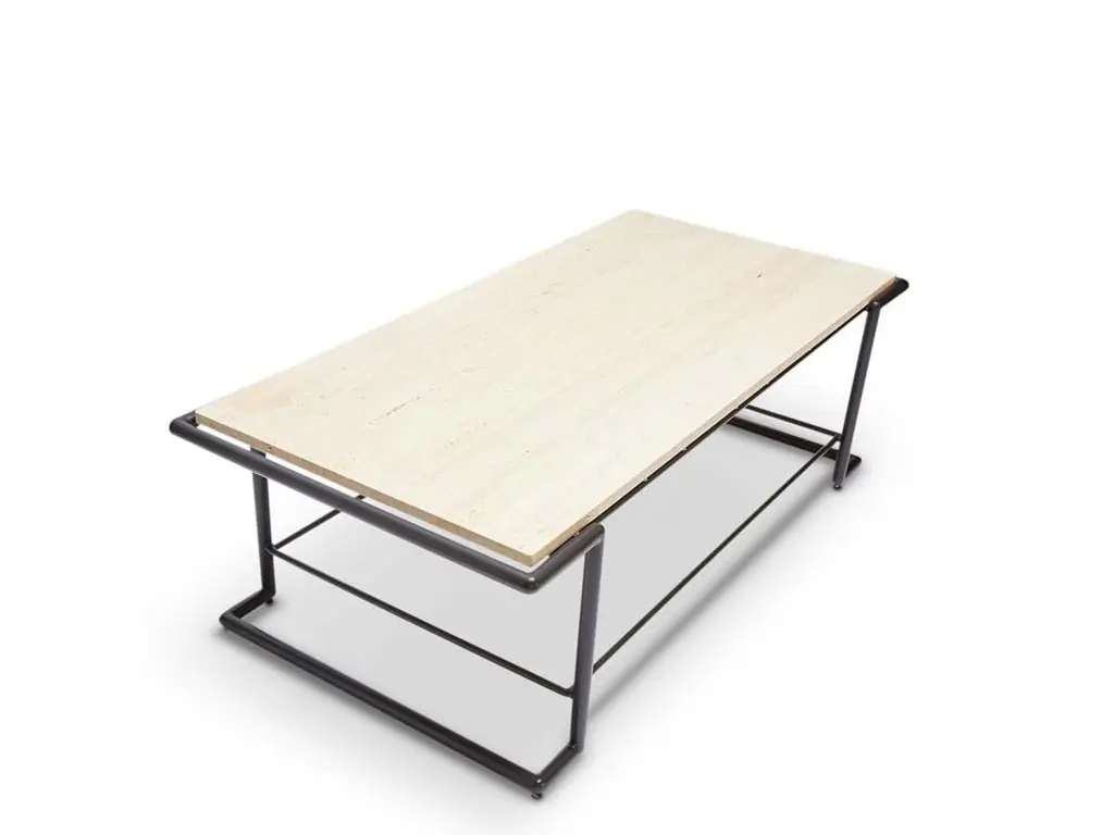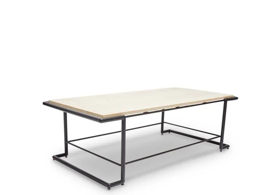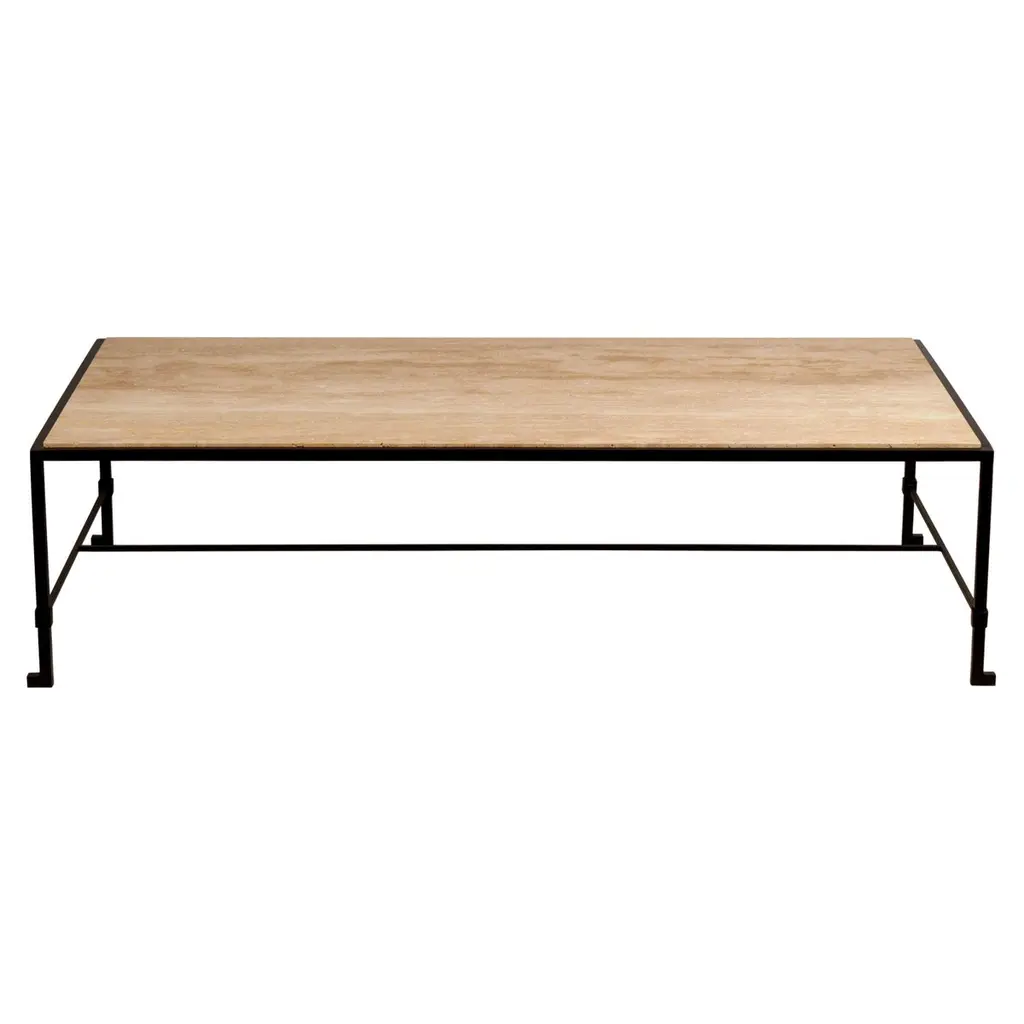 The Hinterland Coffee Table features a powder coated iron tube base and choice of 3 different tops; teak slat, stone, or a cast tempered glass with a corduroy pattern. The Lawson-Fenning Collection is designed and handmade in Los Angeles, California. Reach out to discover what options are currently in stock.