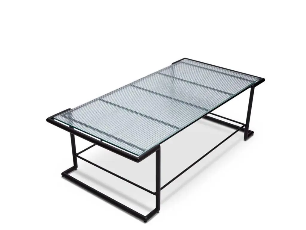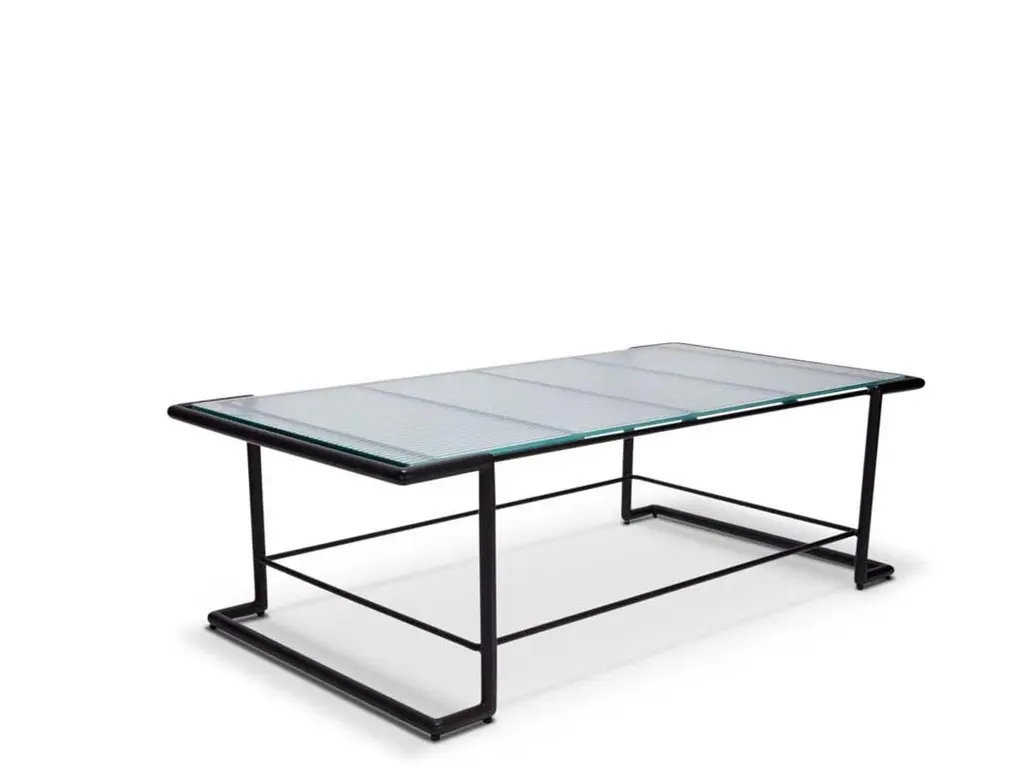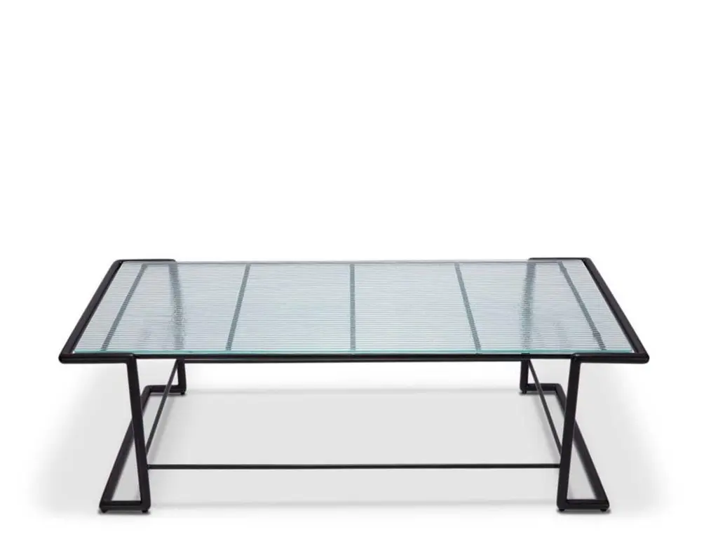 The Hinterland Coffee Table features a powder coated iron tube base and choice of 3 different tops; teak slat, stone, or a cast tempered glass with a corduroy pattern. The Lawson-Fenning Collection is designed and handmade in Los Angeles, California. Reach out to discover what options are currently in stock.