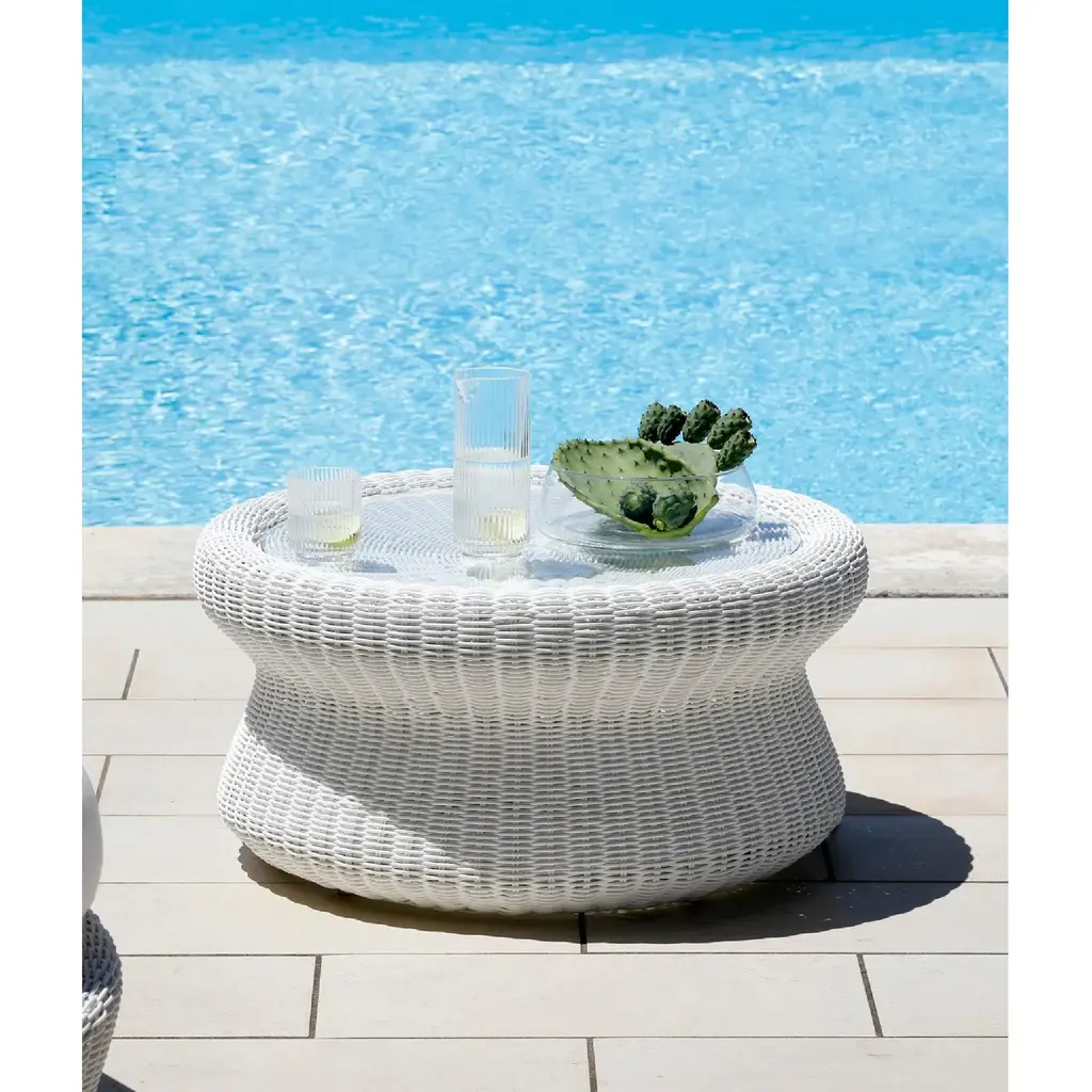 Experience luxury and sophistication with the Outdoor Low Round Coffee Table from Unopiu Agorà. Featuring hand-woven WaProLace® tropical brown or white synthetic WaProLace , this aluminum table boasts sinuous and enveloping shapes, perfect for any outdoor setting. Elevate your space with the Agorà line's elegant and versatile design.