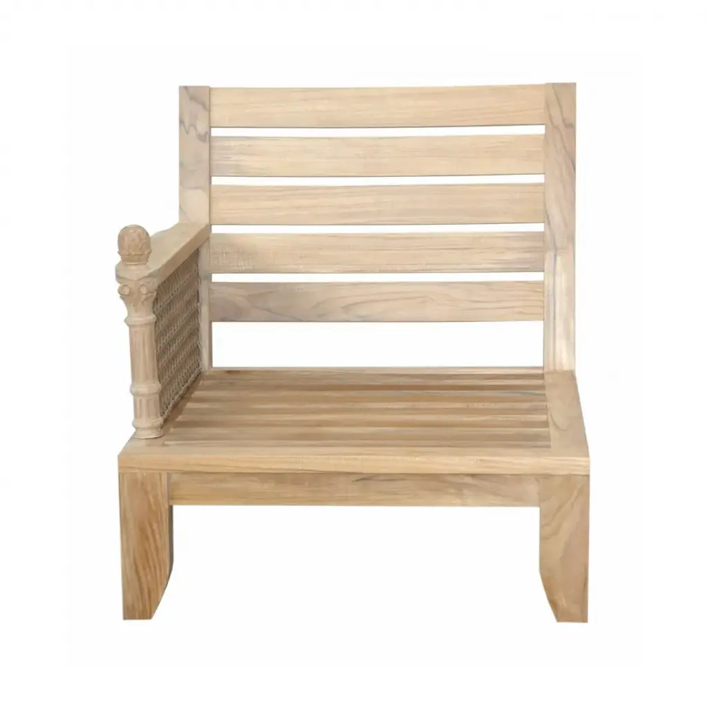 The Luxe Right Modular exhibits classic elegance with intricate detailing that provides deep seating comfort in the luxury of the outdoors. Made of synthetic rattan, the sides of the armchair are intricately designed culminating with a pineapple floral motif that’s handcrafted from our expert craftsman of teak wood. Add an ottoman footrest, a coffee table, and additional chairs from the Luxe Modular Set for a complete deep seating set. Includes Sunbrella All-Weather cushions 27” deep and 6” thick from a variety of fabric pattern and color options available. Built from genuine Grade-A Teak sanded smooth without finish, it is the perfect chair for the outdoors.