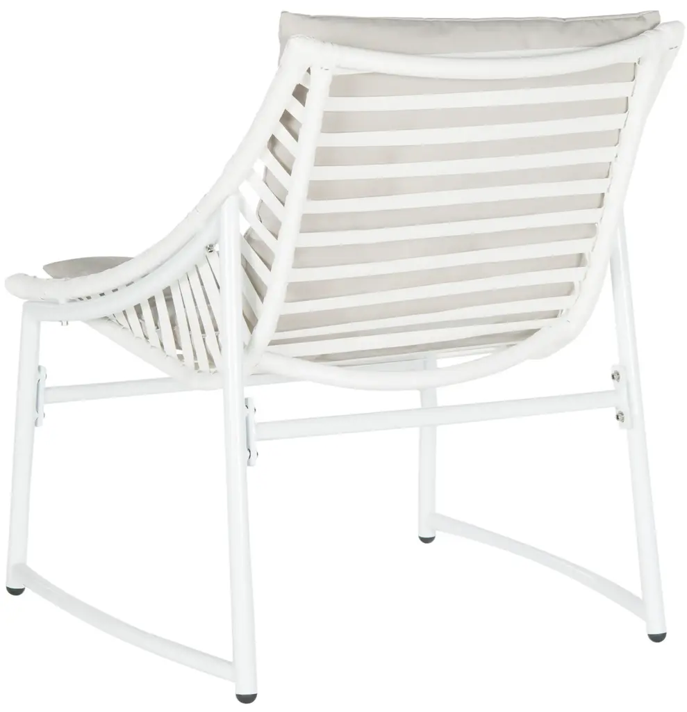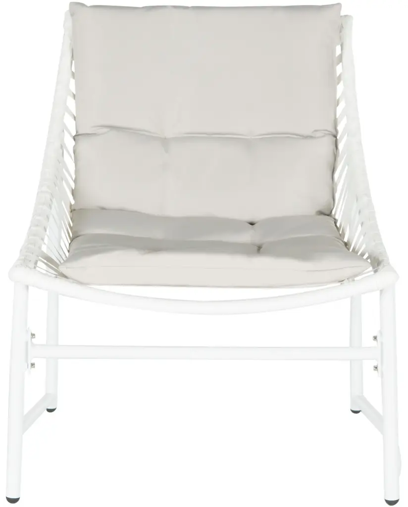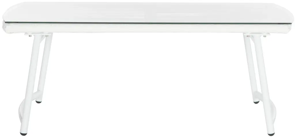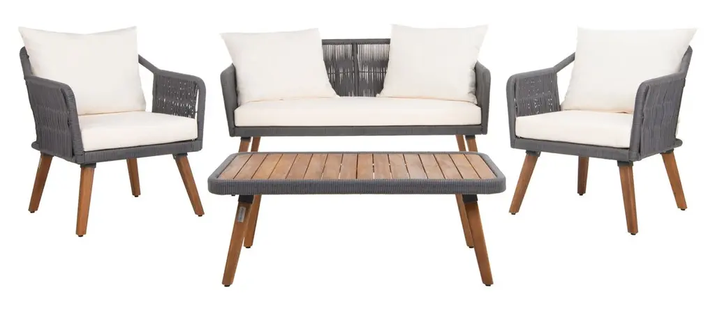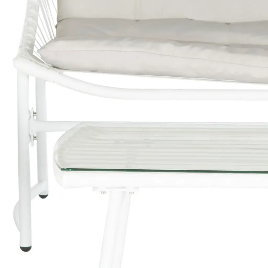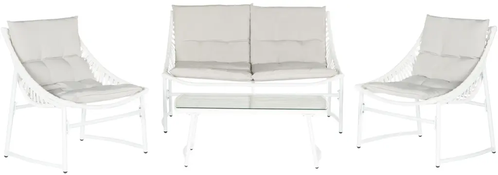 Raise the style quotient of your patio with the 4-piece white rattan outdoor furniture set with grey all-weather cushions. A contemporary strap effect on seating of powder coated aluminum inspired the design of the coordinating coffee table. Store outdoor furniture indoors or cover well when not in use. Remove wooden furniture from standing water. Dust regularly with small brush or vacuum. Spills should be taken care of immediately before they harden or stain with a slightly dampened sponge. Do not use bleach solutions. Some assembly required. Individual Dimensions: CHAIR (2): 28.3 x 26.4 x 29.9 BENCH (1): 28.3 x 50 x 29.9 TABLE (1): 18.1 x 36.2 x 13.8