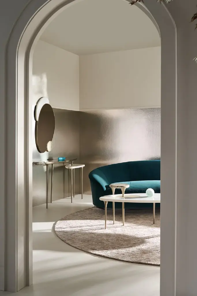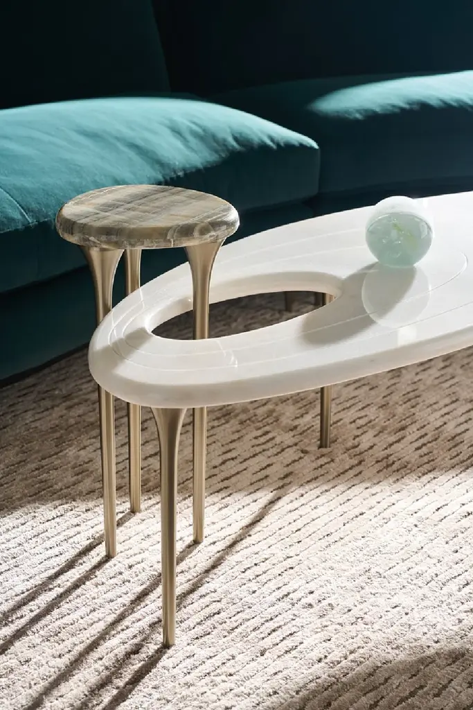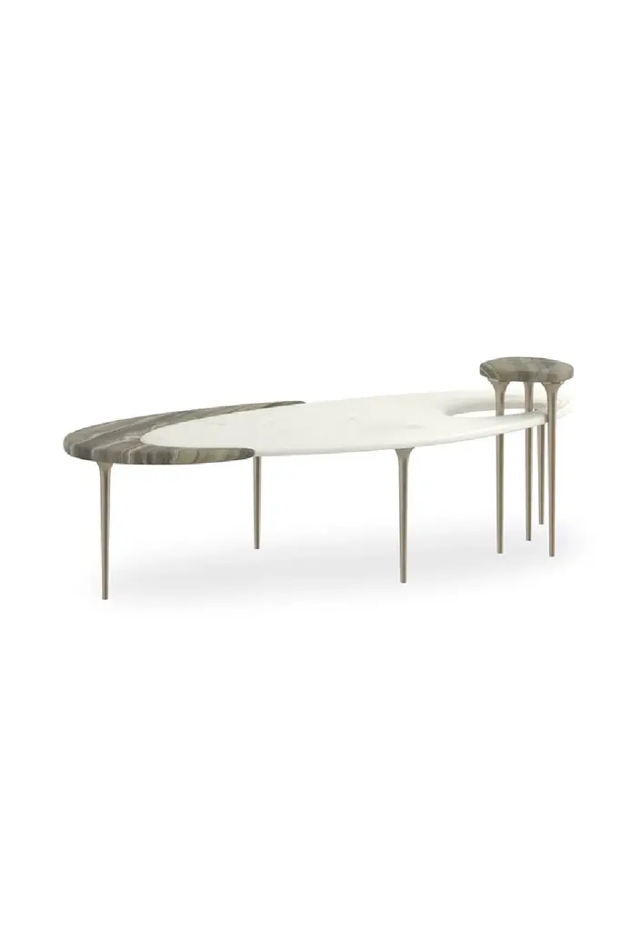 The Resonance Cocktail Table is inspired by the “Butterfly Effect” in which a small event creates far-reaching effects. This contemporary statement piece features a White marble top, with accent swirls that ripple out from a smaller, offset, elevated Grey Onyx oval marble top to a raised half-moon-shaped Grey Onyx section. Each piece is supported by a metal frame and tapered legs in shimmering Champagne Gold. For the modern collector, this piece is out of this world.