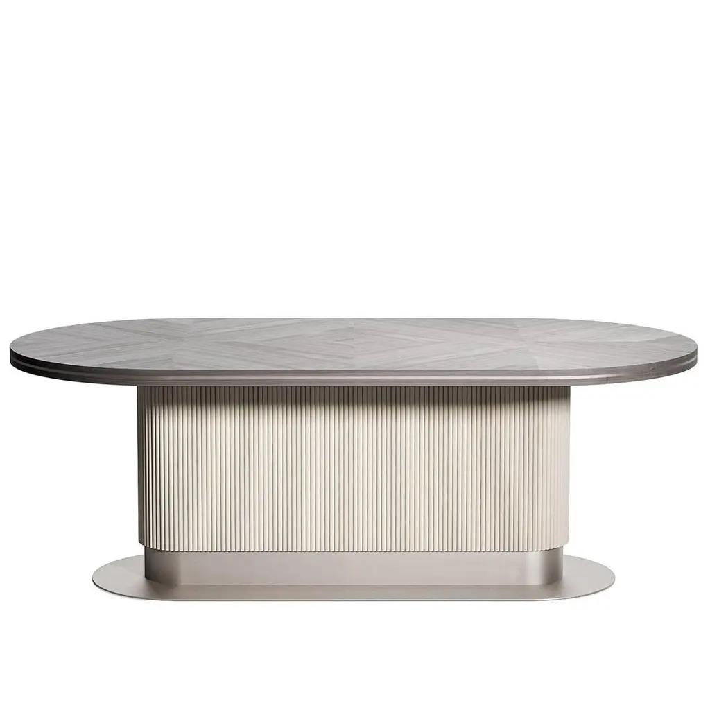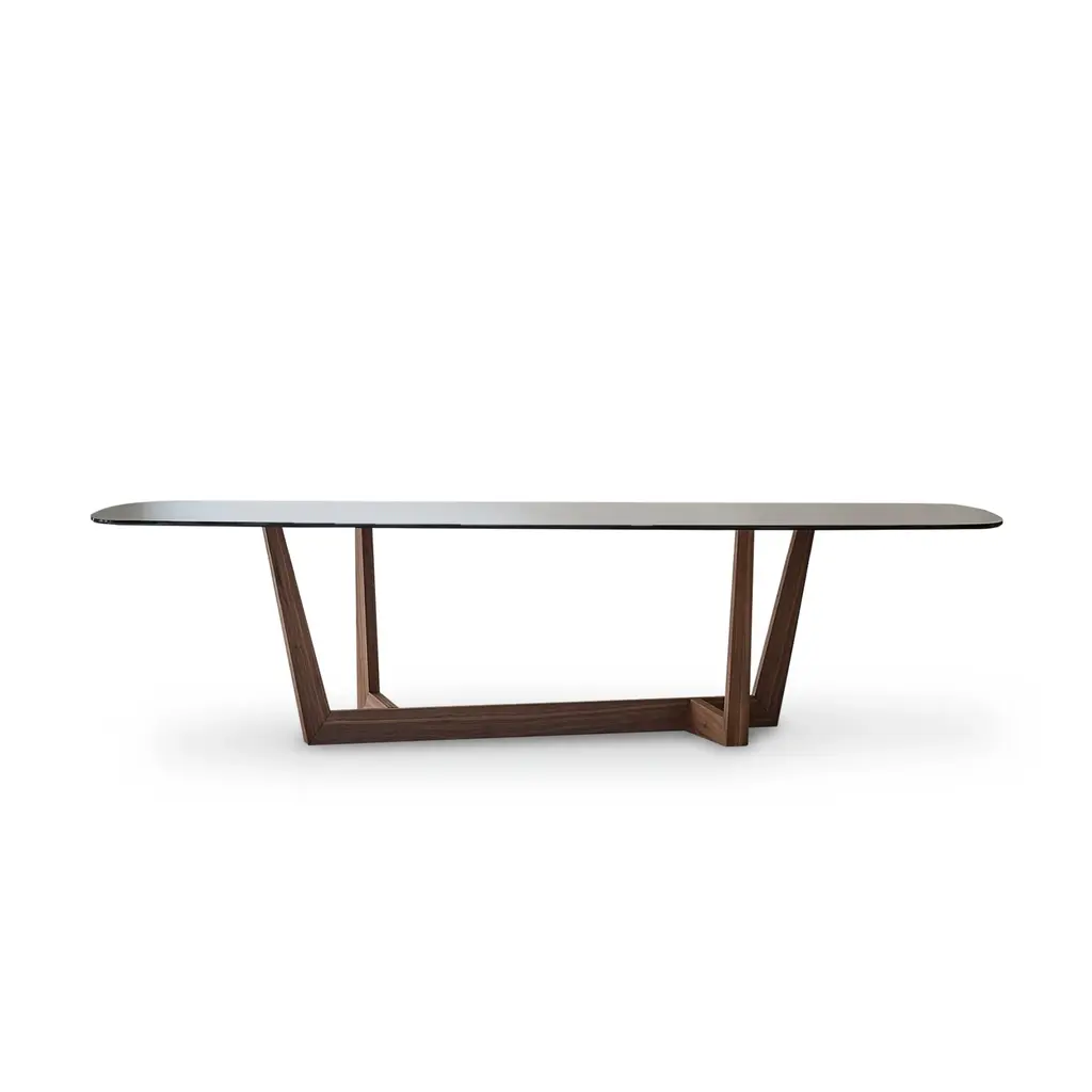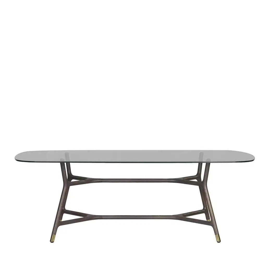 The Ovov coffee table designed by Claudia Fanciullacci is characterized by essential lines and represents the quality and the beauty of authentic minimal design. The base in Corten steel is made of parallelepipeds arranged in a V shape that support and connect the elliptic glass top. The top is also available in other materials.