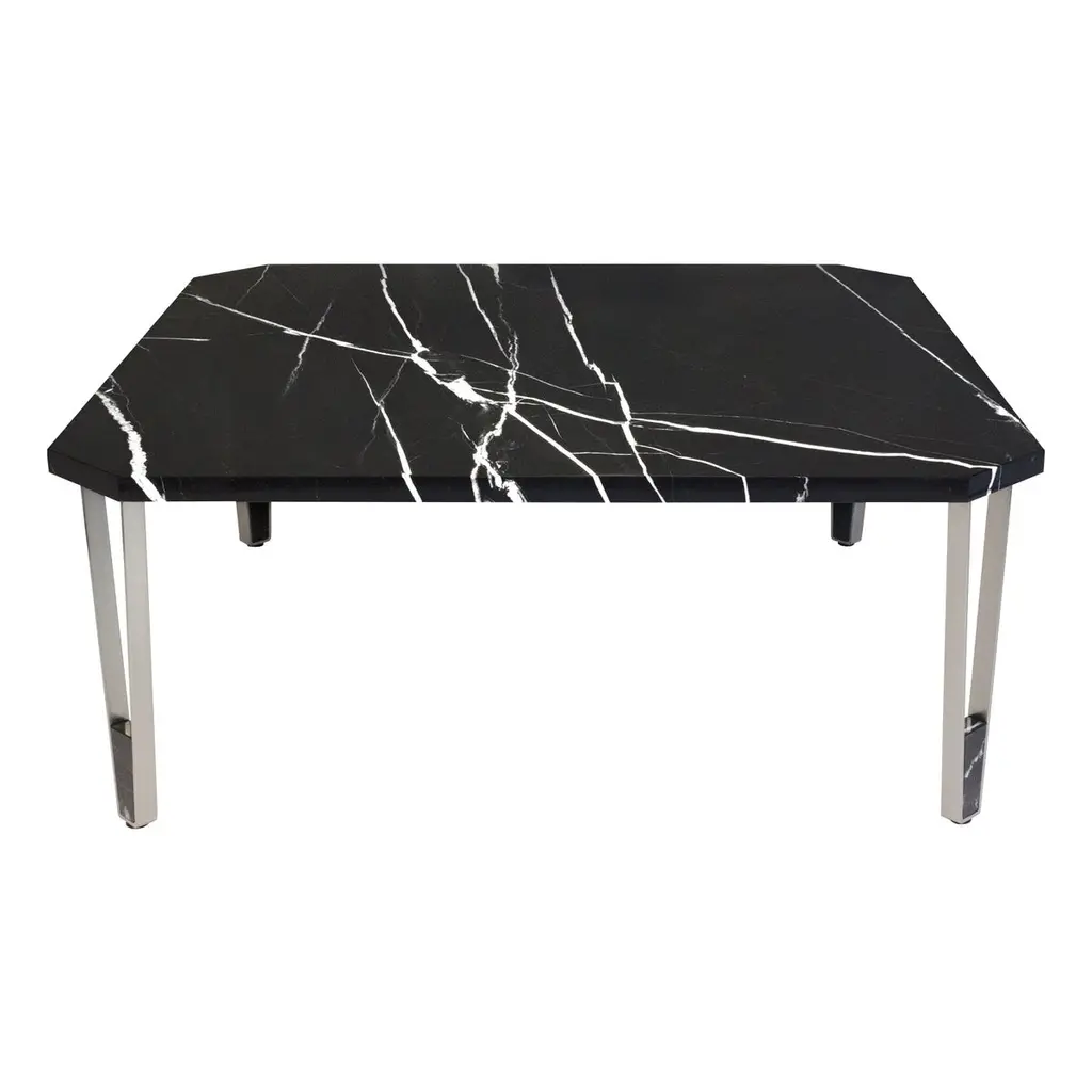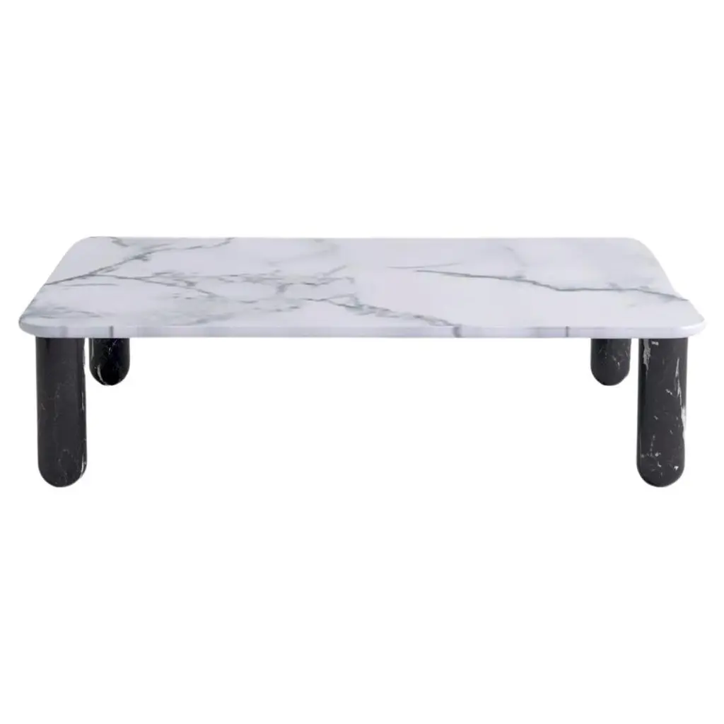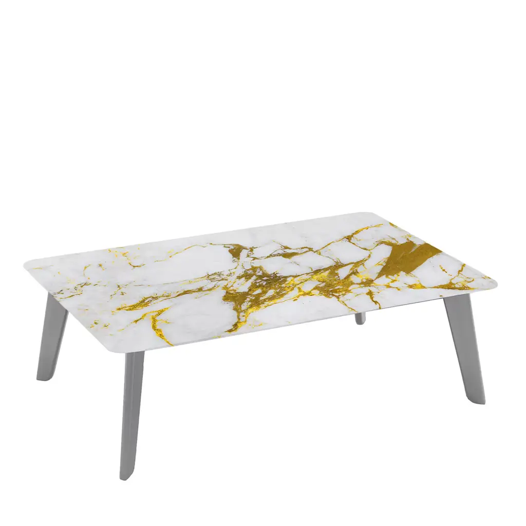 This coffee table will be a magnificent accent of plush sophistication and clean design to both commercial or residential interiors of modern inspiration. The piece is defined by a mesmerizing glass top that looks as if it's marble, a unique material by Sicis fashioned of Vetrite that combines glass slabs made of special polymers that recreates marble veins. The piece rests on wooden legs, lacquered in satin-black metal finish also available in a polished version.