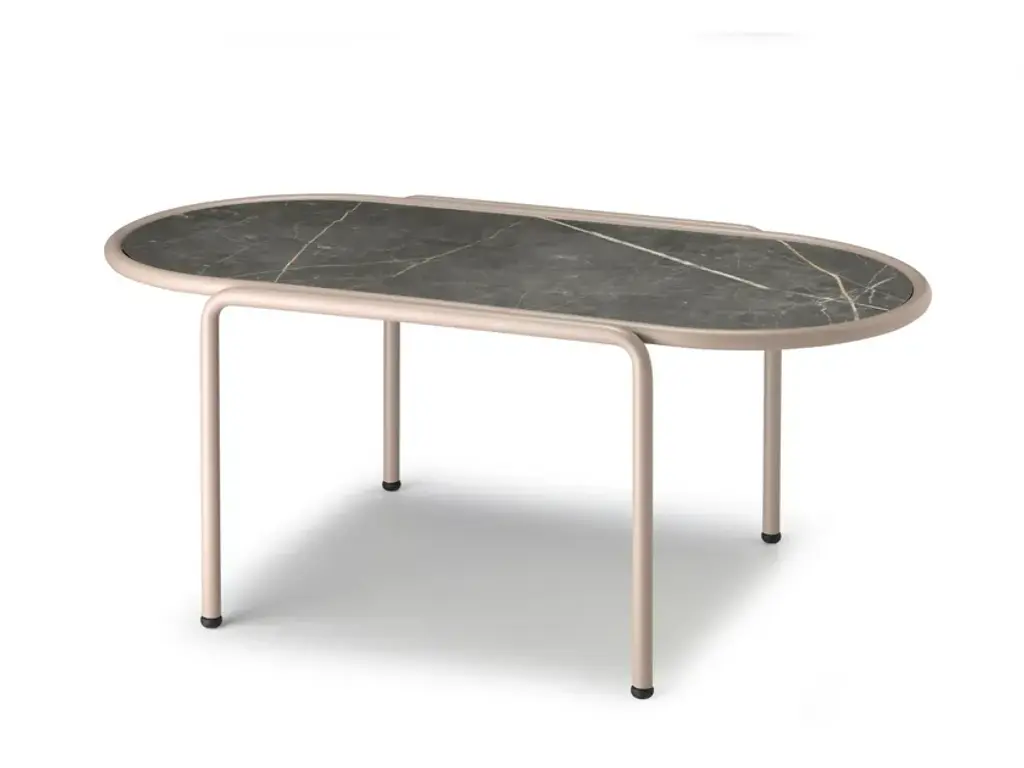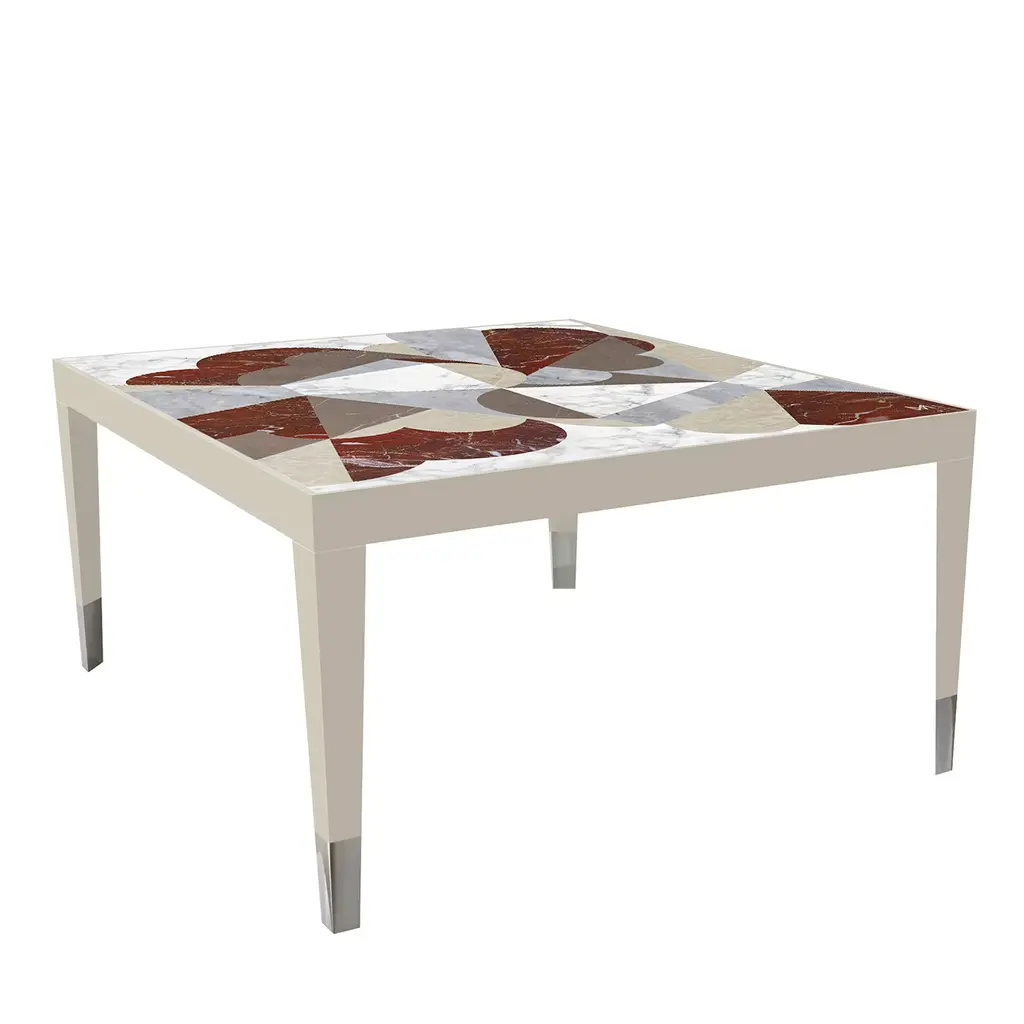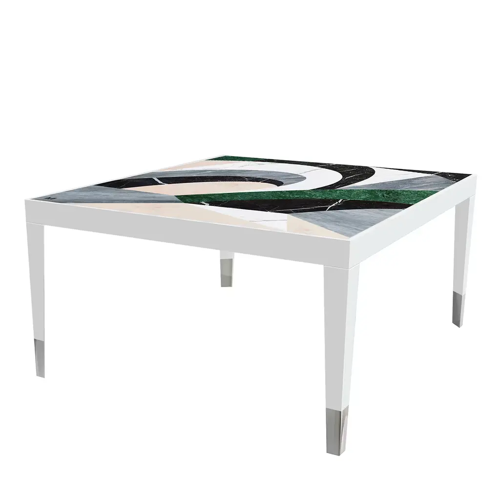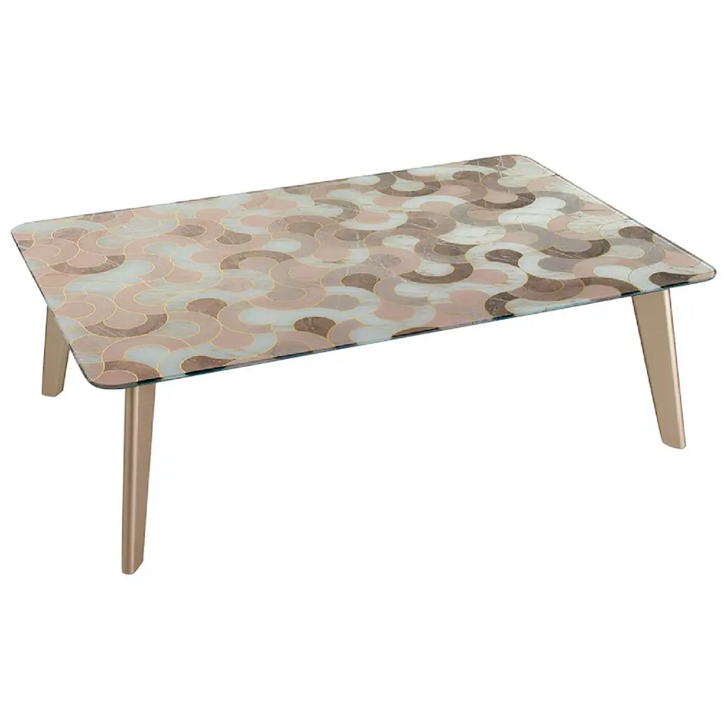 A striking object that combines art and design, aesthetic and functionality, this coffee table will stand out in a modern private or contract interior alike. Resting on wooden legs finished with a satin bronze metal lacquer, it boasts an eye-catching patterned top entirely fashioned of Vetrite, a material created by Sicis, combining different glass slabs made of special polymers. Available in a version with polished legs upon request to the Concierge.