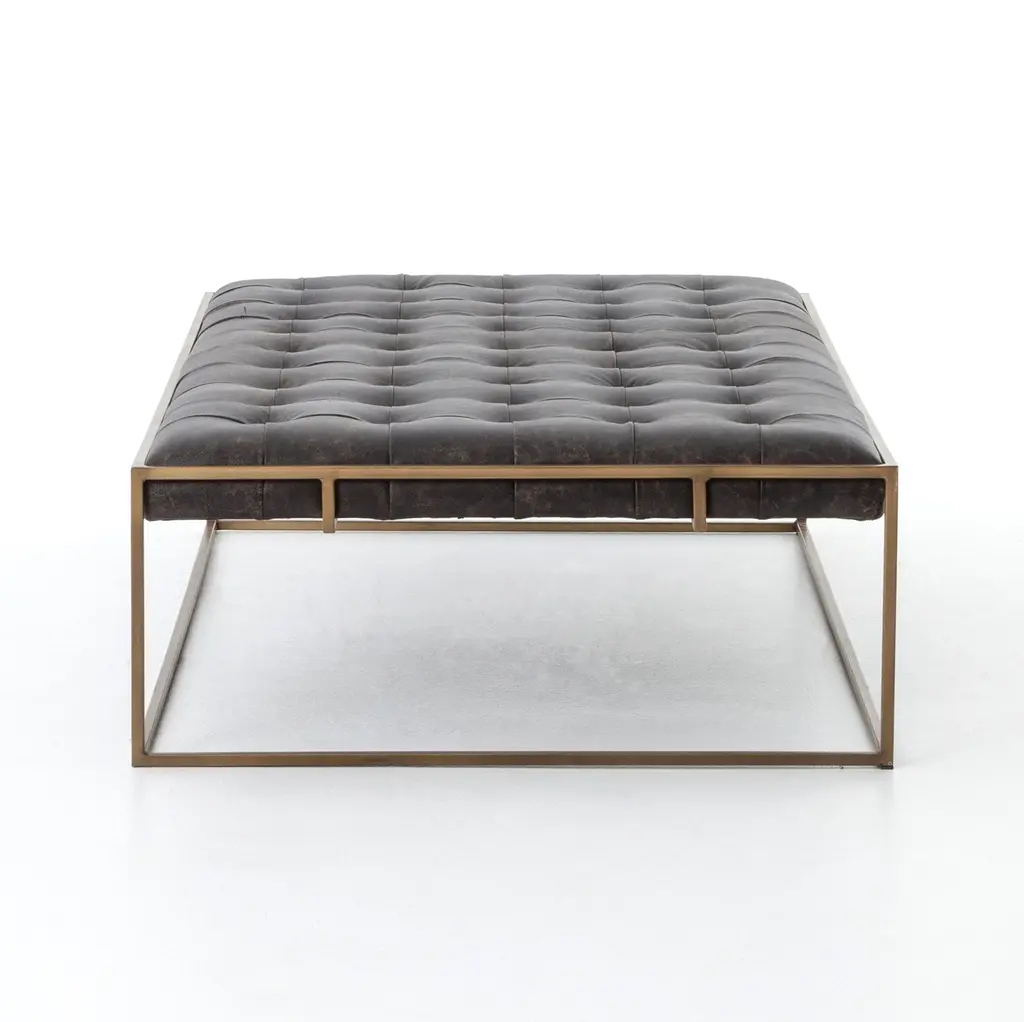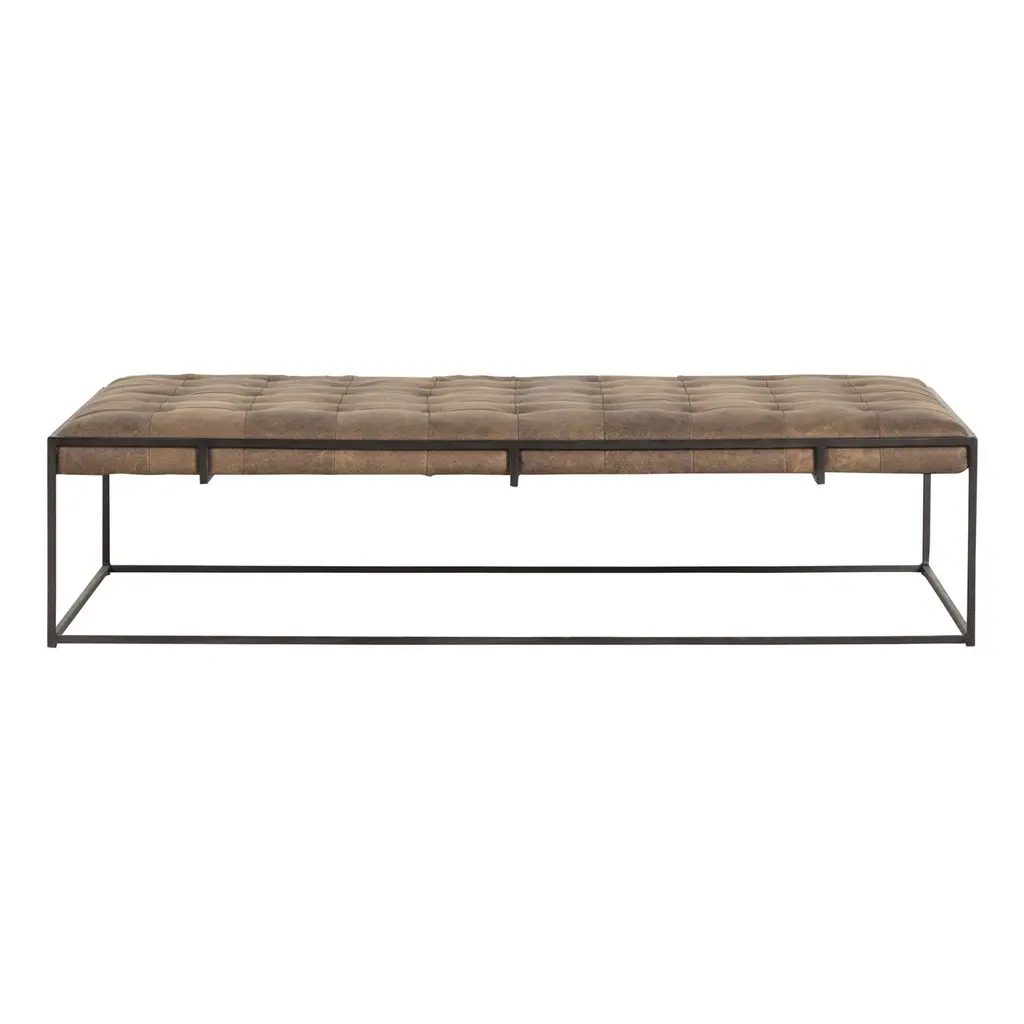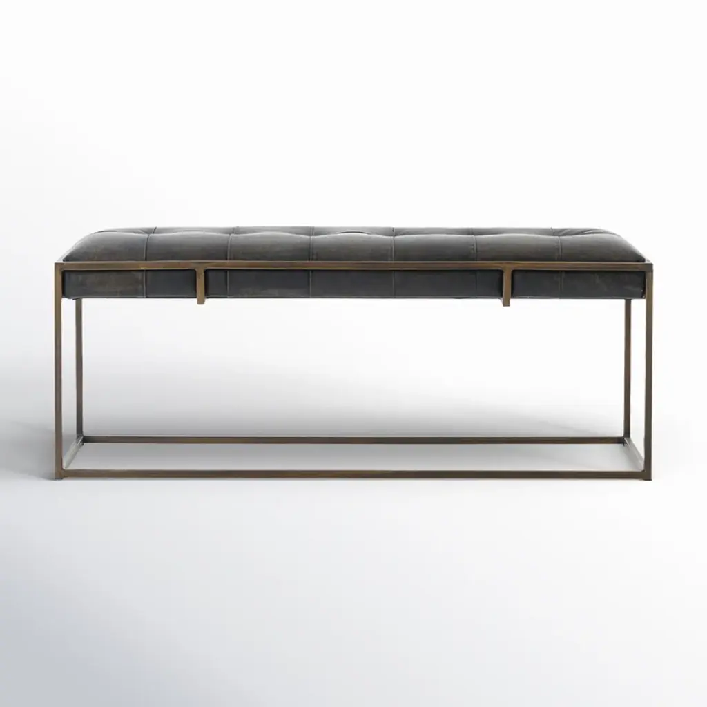 Traditional library style meets modern sensibilities. Blind-tufted top-grain leather in umber grey floats within an iron Parsons base in waxed black with cage-like detailing.