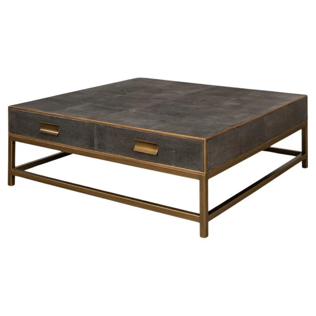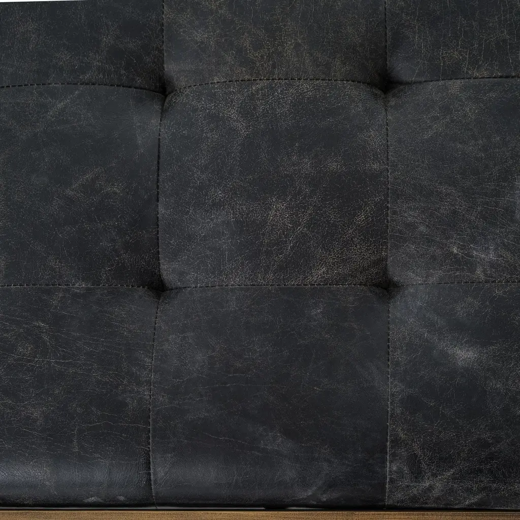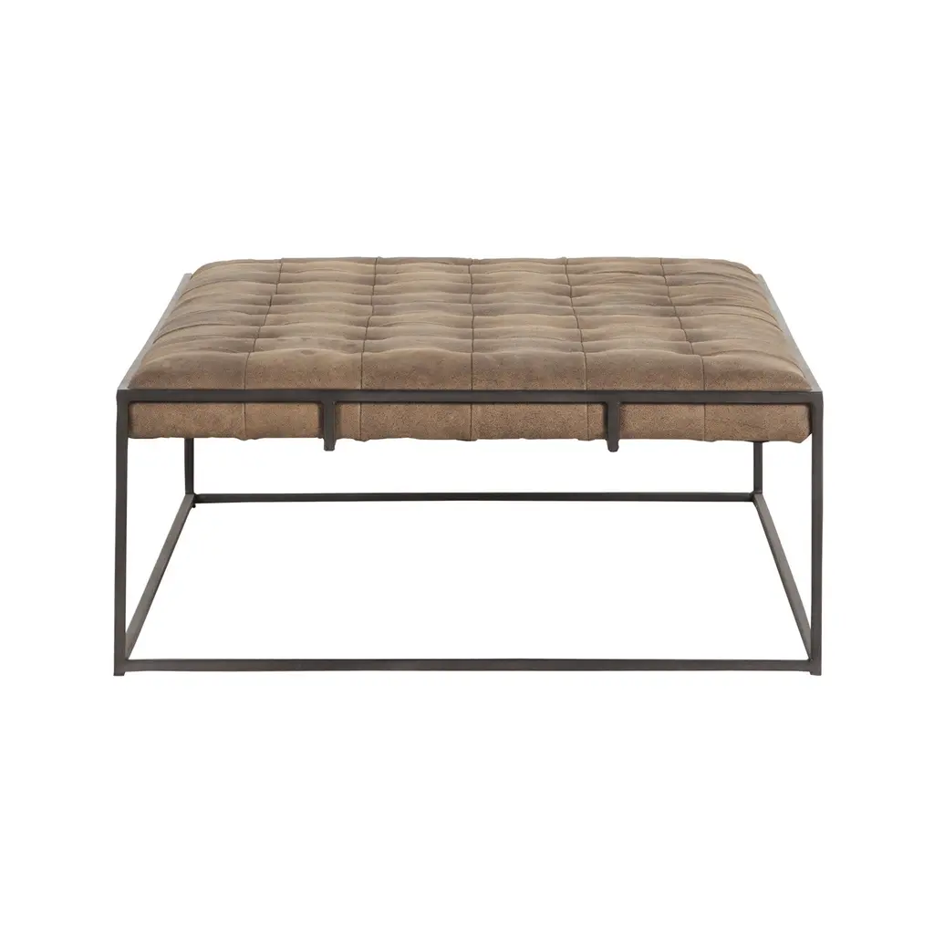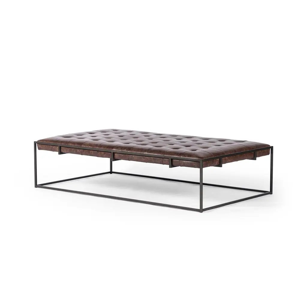 Traditional library style meets modern sensibilities. Blind-tufted top-grain leather in umber grey floats within an iron Parsons base in waxed black with cage-like detailing.