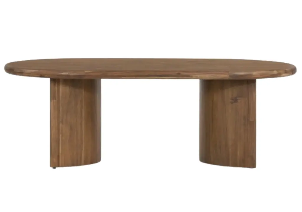 The Paden features an oval top complemented by crescent-shaped legs, creating a beautifully curved silhouette. Crafted from durable Acacia wood, distinct and organic wood grains adorn the piece for added visual texture.