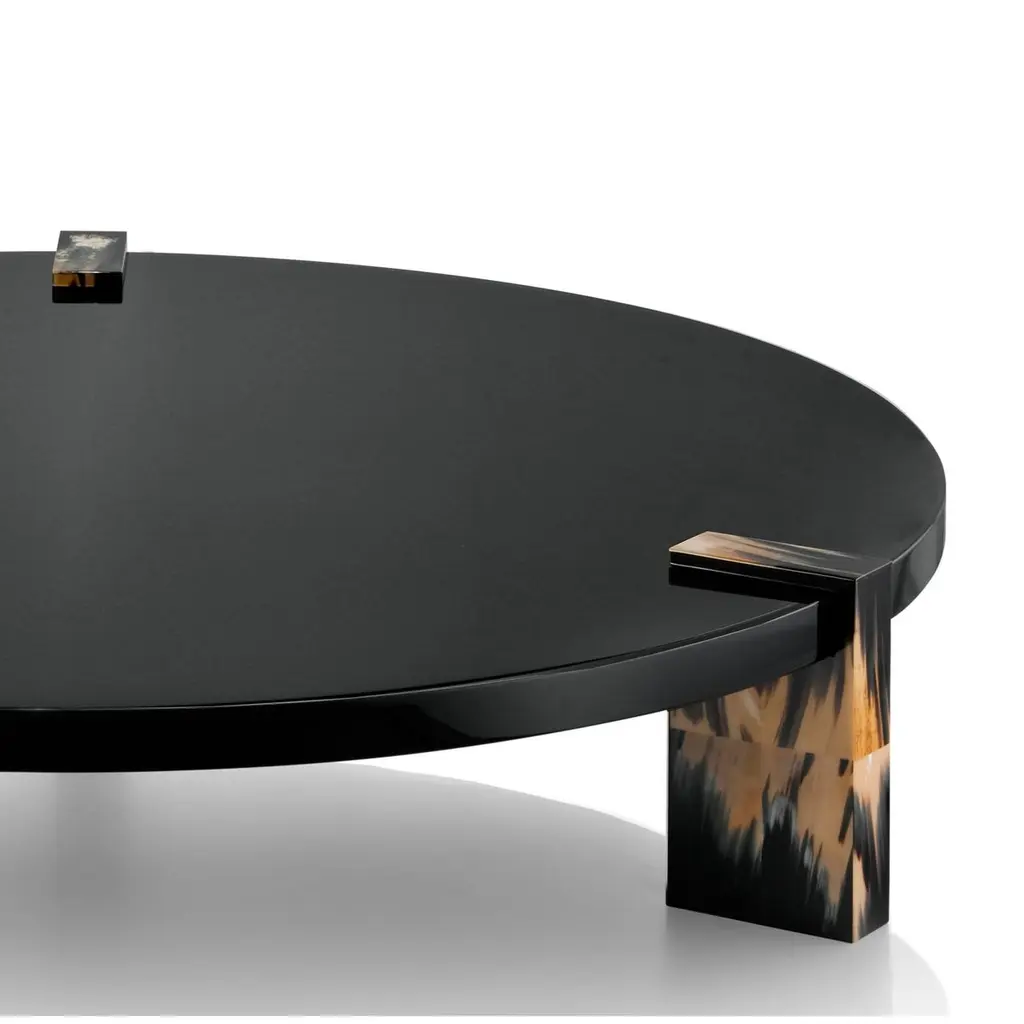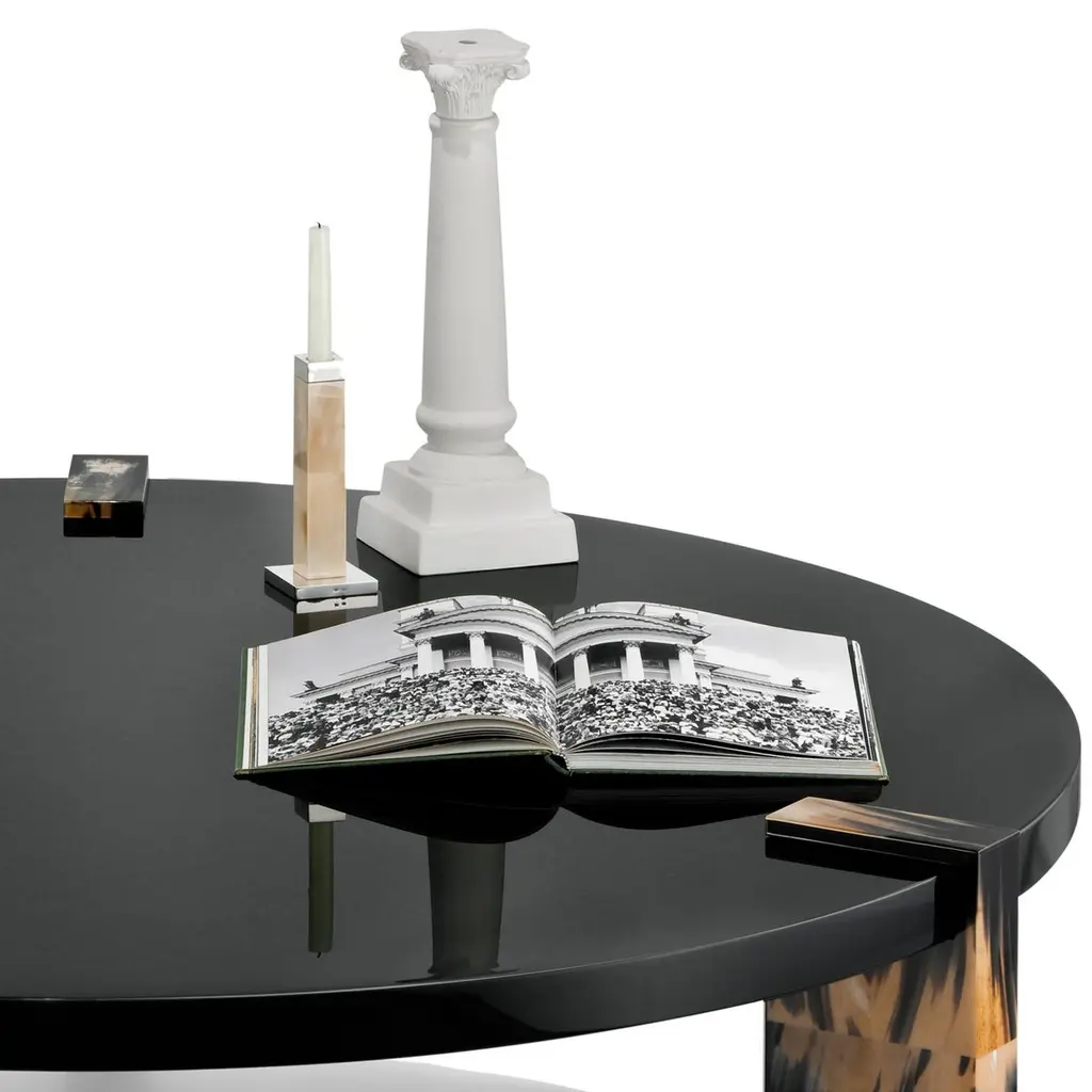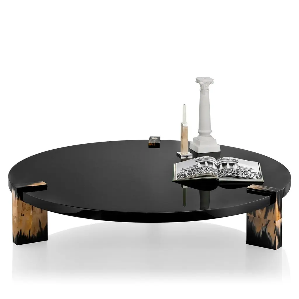 Featuring a round tabletop in wood with lacquered black gloss finish, Paestum coffee table is embellished by three elegant legs in Corno Italiano, whose variegated veining create a striking visual effect drawing attention and attraction to the center of your living space.Note: Colors and shades of Corno Italiano processed by our Company are unique and due to the natural origin of raw material. For this reason Corno Italiano tones that can be seen in pictures are indicative and cannot be reproduced in finished products.